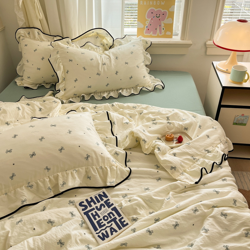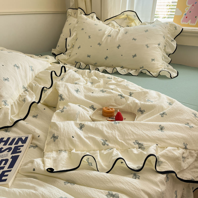 欧尚 2025新款细黑边夏被床单床盖三件套 蓝色蝴蝶结