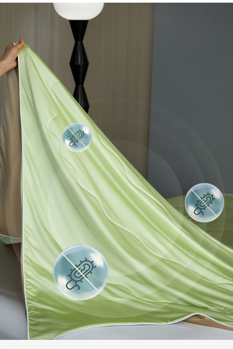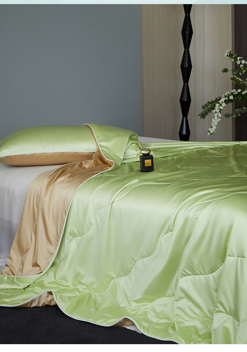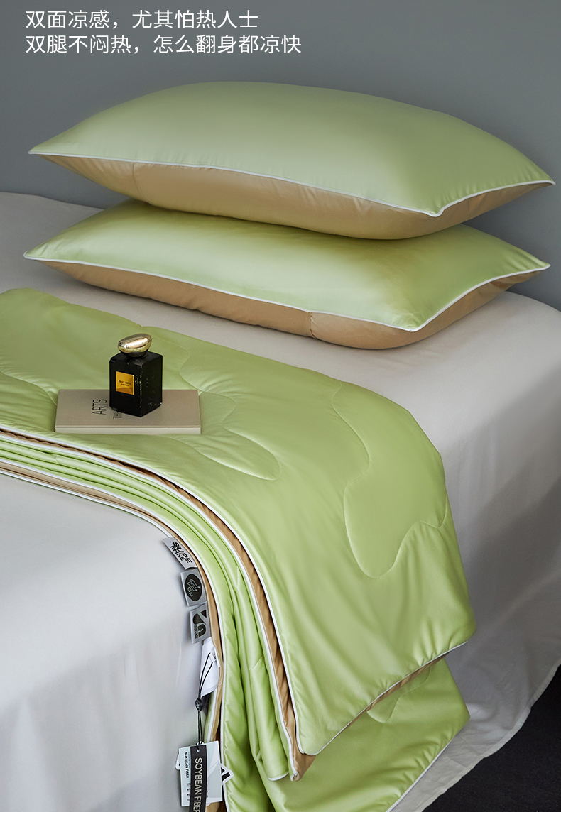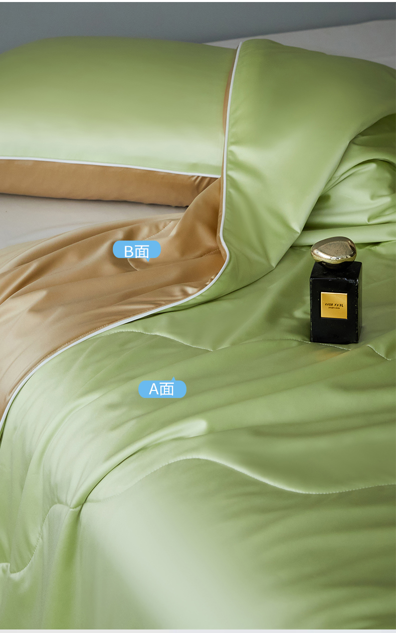 商品名称:头等舱 2025新款水光缎冰肌锦氨A类55植物大豆7A抗菌夏被配礼盒 水光绿配香槟咖