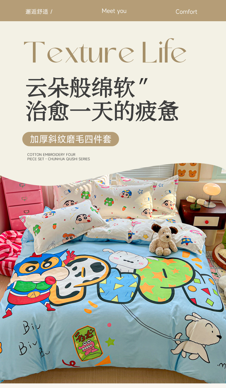 当前位置: 91家纺网 > 商品网购 > 床品套件 > 四件套 > 普通磨毛四件套 > KT猫直营店 2025新款加厚斜纹磨毛大版四件套 字母小新