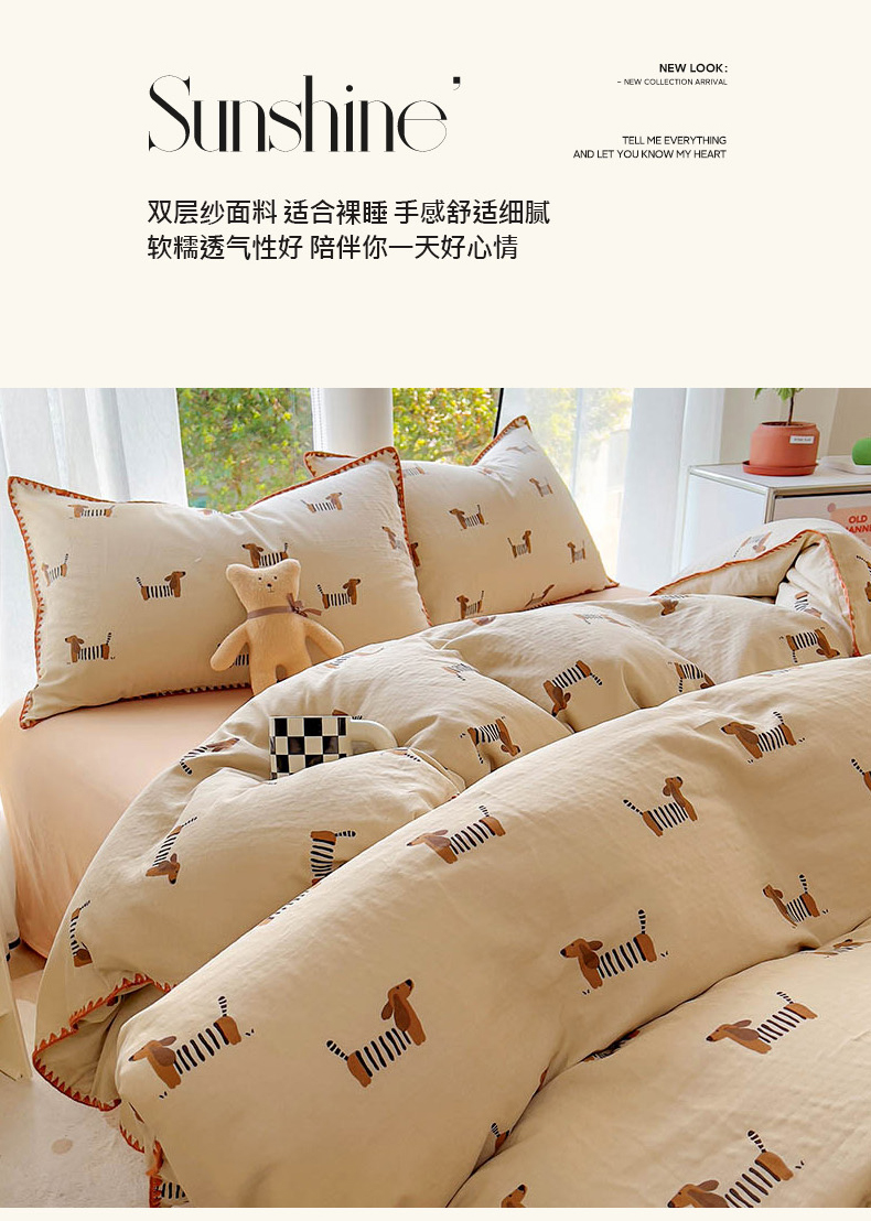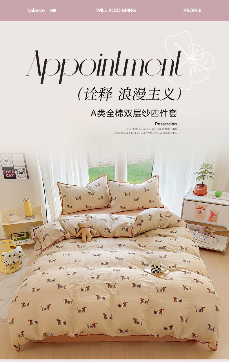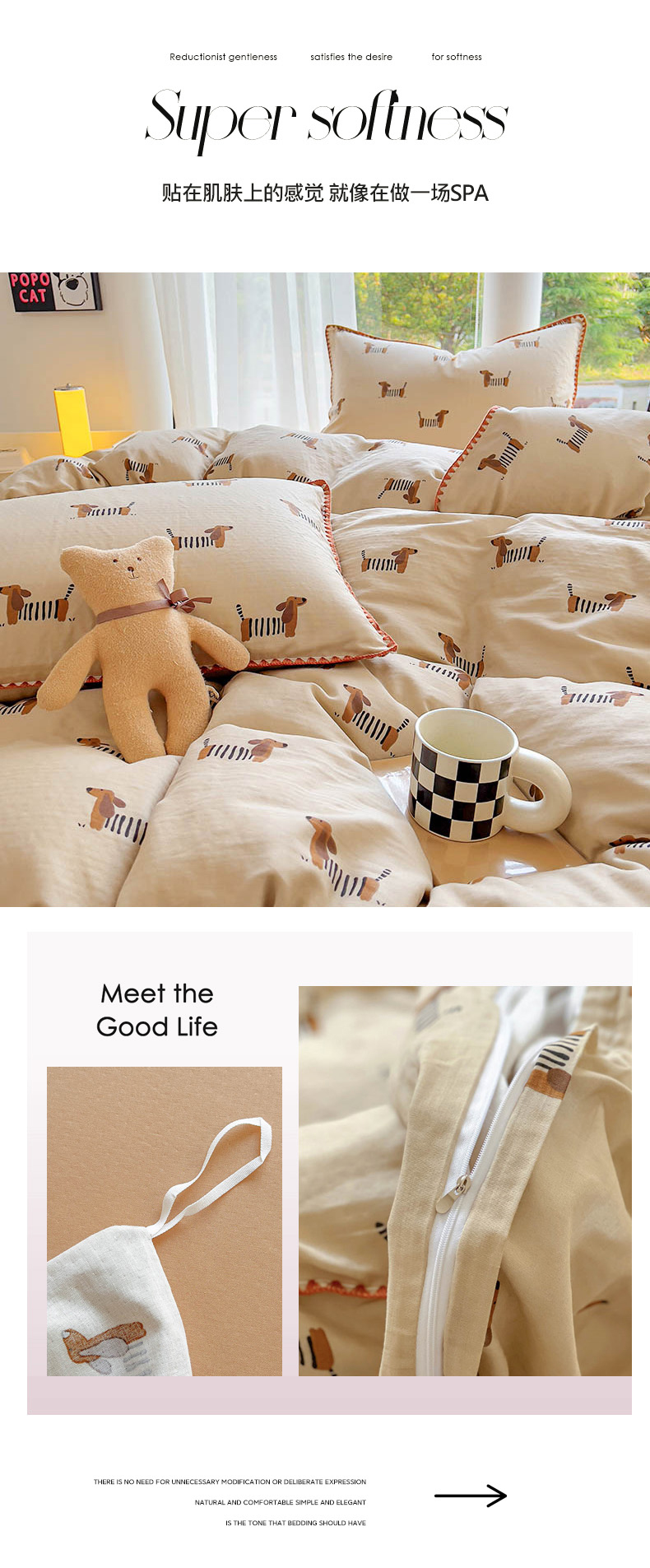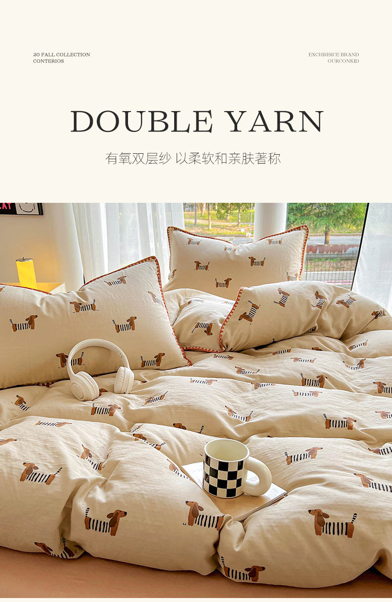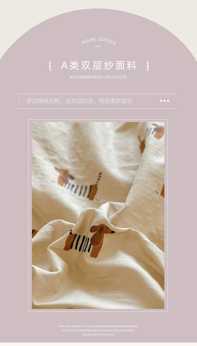 当前位置: 91家纺网 > 商品网购 > 床品套件 > 四件套 > 双层纱四件套 > (提供买家秀 爆款花型 不断货)2025新款A类全棉双层纱四件套 腊肠狗
