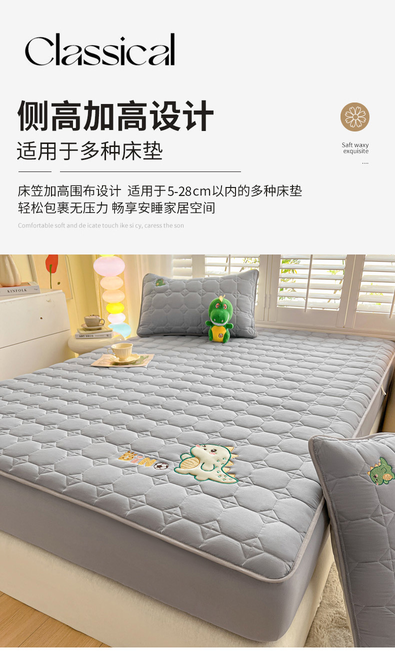 商品名称:万盛家纺 2025新款夹棉恐龙刺绣床笠 恐龙-方格 灰