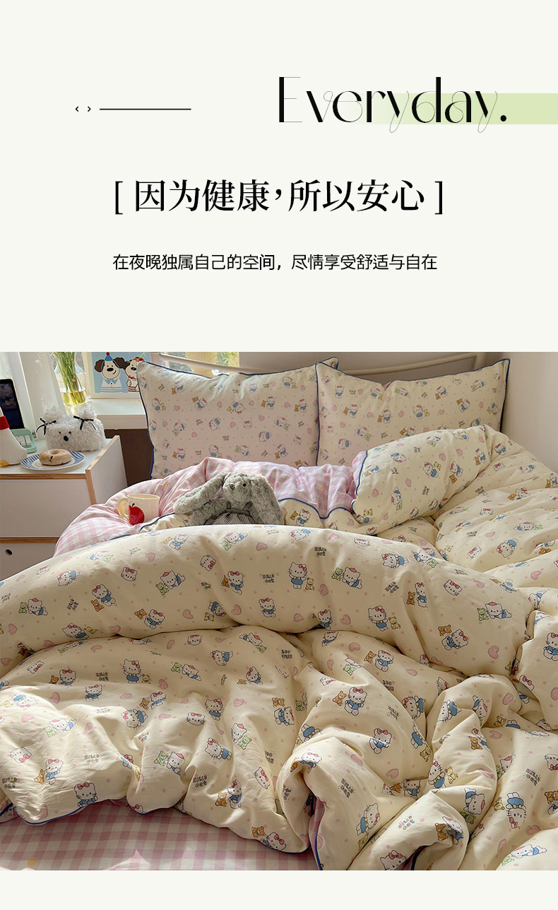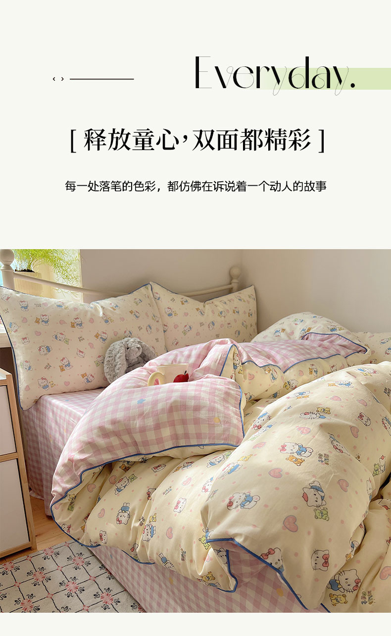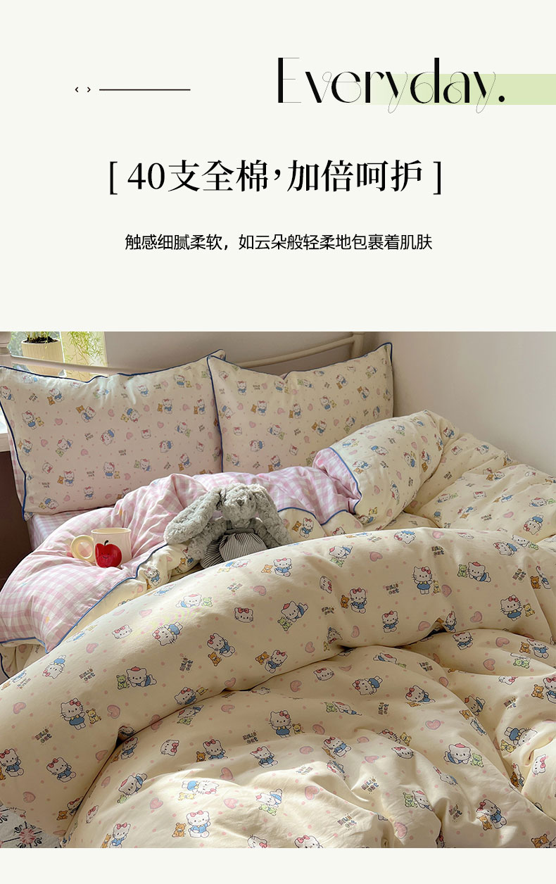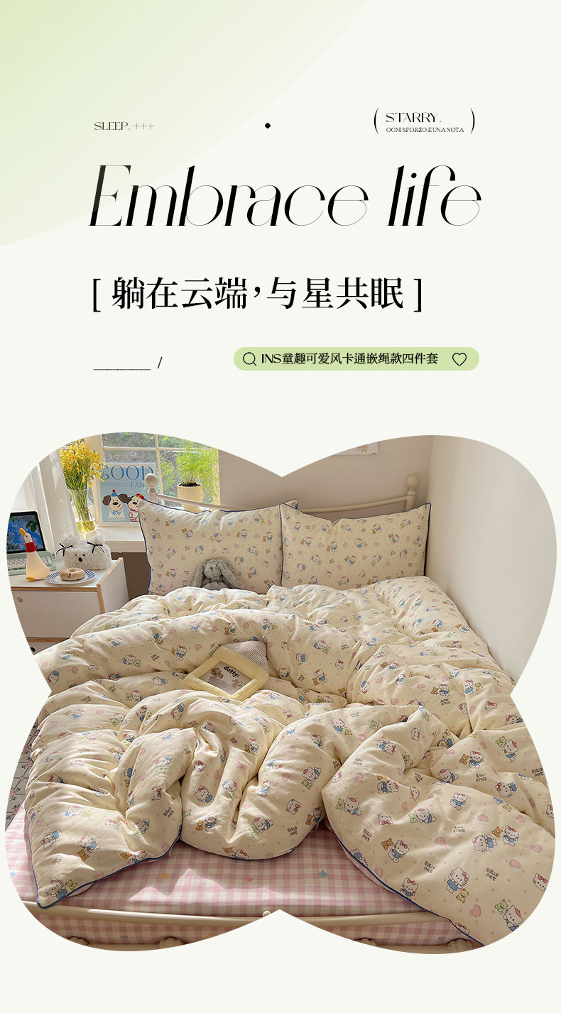 商品名称:六巷胡同 2025新款40S全棉纯棉INS童趣可爱风卡通嵌绳款四件套 嵌绳乖巧哈喽猫