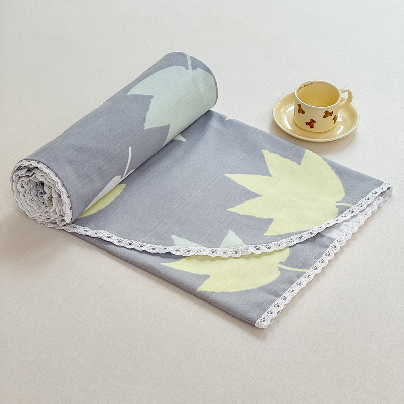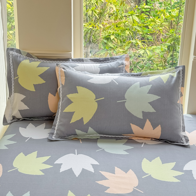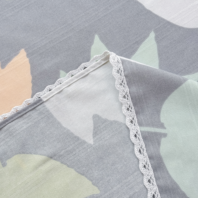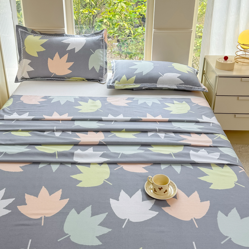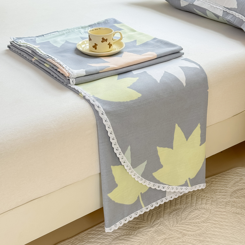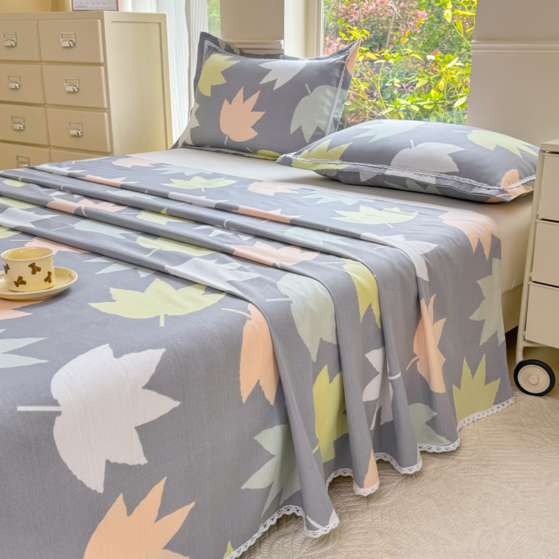 商品名称:宜家坊 2025新款春夏原棉鱼骨棉老粗布花边印花床单软凉席三件套 叶韵秋眠