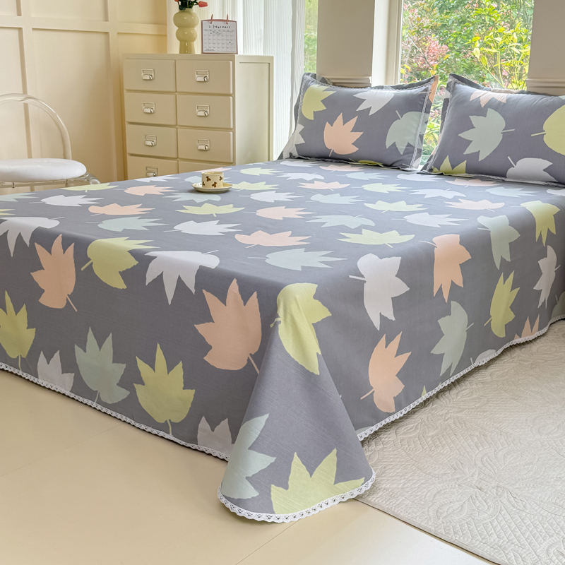 宜家坊 2025新款春夏原棉鱼骨棉老粗布花边印花床单软凉席三件套 叶韵秋眠