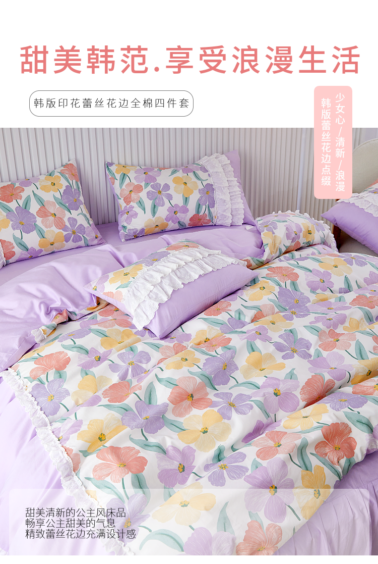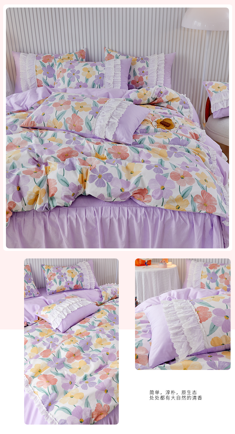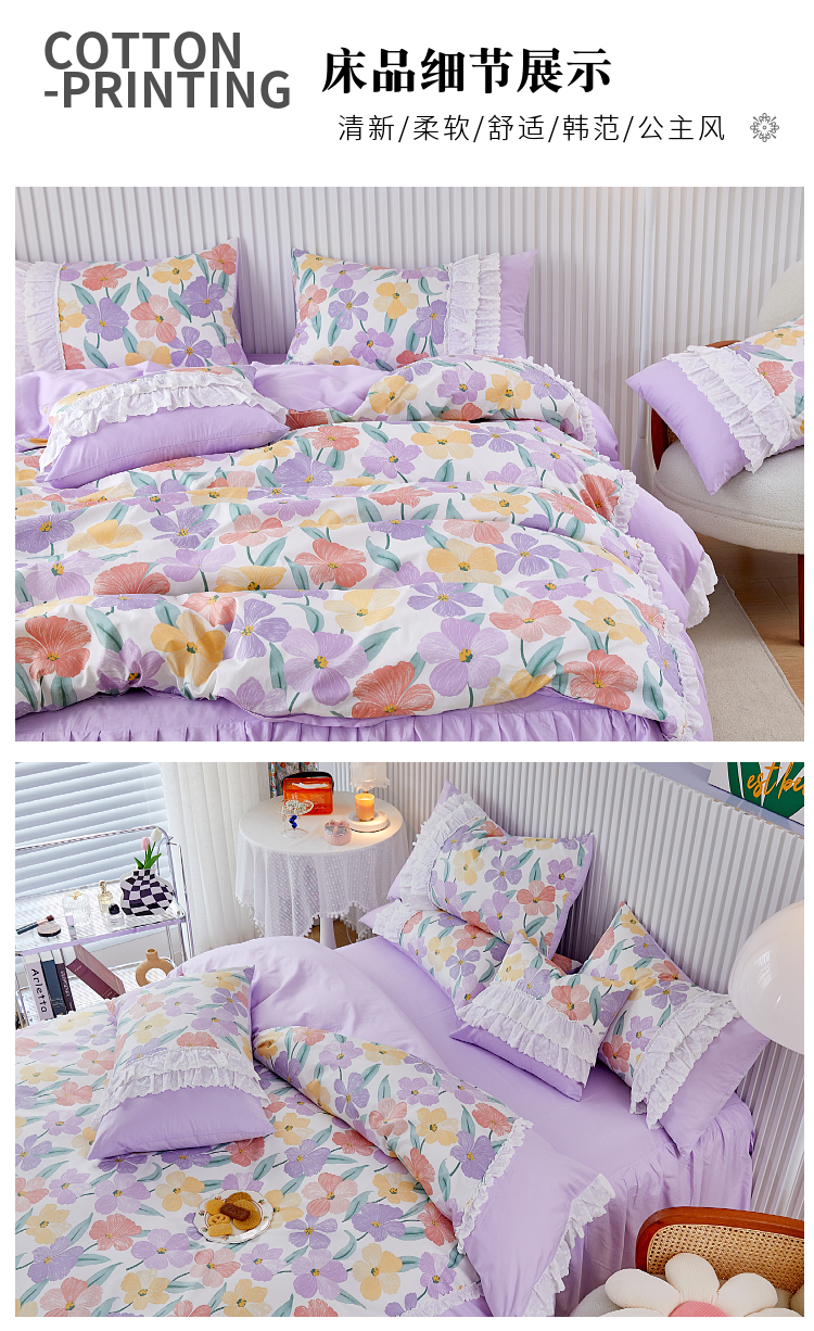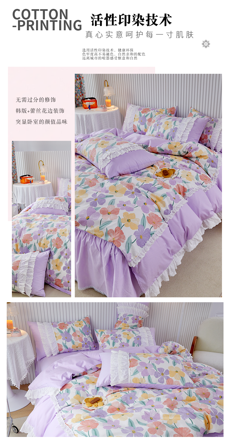 商品名称:亲亲公主 2025全棉蕾丝花边床裙公主风四件套 甜心花园-浅紫色