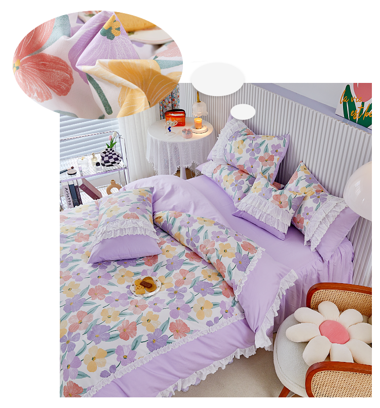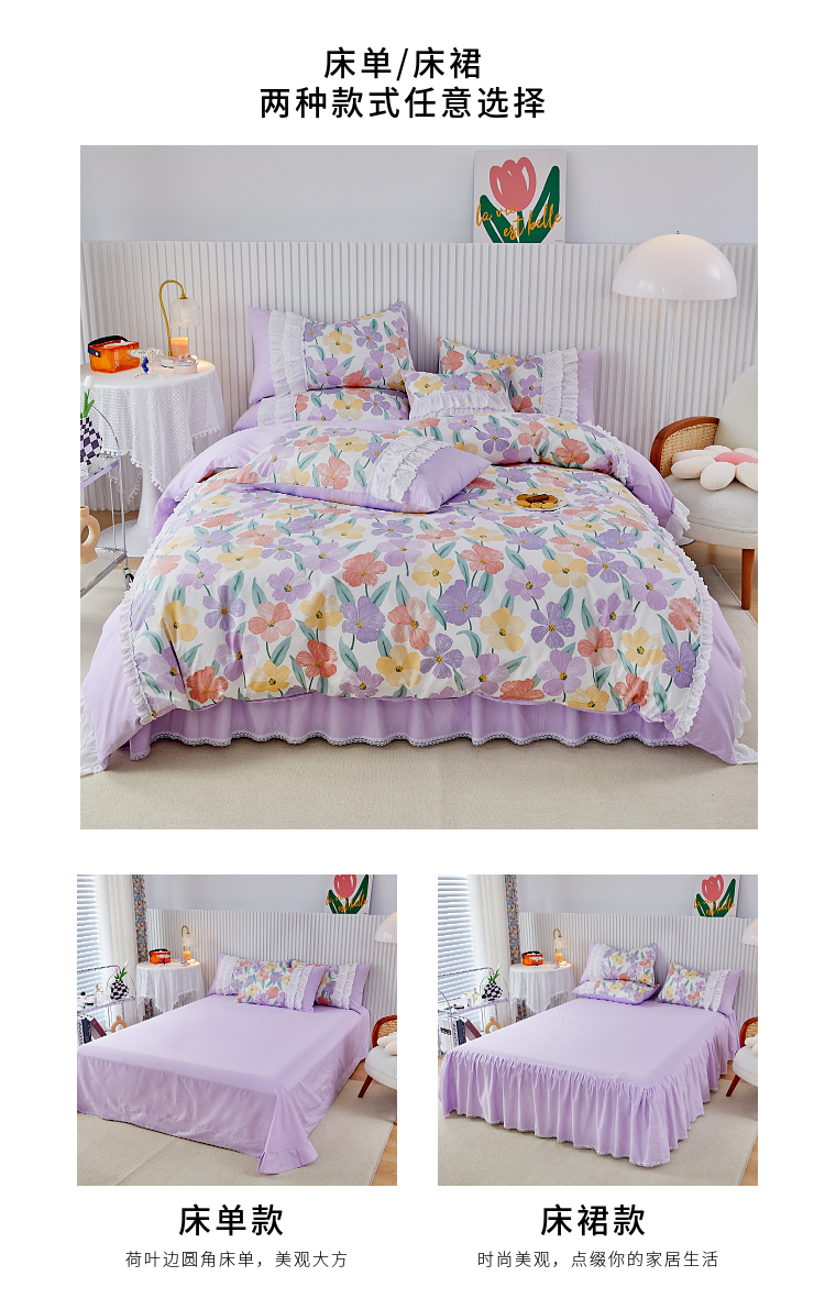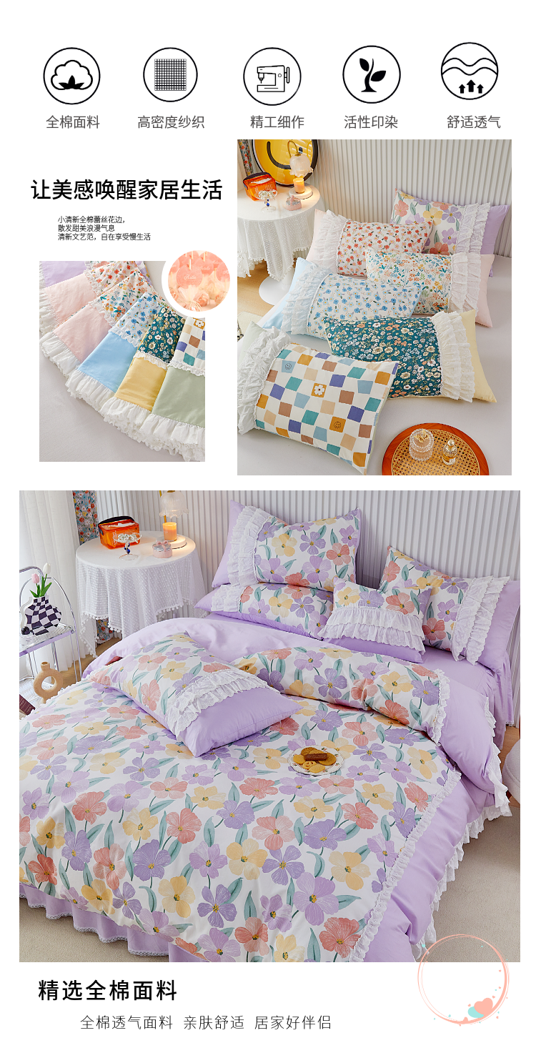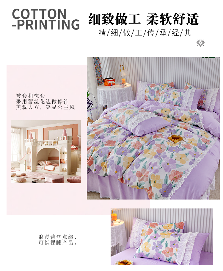 商品名称:亲亲公主 2025全棉蕾丝花边床裙公主风四件套 甜心花园-浅紫色
