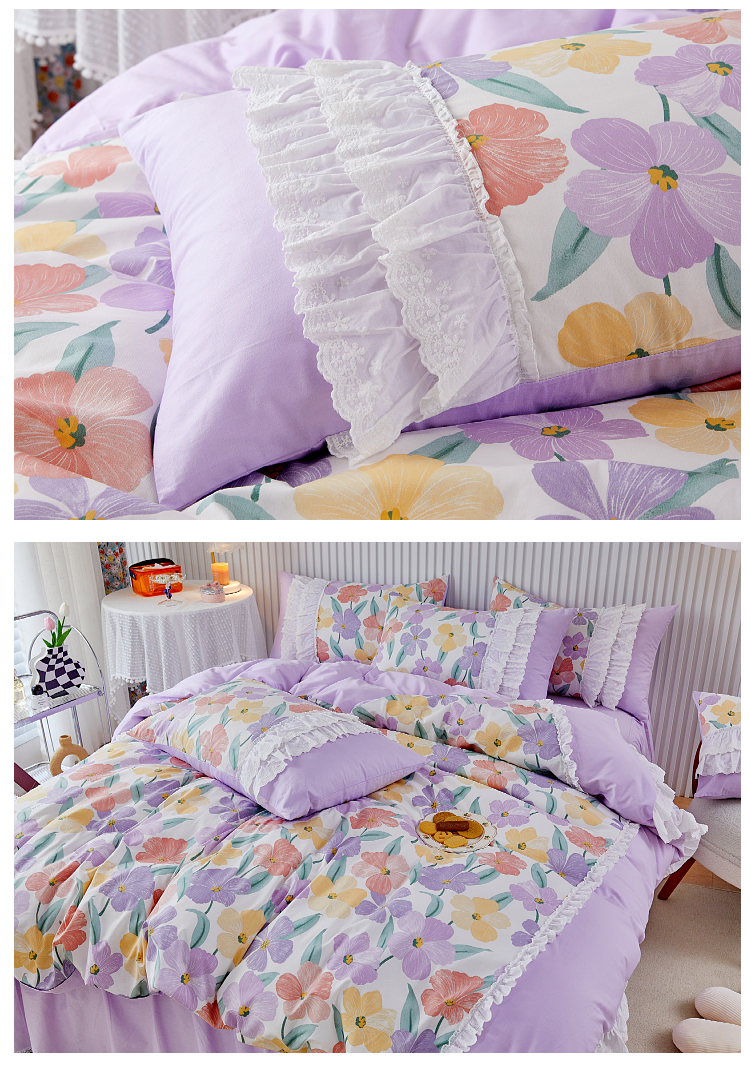 亲亲公主 2025全棉蕾丝花边床裙公主风四件套 甜心花园-浅紫色