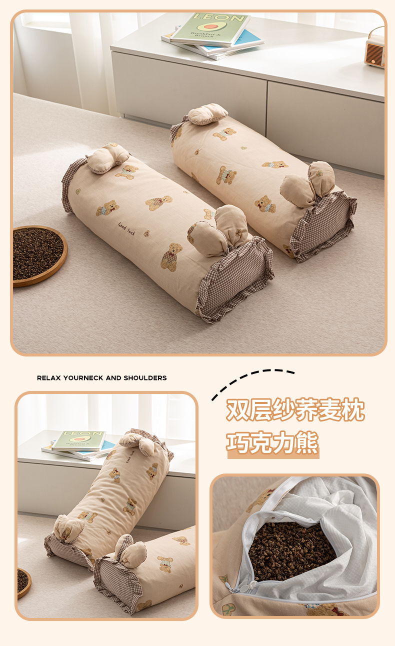 当前位置: 91家纺网 > 商品网购 > 枕头/枕芯/保健枕/颈椎枕 > 普通枕芯 > 萌番宝 2025新款小清新全棉纯棉兔耳全荞麦皮壳枕头护颈椎助睡眠硬枕头枕芯 双层纱荞麦枕—巧克力熊 50x18x10cm/只