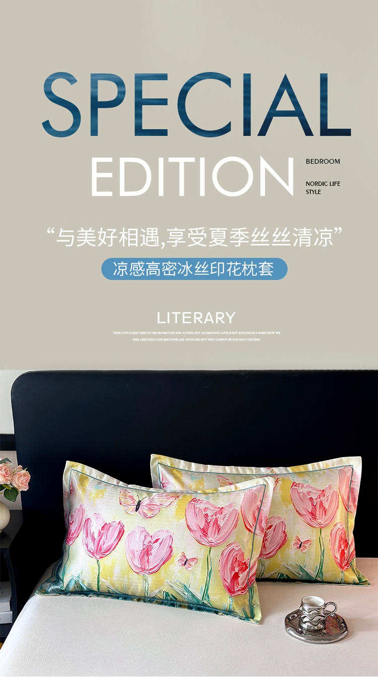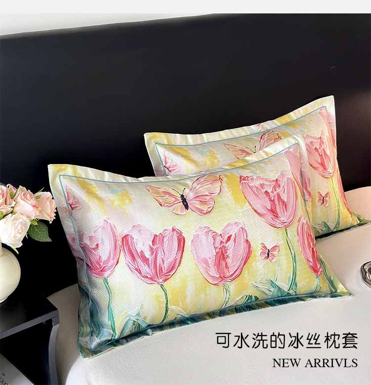 • 91家纺网 家纺一手货源 找家纺 乐居家纺 2025新款凉感高密冰丝双人印花枕套+内芯 花开富贵