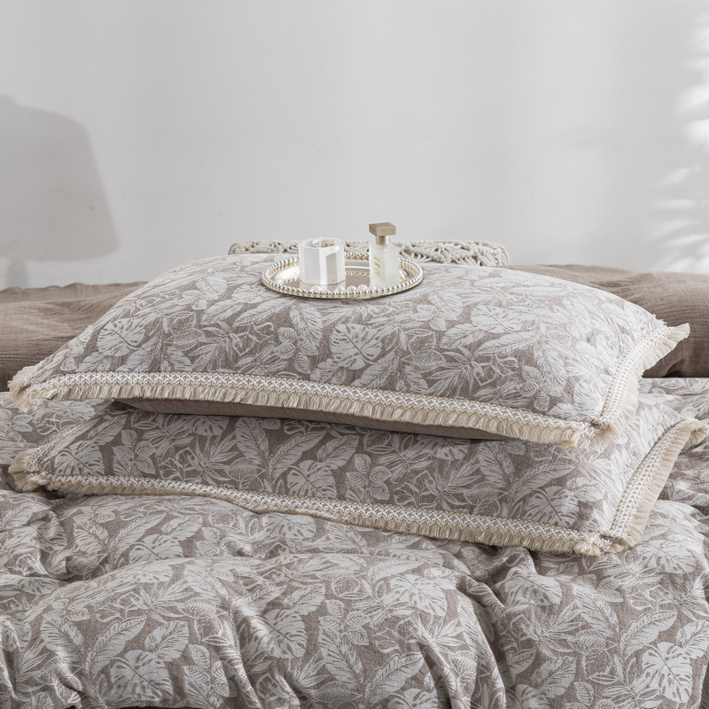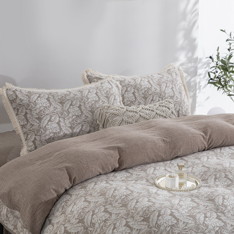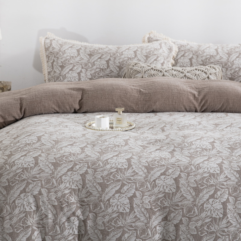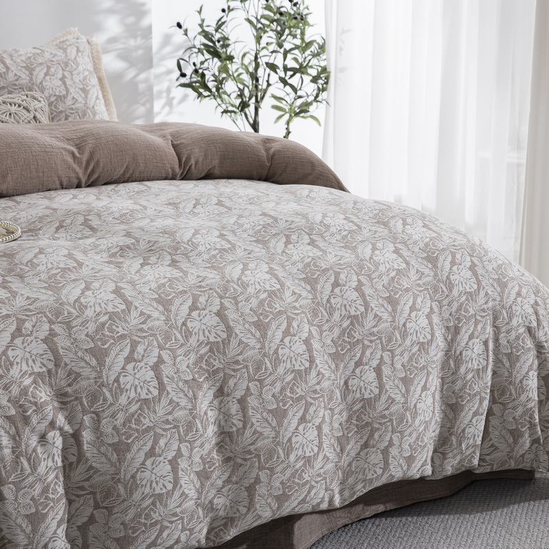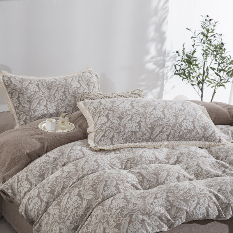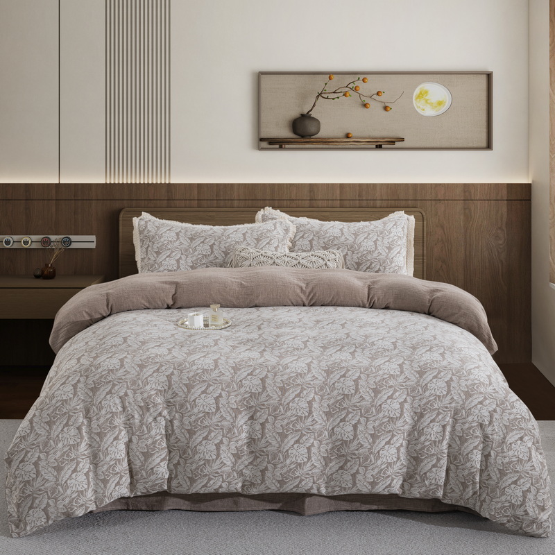 鲁爱家纺供货 2025新款AB版棉麻工艺款四件套 龟背竹-咖