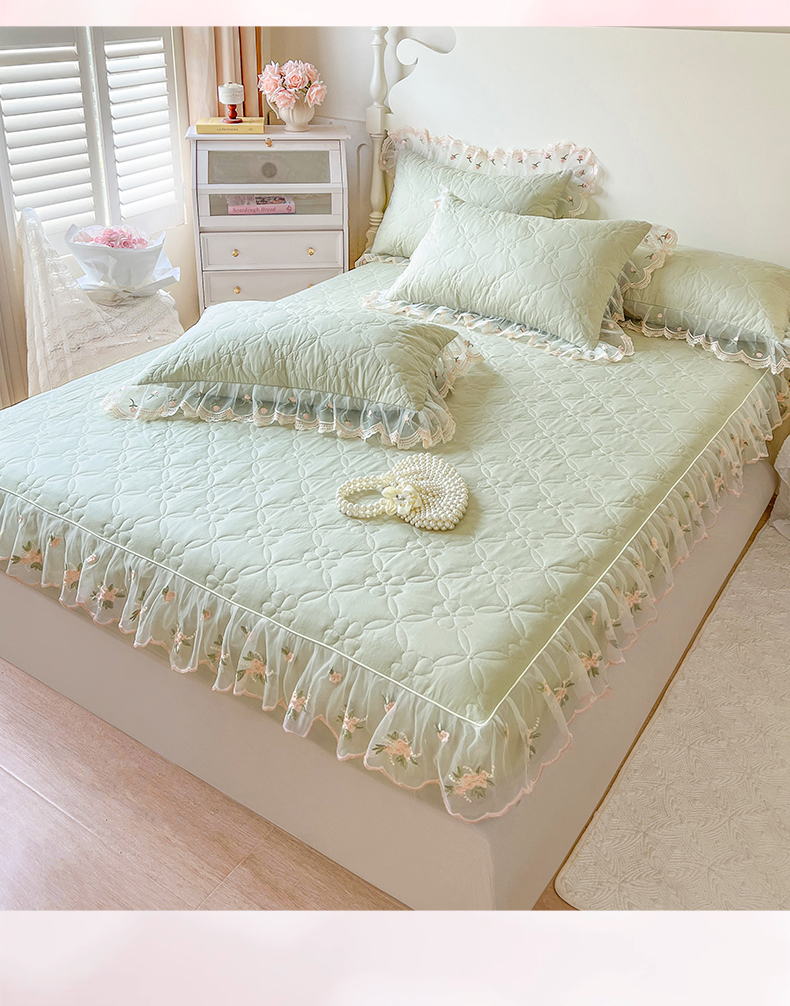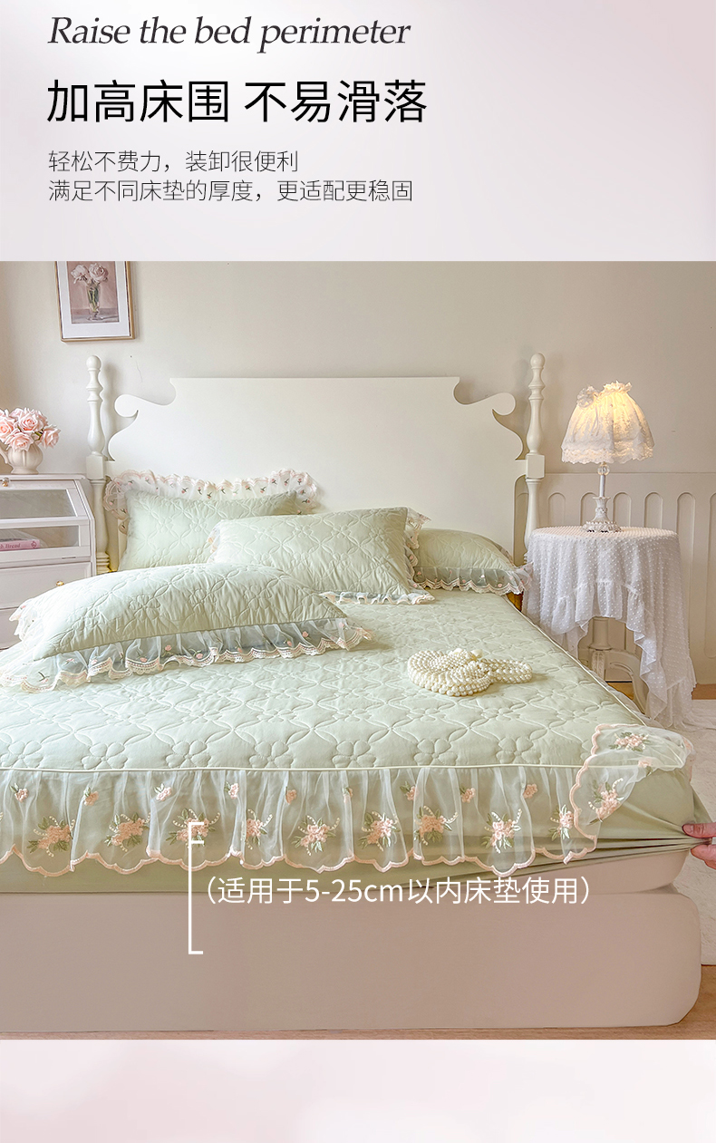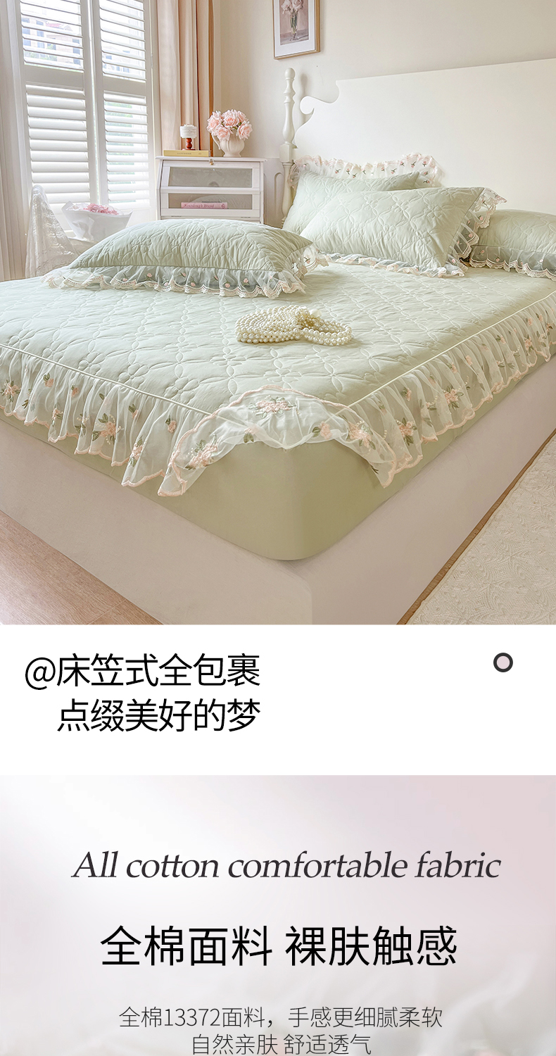 麒豆豆 2025新款全棉蕾丝边床裙款床笠-晨暮花间 晨暮花间-麦绿