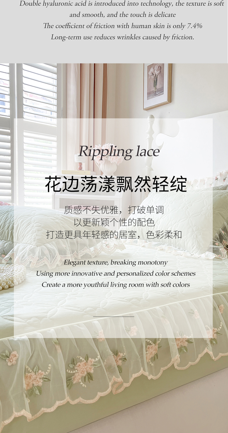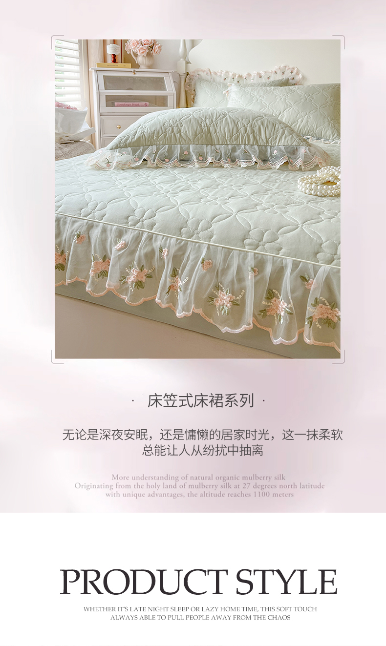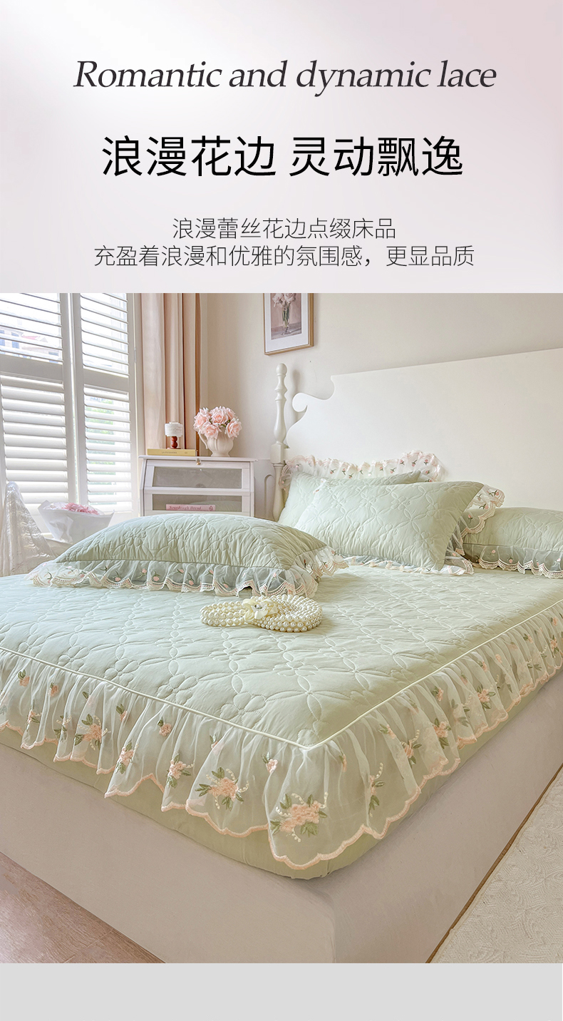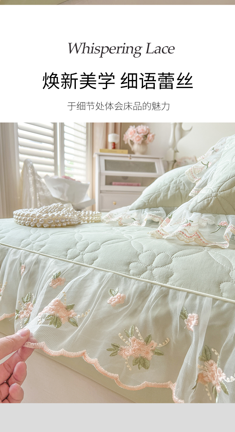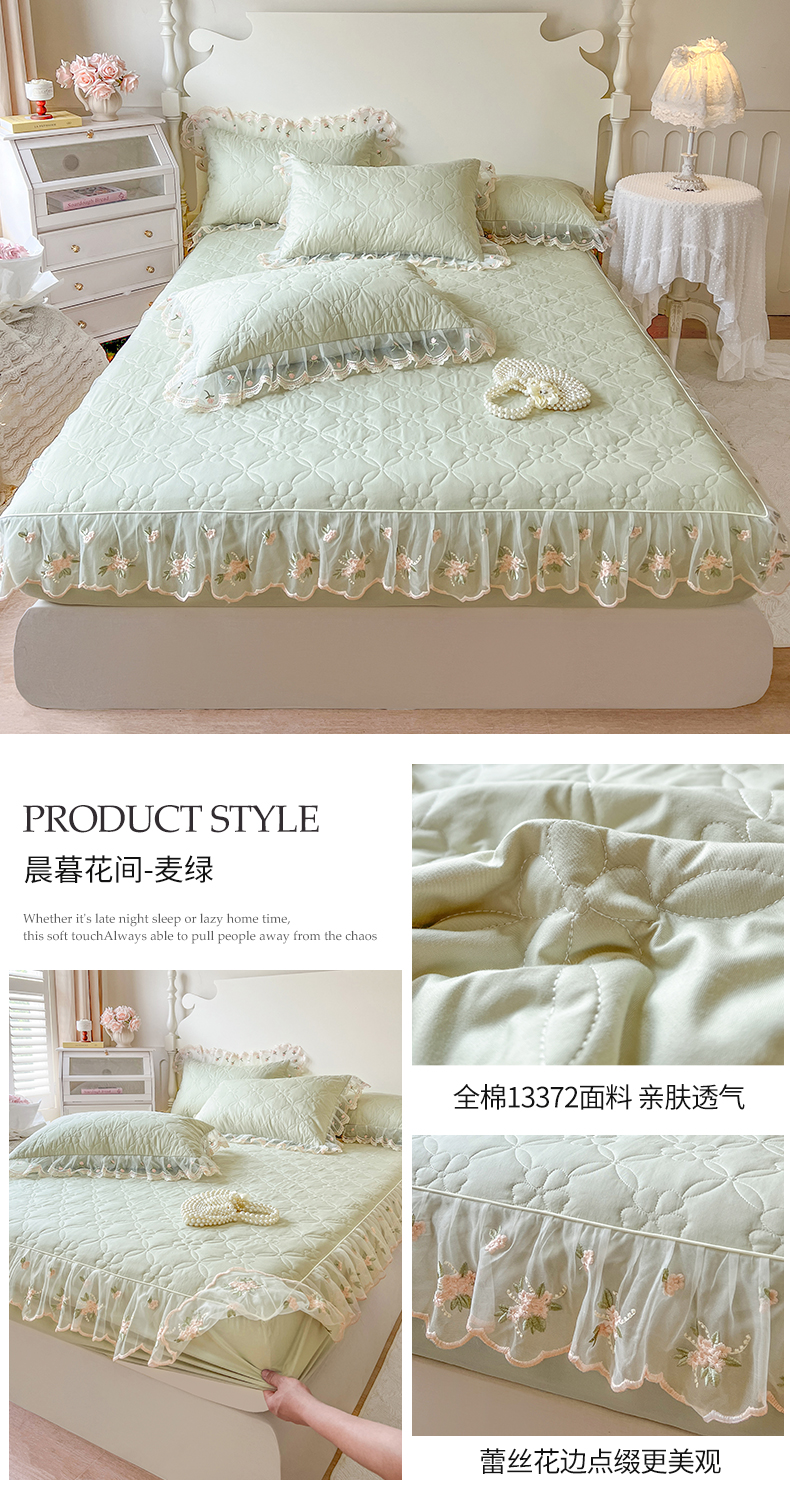 • 91家纺网 家纺一手货源 找家纺 麒豆豆 2025新款全棉蕾丝边床裙款床笠-晨暮花间 晨暮花间-麦绿