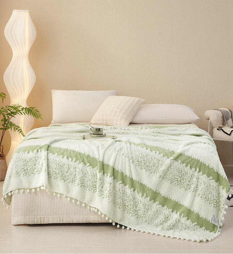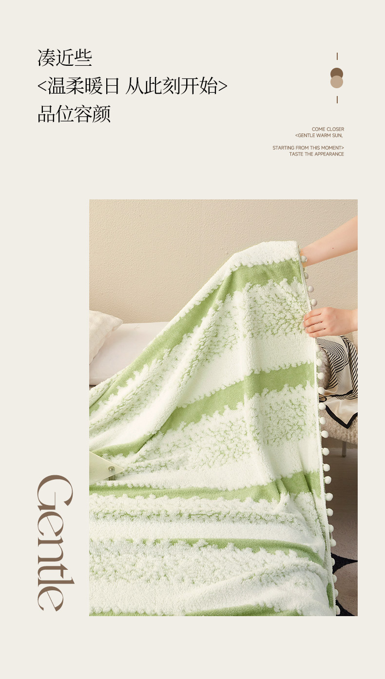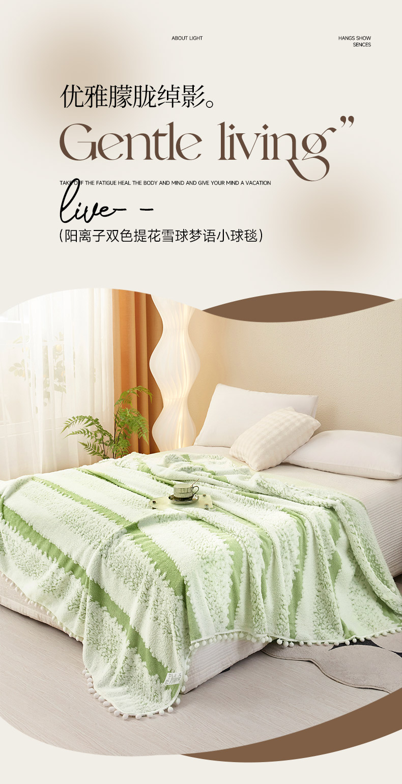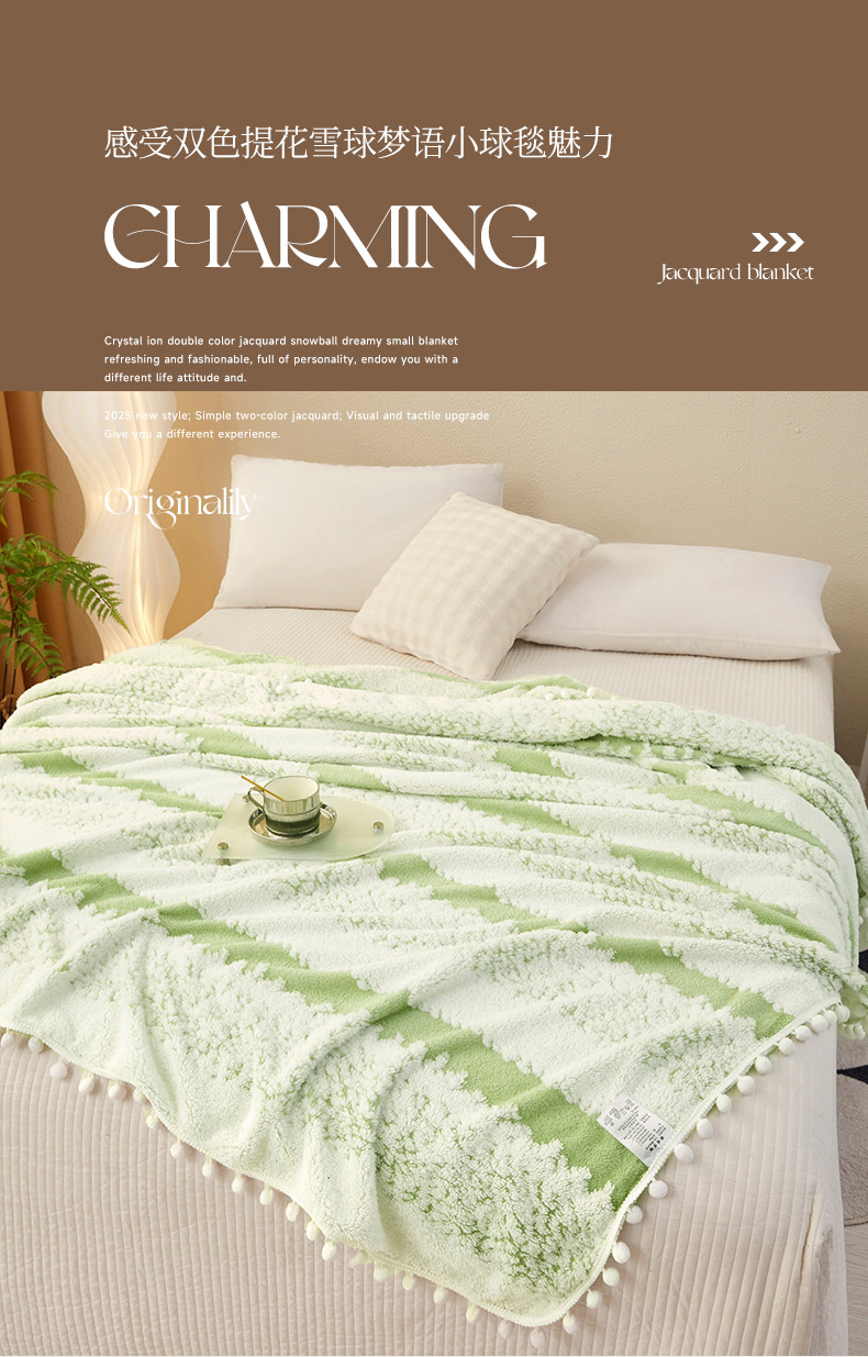 莱家富 2026新款跨境专供外贸出口300克重双面条纹阳离子提花毛球毛毯盖毯休闲小毯子冬季床单 雪球梦语雅绿