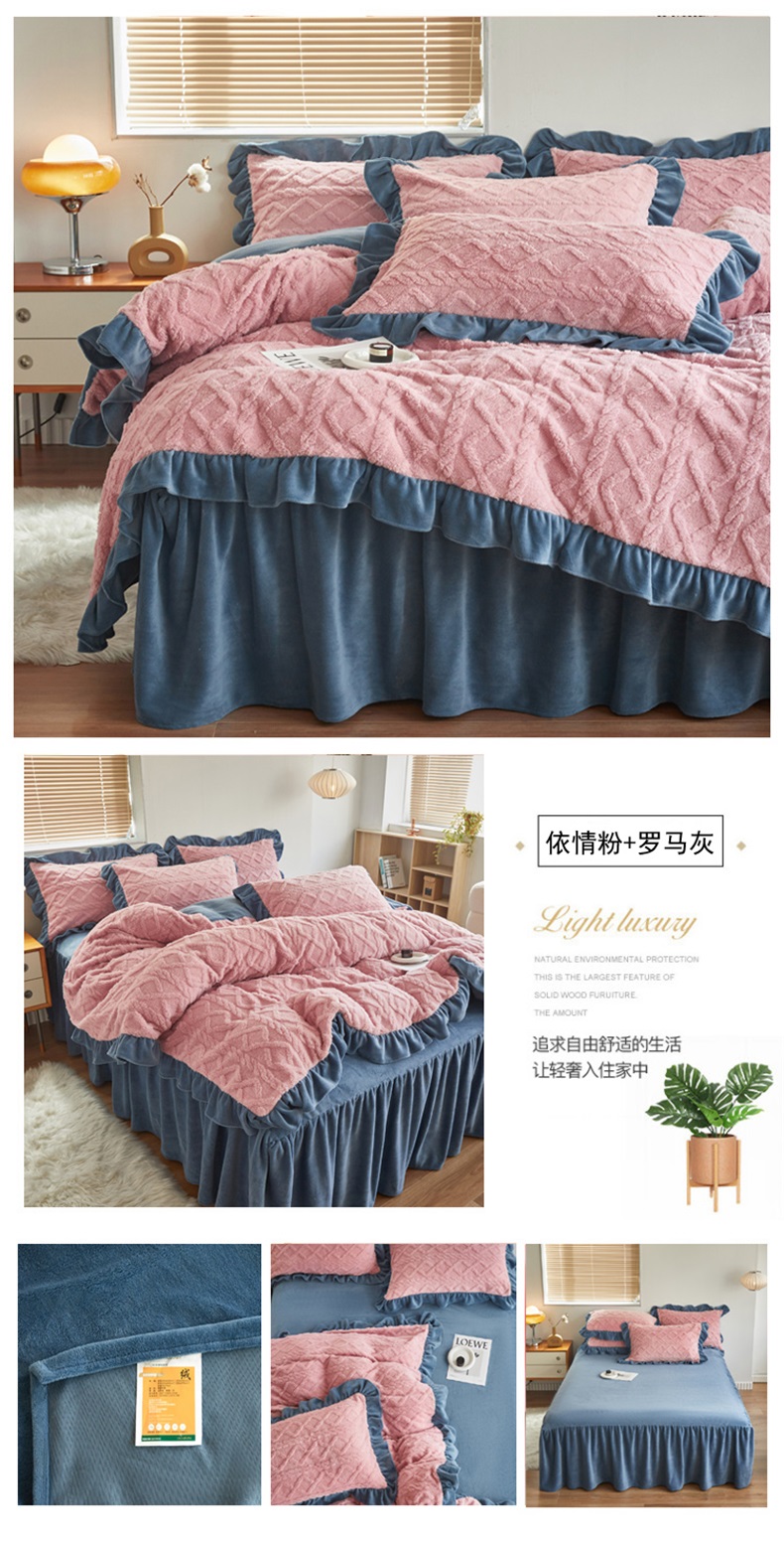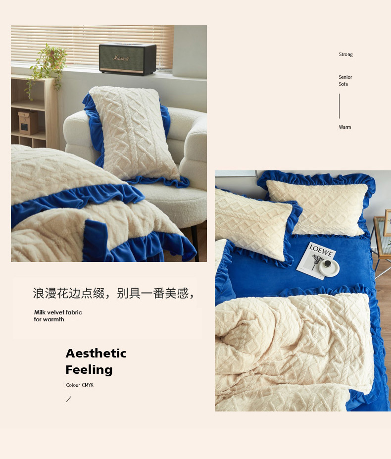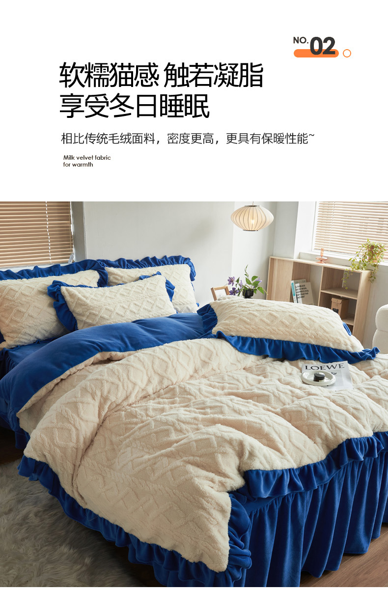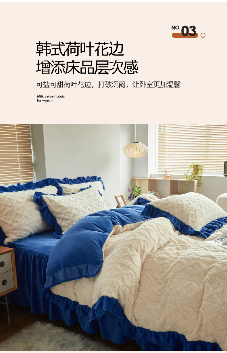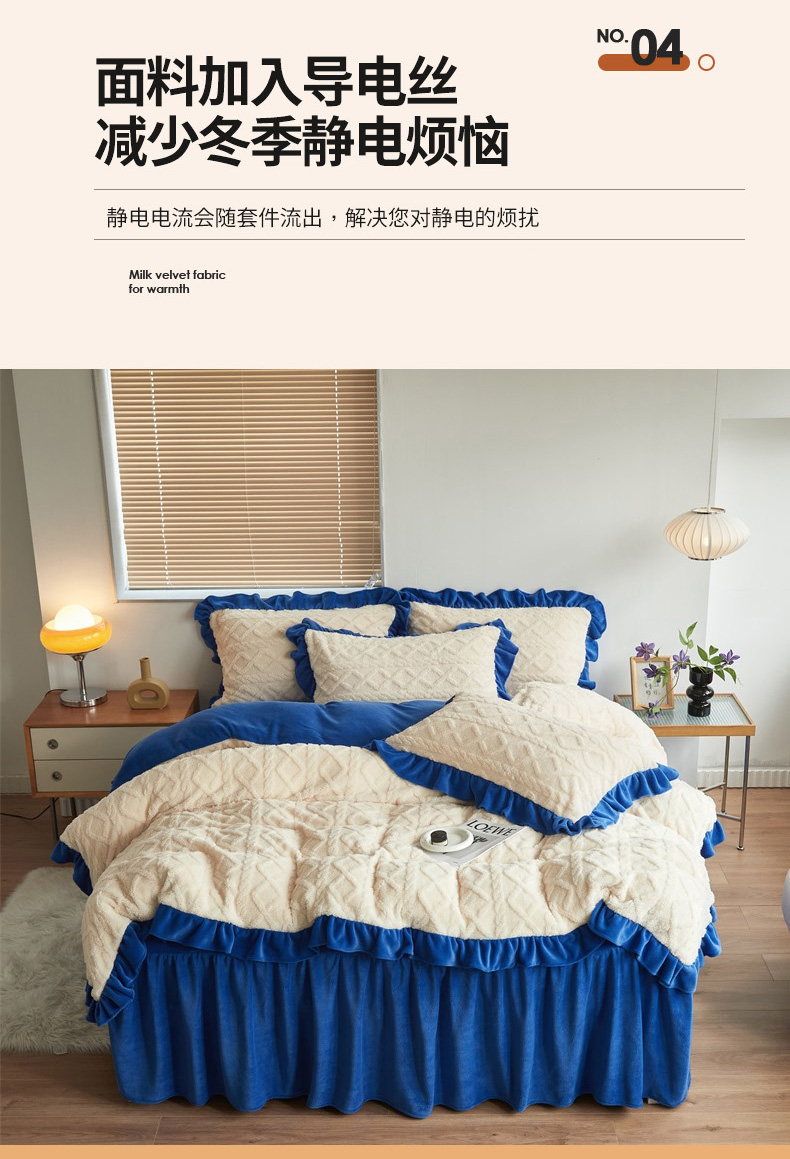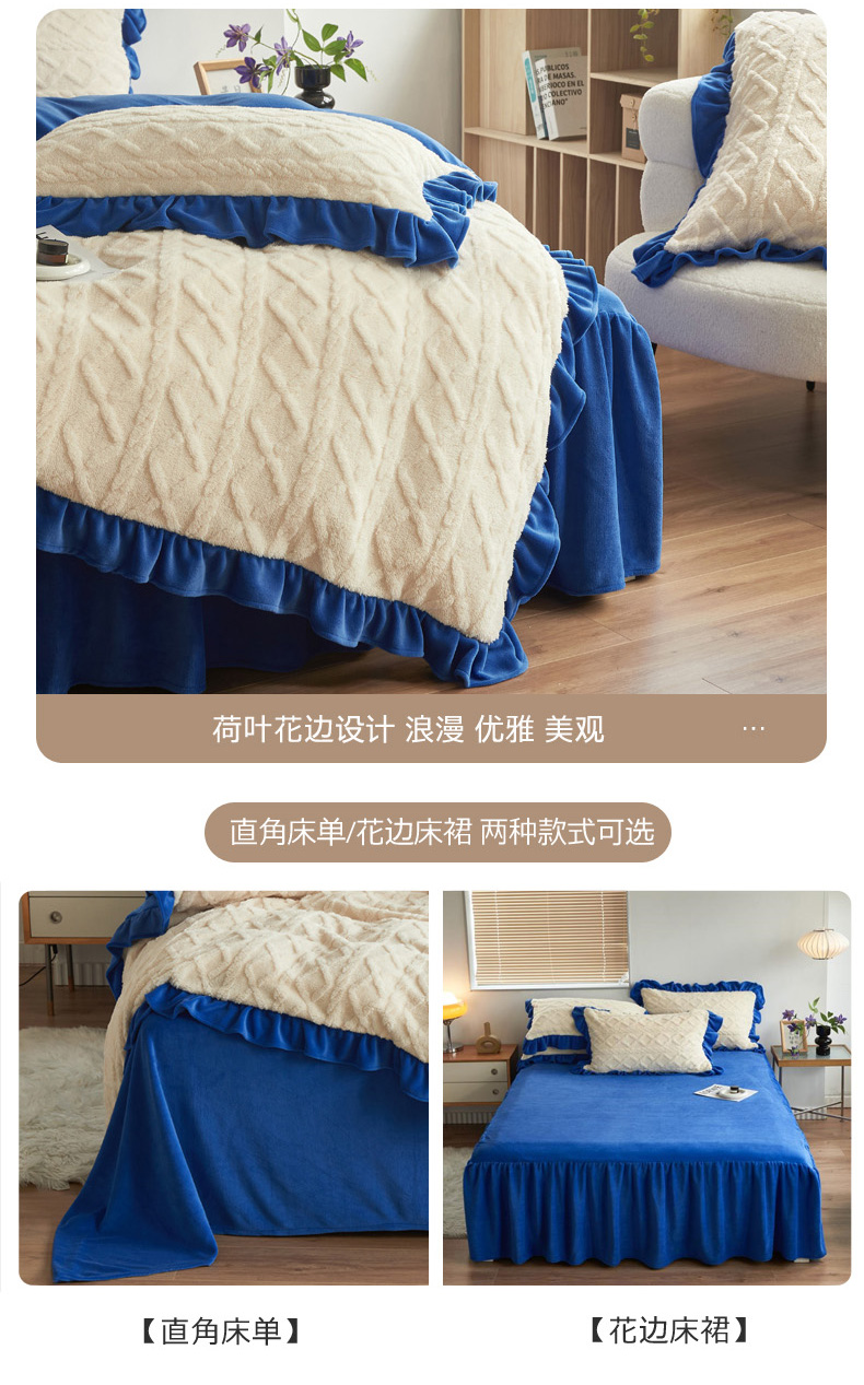 当前位置: 91家纺网 > 商品网购 > 床品套件 > 四件套 > 牛奶绒四件套 > 睡美人 2025新款韩版塔芙绒牛奶绒床单床裙床笠款四件套 依情白+梦幻蓝
