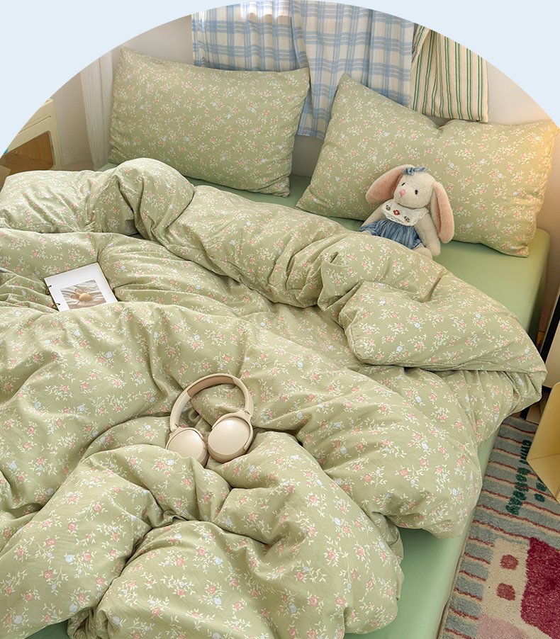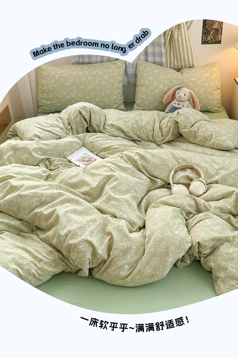 罗亿家纺 2025新款软绵绵的双拼印花小清新水洗云朵棉四件套(含买家秀场景二)春江雾