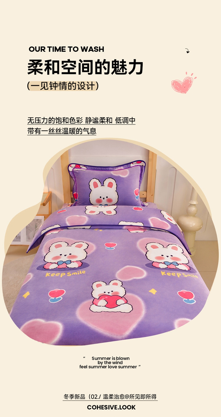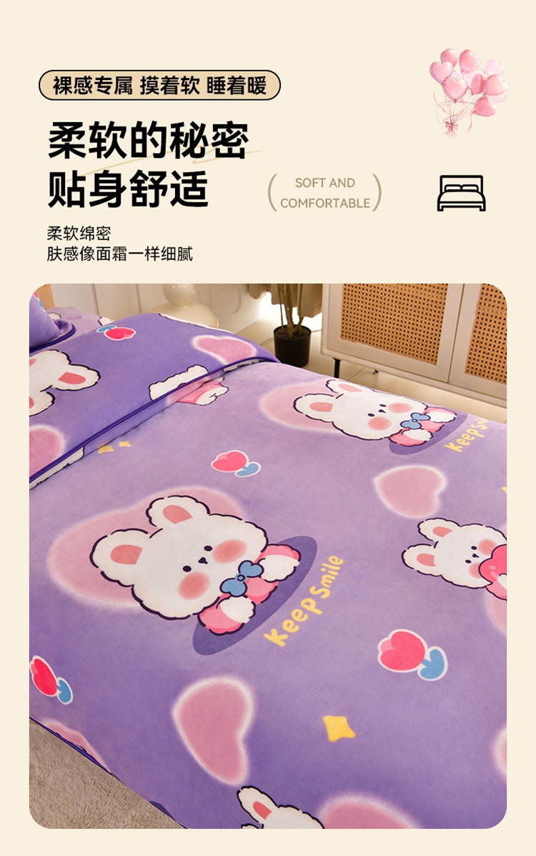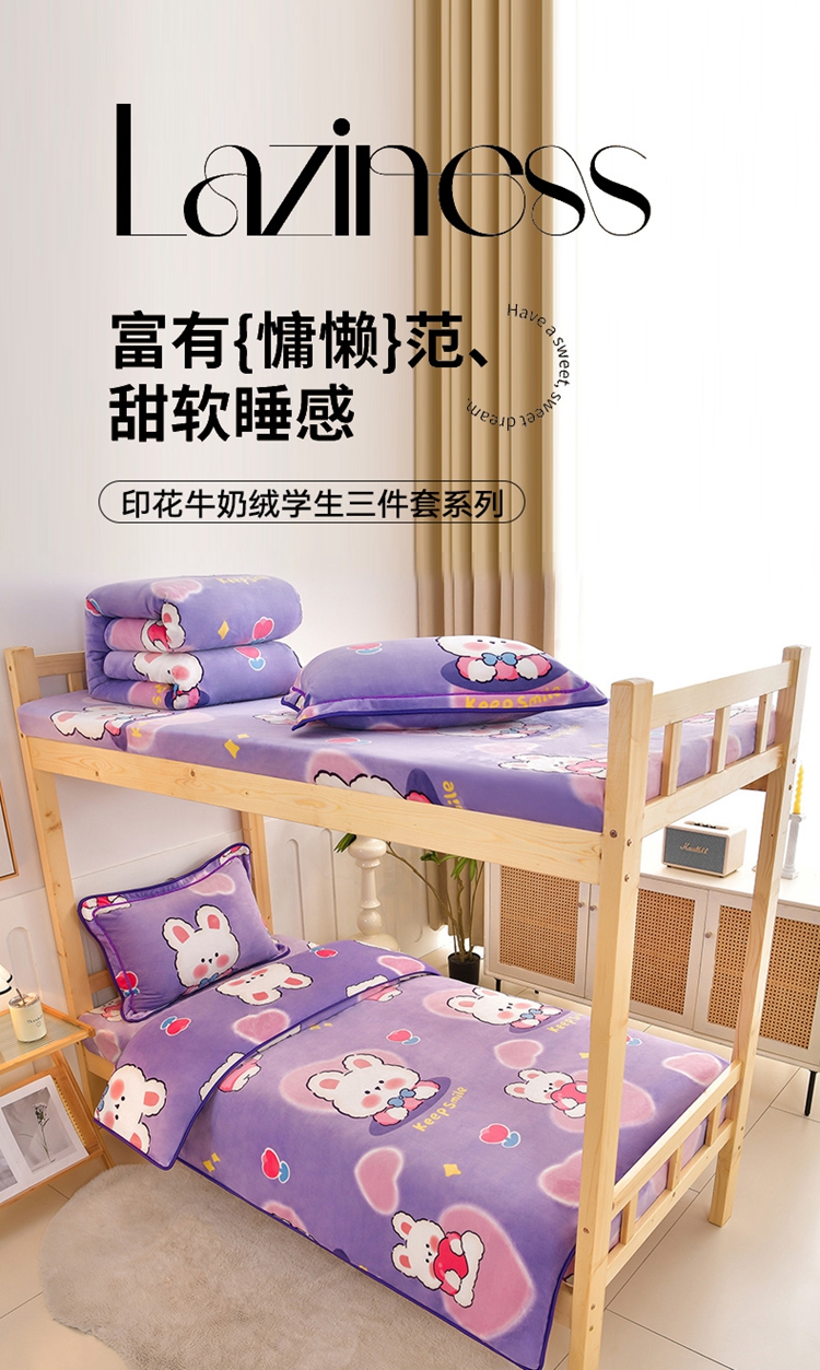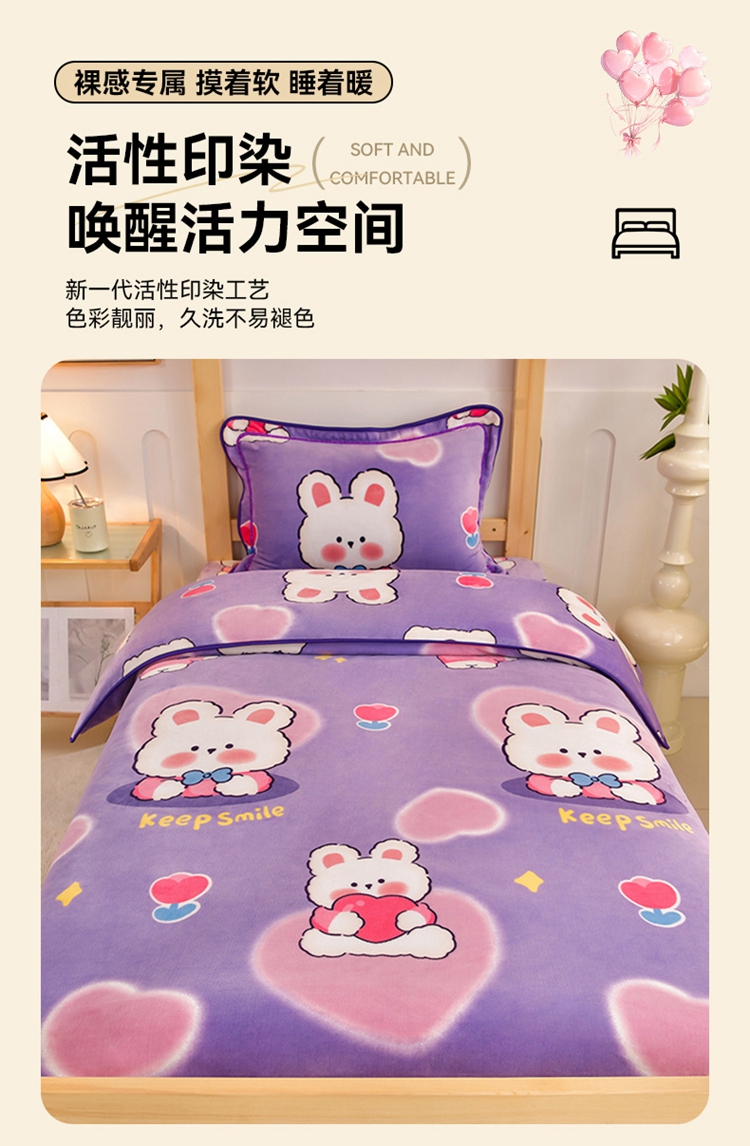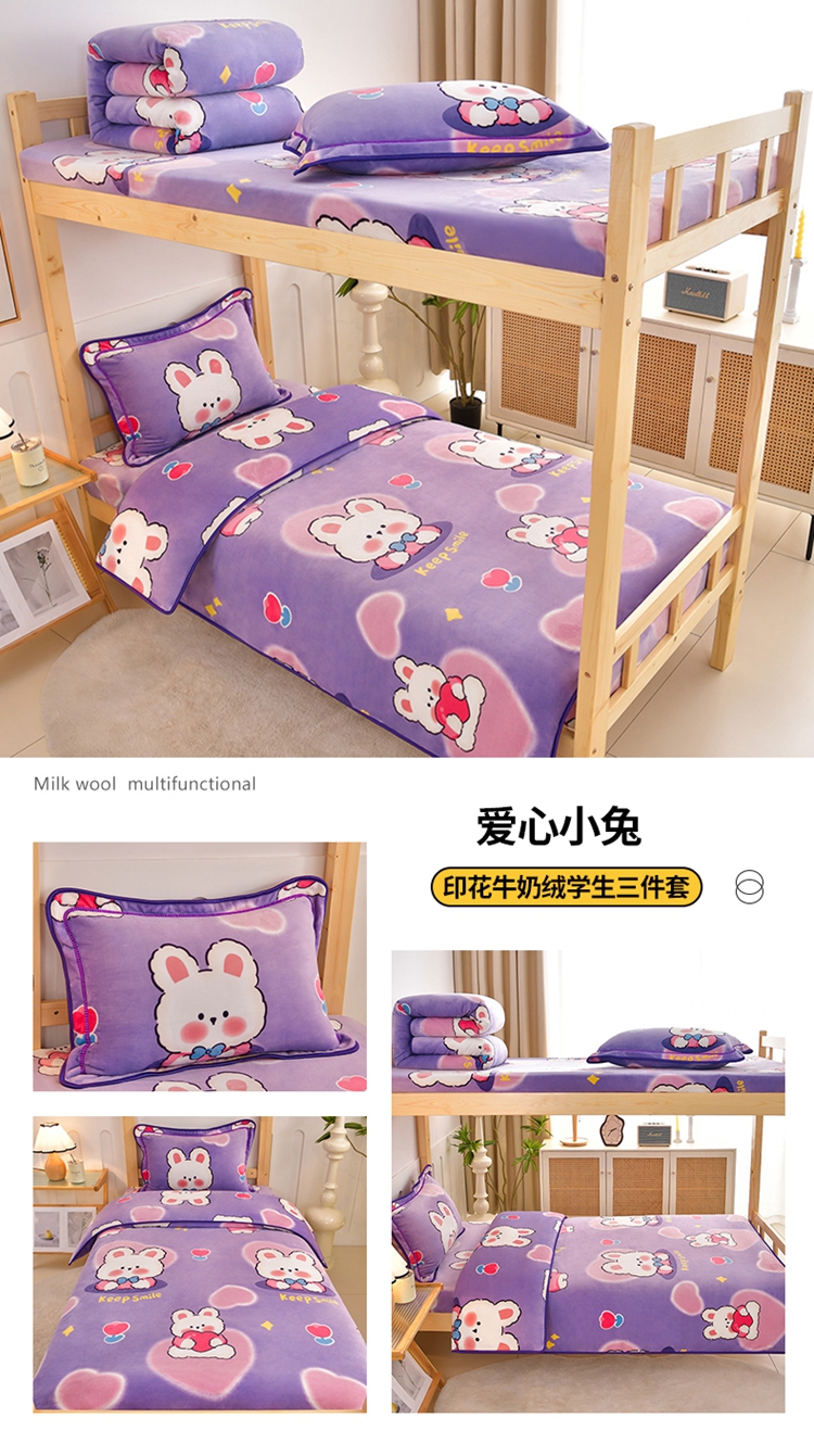 商品名称:馨梦缘2025新款爆款高克重印花牛奶绒法莱绒学生三件套 爱心小兔