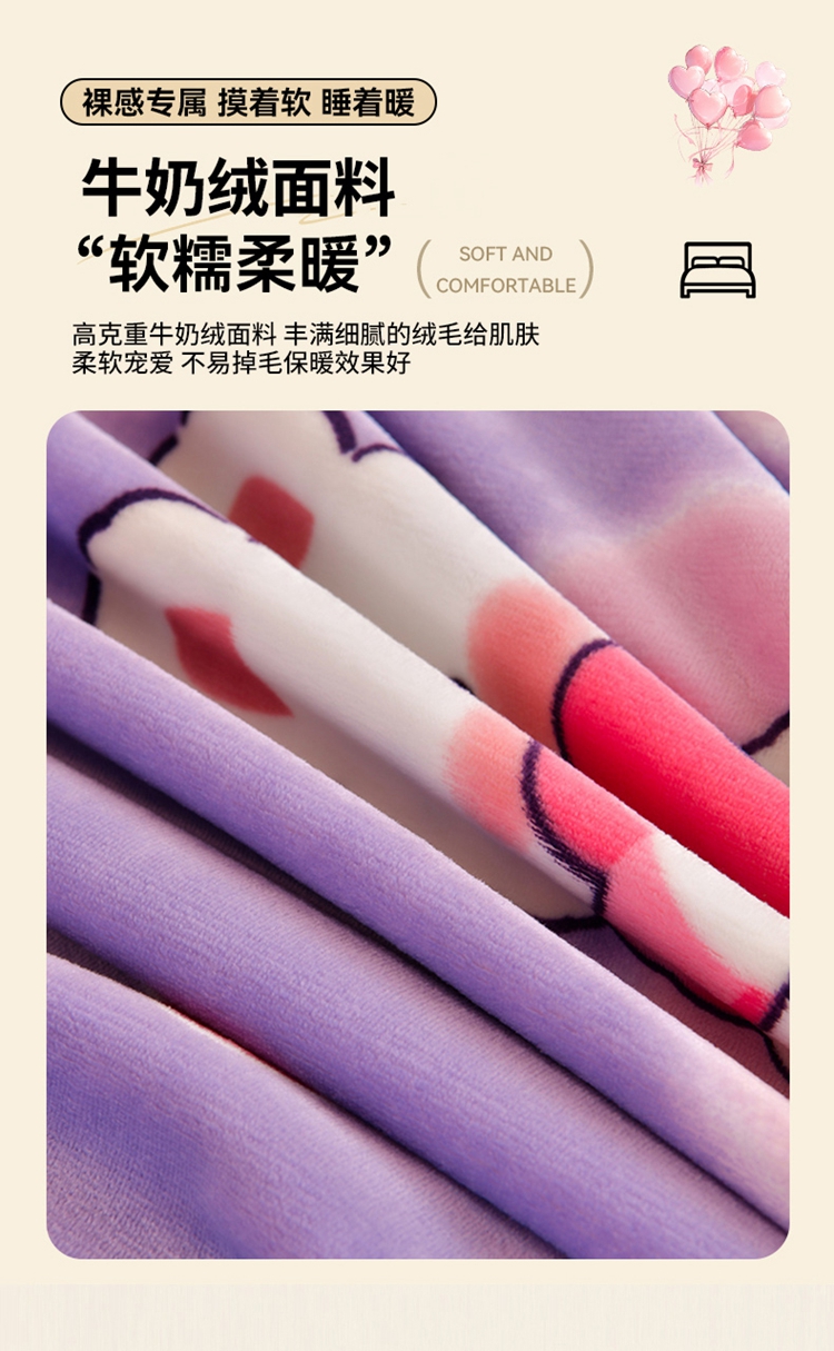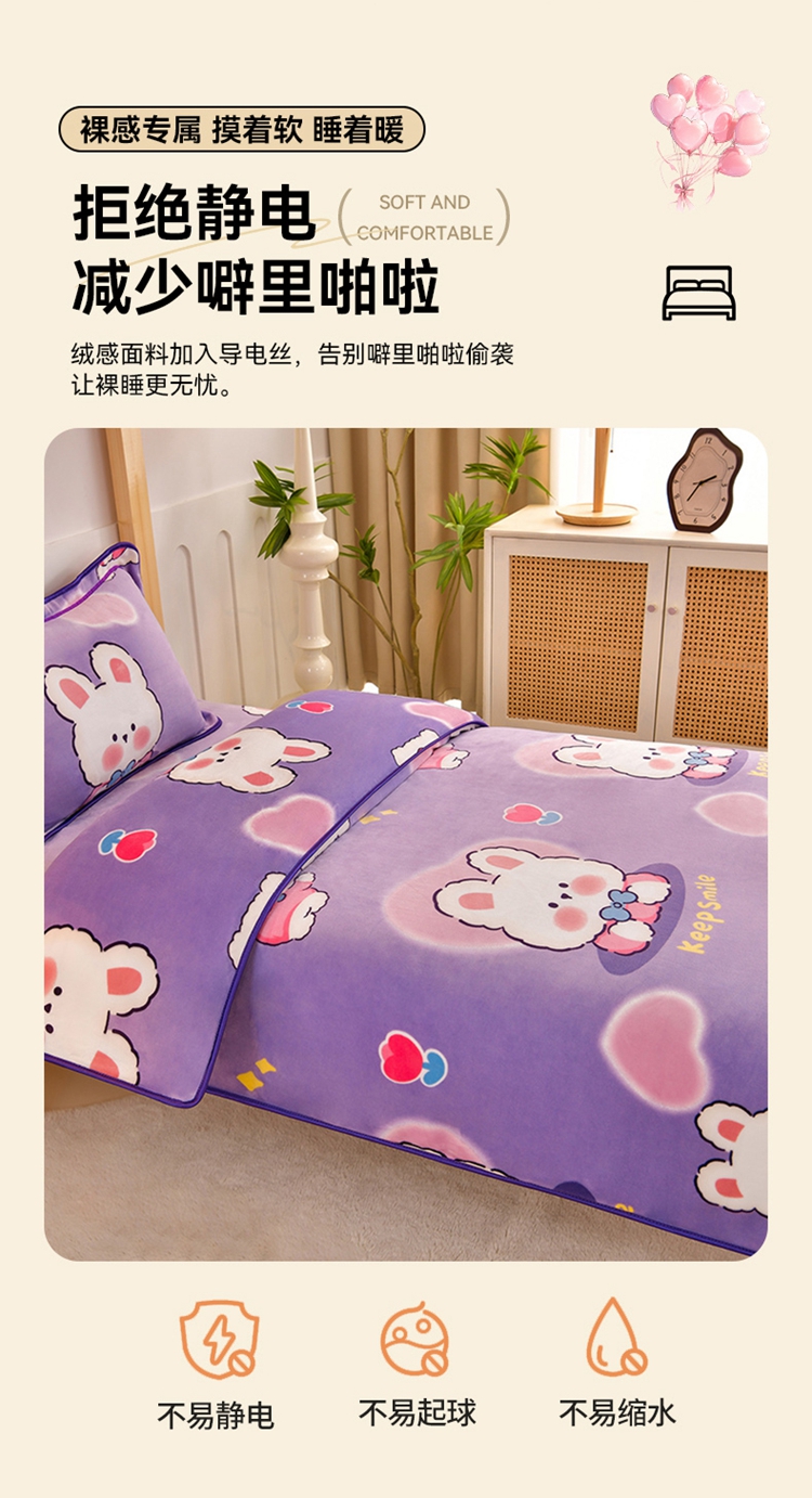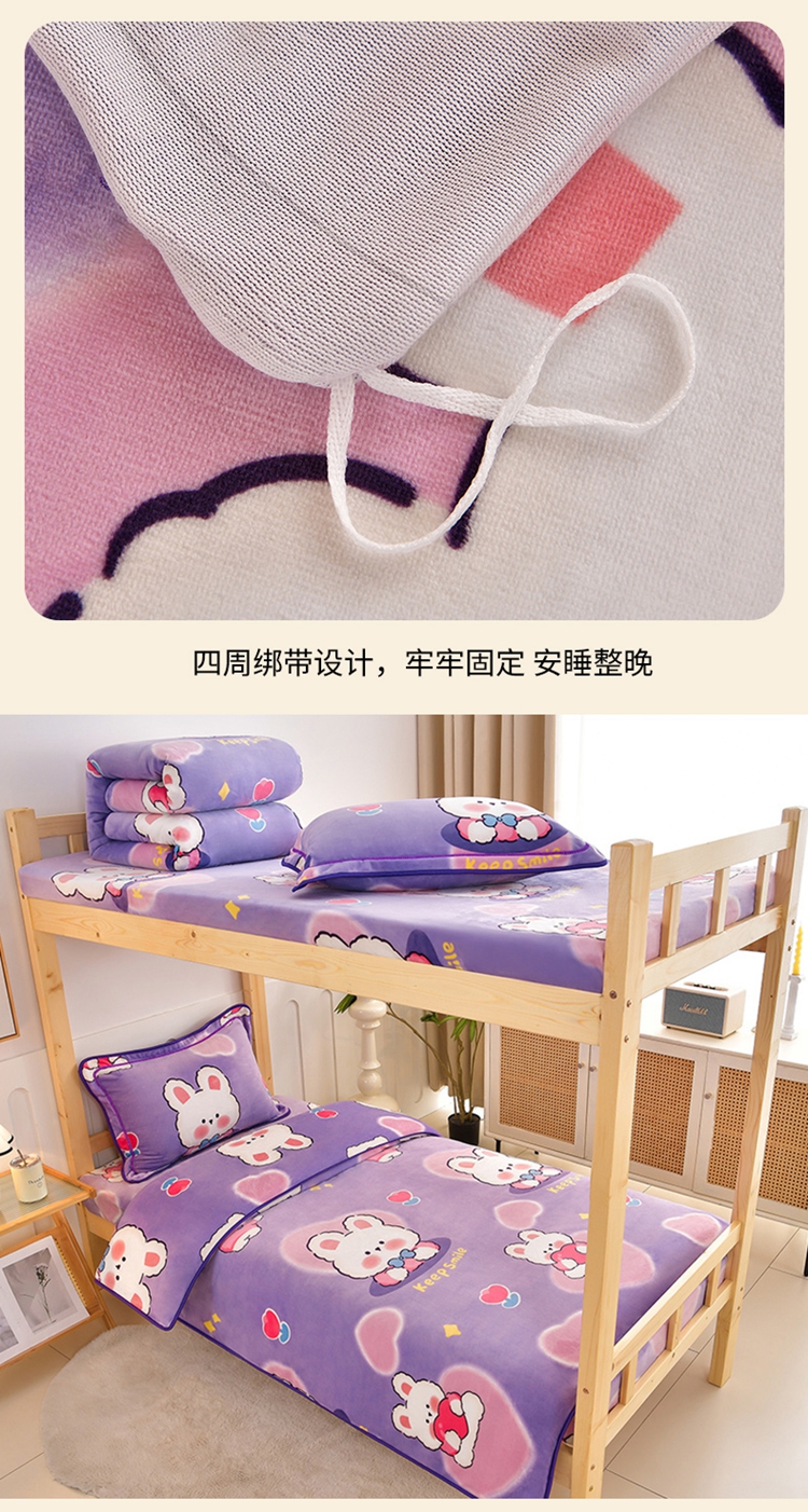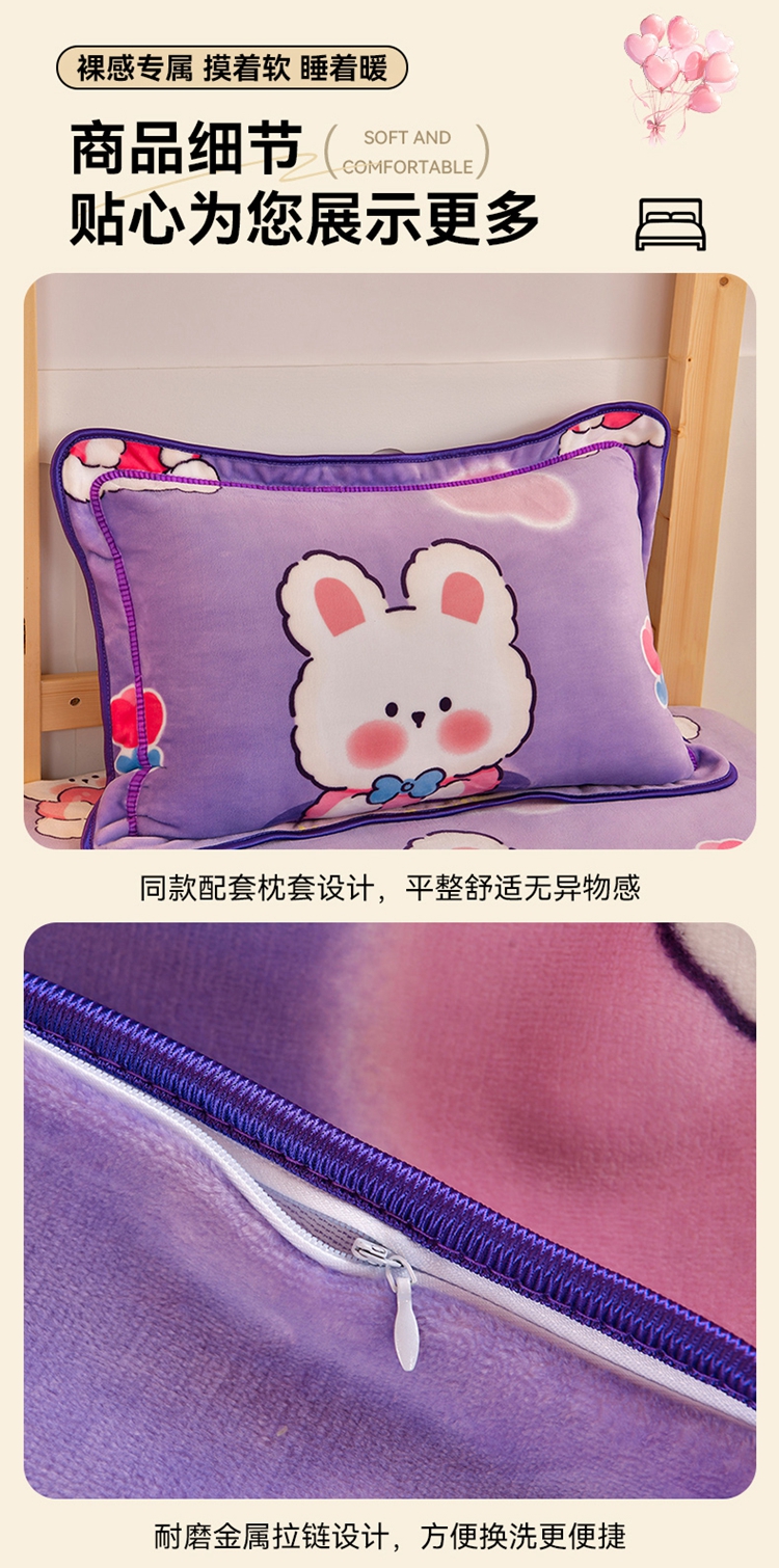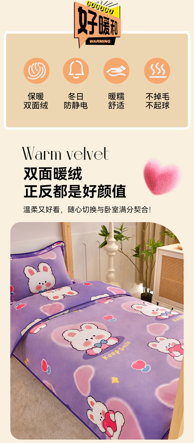 商品名称:馨梦缘2025新款爆款高克重印花牛奶绒法莱绒学生三件套 爱心小兔