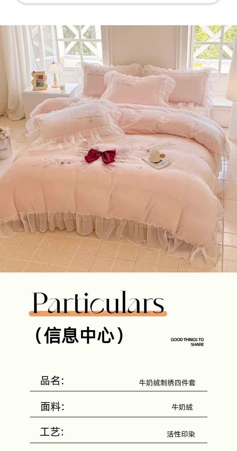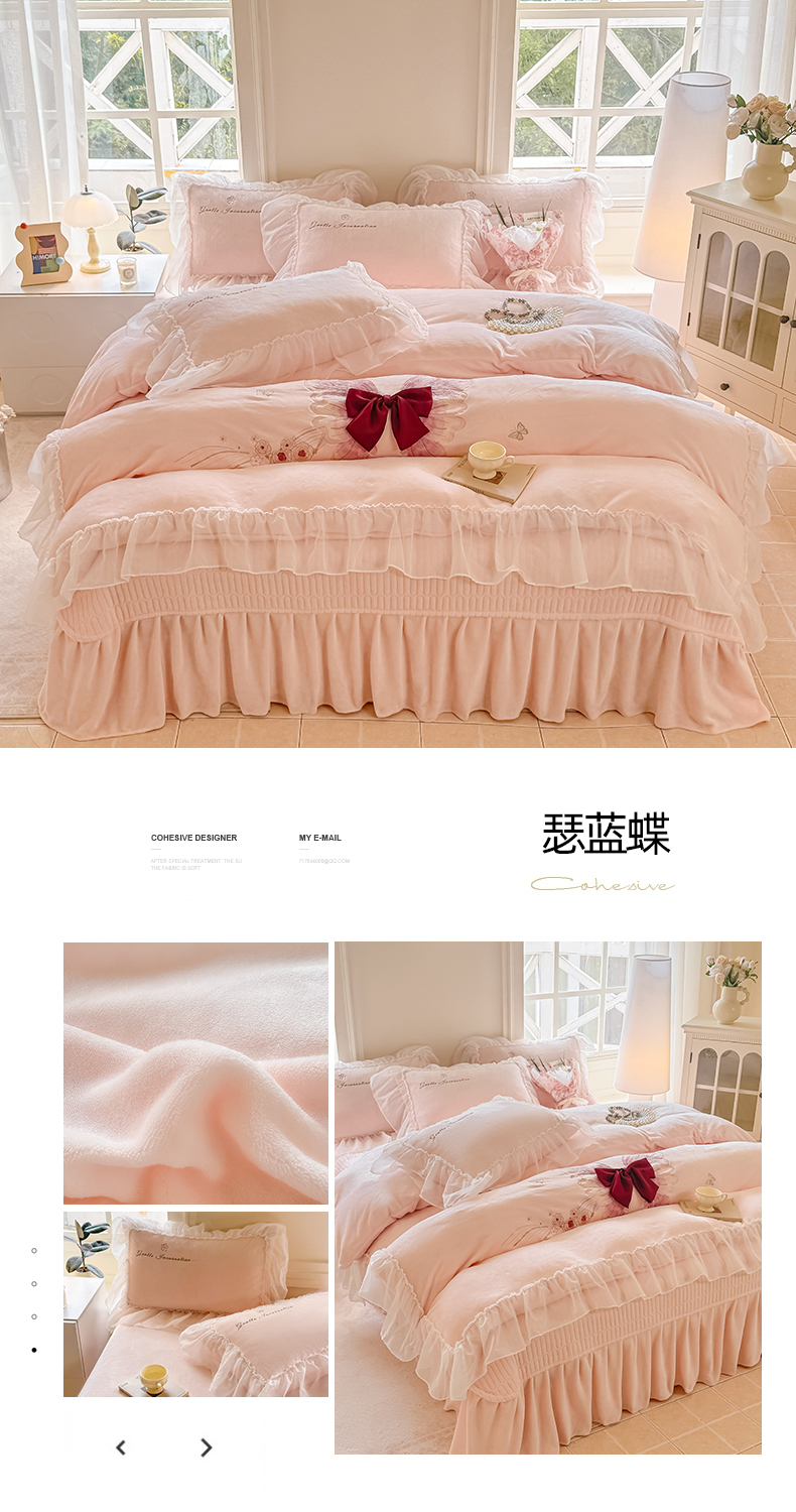 (总)锦格家纺 2025新款A类高克重雕花牛奶绒花边四件套,梦幻-玉粉,初薇-豆沙,初薇-绿,初薇-玉粉,幻梦-黄,幻梦-天蓝,蝶漫-奶白,蝶漫-天蓝
