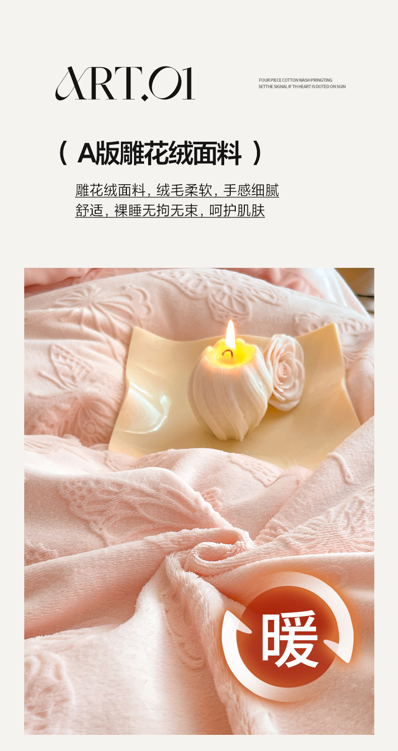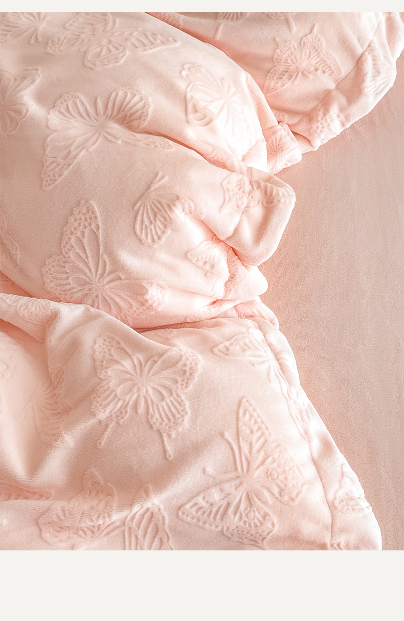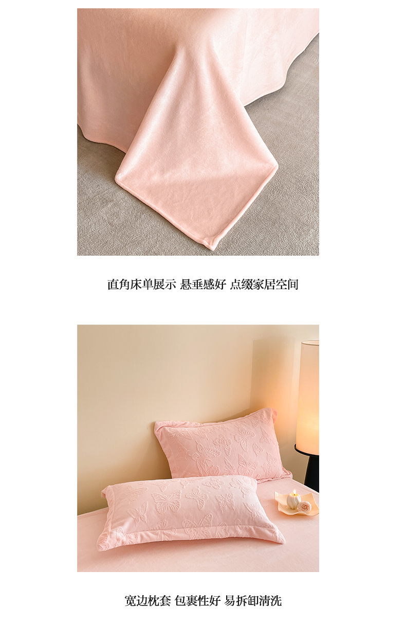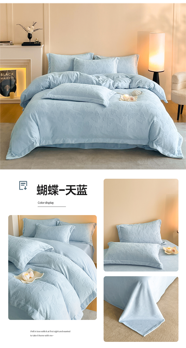 当前位置: 91家纺网 > 商品网购 > 床品套件 > 四件套 > 牛奶绒四件套 > 米彩家纺 2025新款A类牛奶绒立体雕花烂花宽边四件套 蝴蝶天蓝