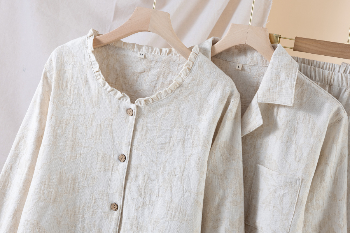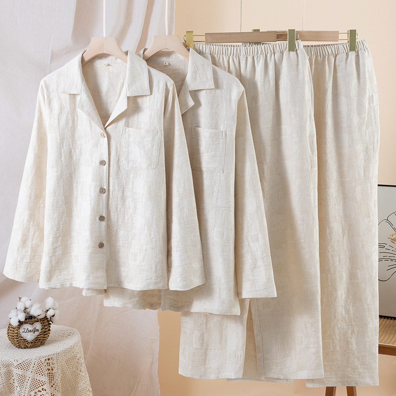(总)【只代发】2025新款无印风简约纯色棉麻睡衣情侣款春秋夏季薄款男女士家居服套装可外穿长袖