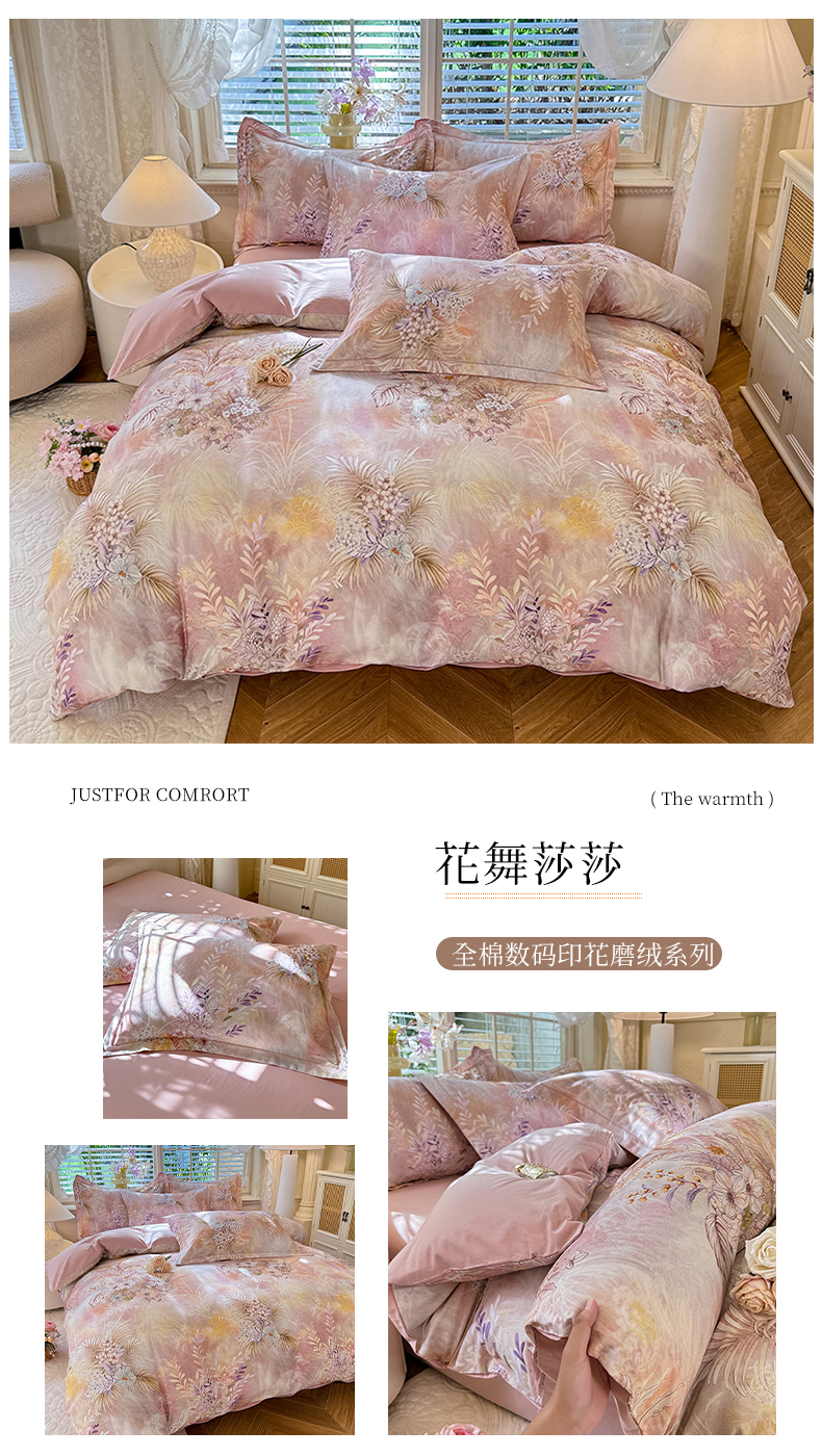 当前位置: 91家纺网 > 商品网购 > 床品套件 > 四件套 > 全棉普通四件套 > 巧玲珑 2025新款100%数码印花生态AB版四件套 花舞莎莎
