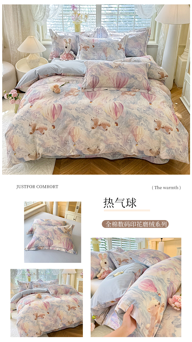 当前位置: 91家纺网 > 商品网购 > 床品套件 > 四件套 > 全棉普通四件套 > 巧玲珑 2025新款100%数码印花生态AB版四件套 热气球