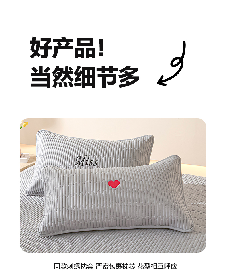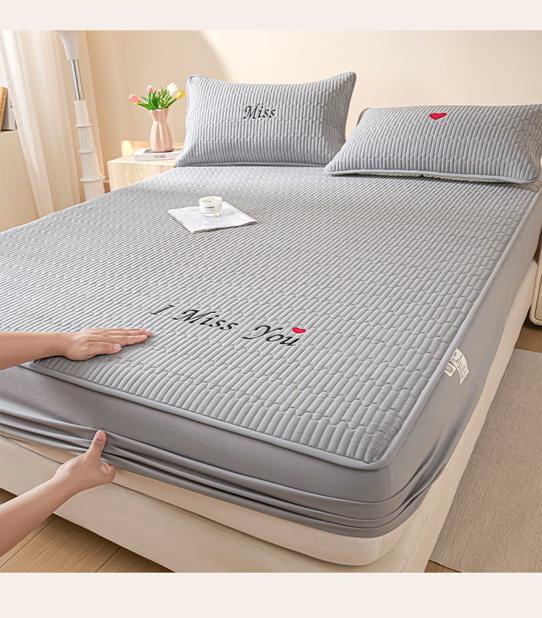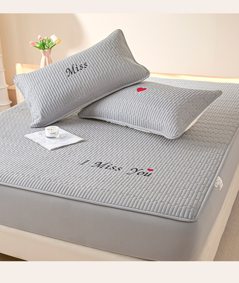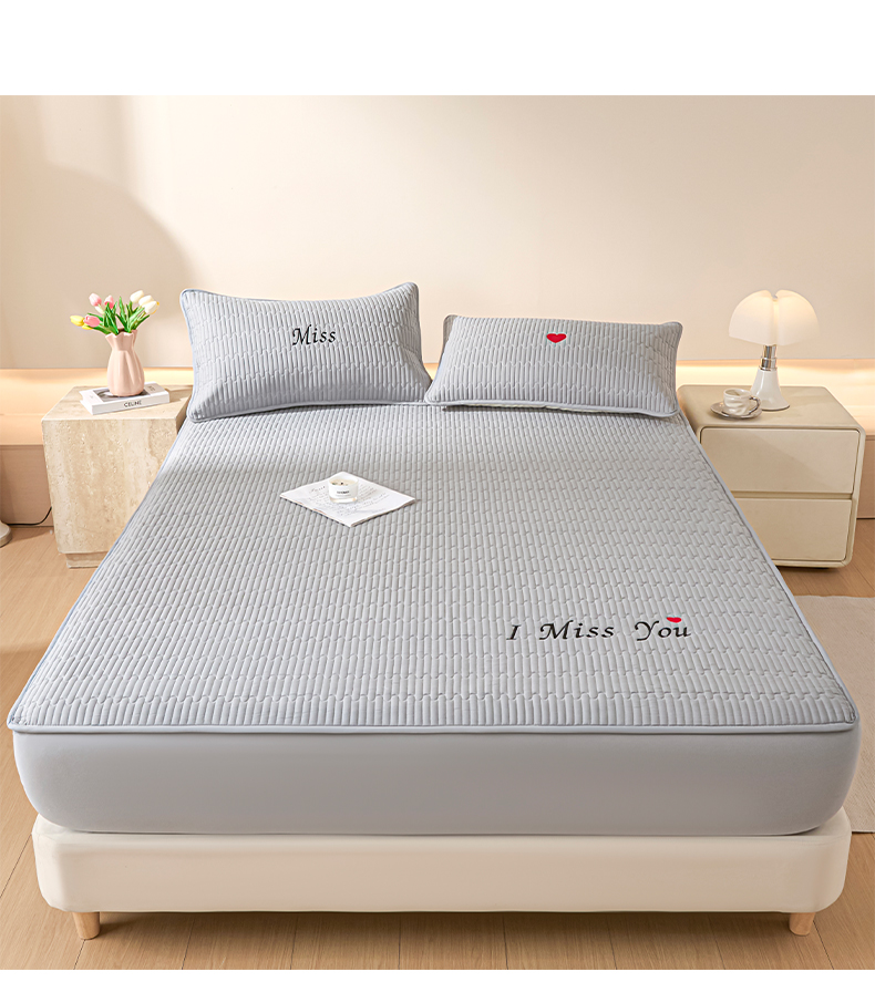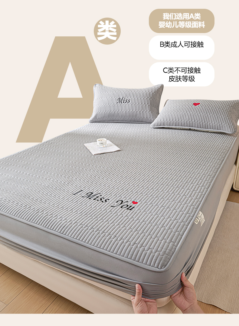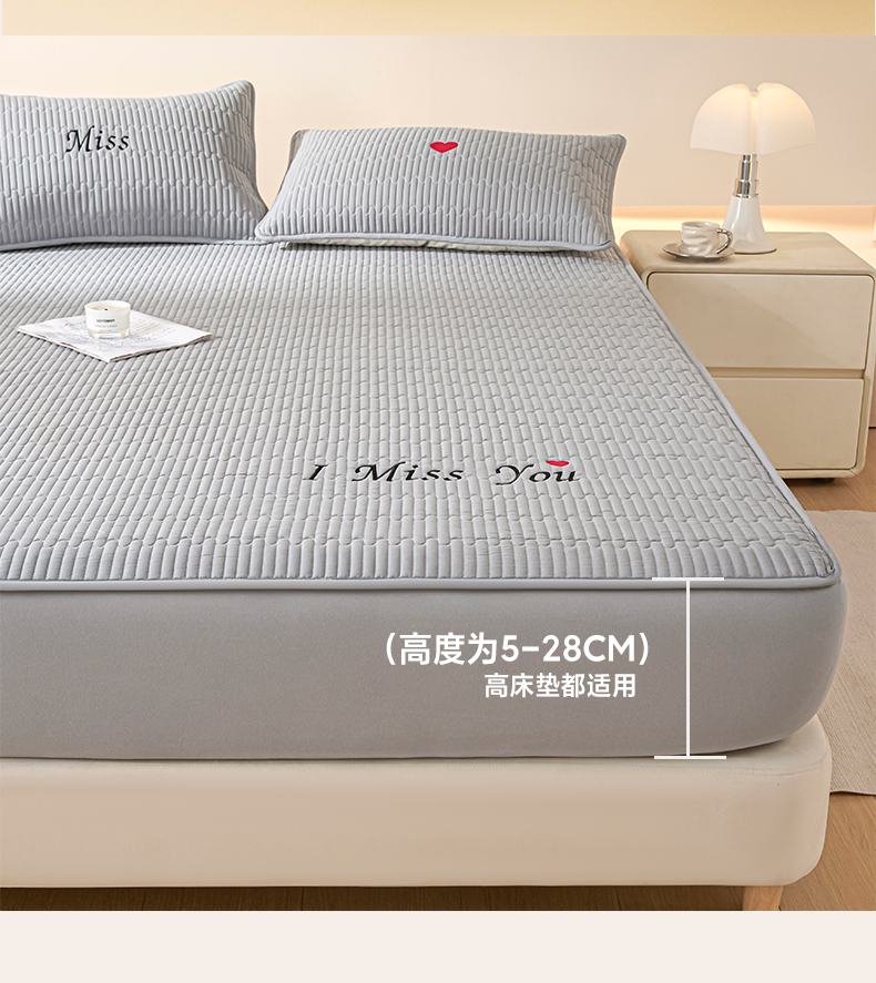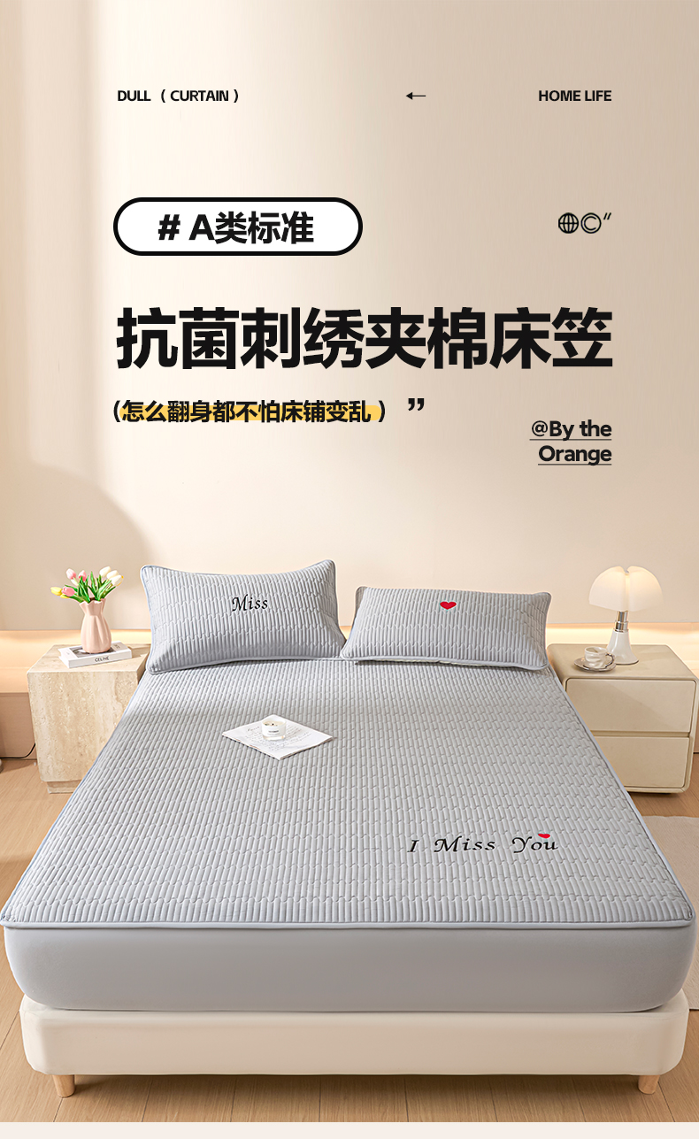 • 91家纺网 家纺一手货源 找家纺 卡伦家纺 2025新款A类刺绣夹棉床笠情书系列 雾灰情书