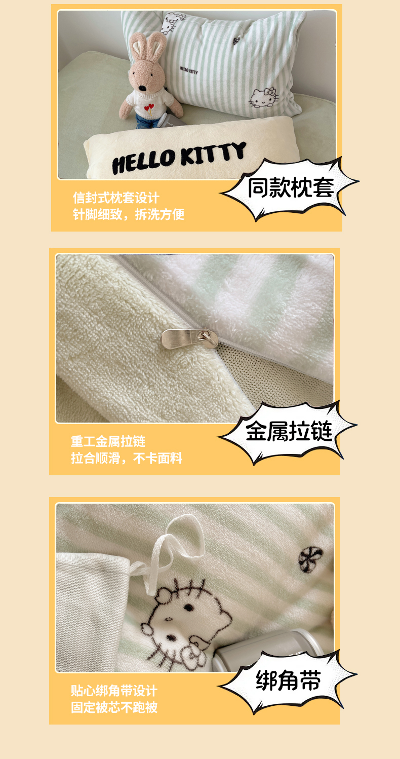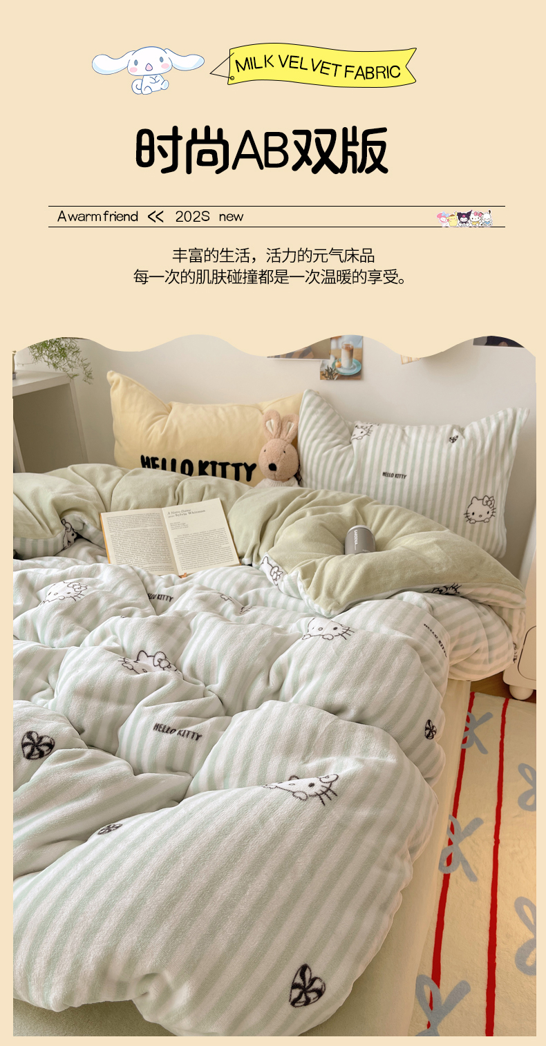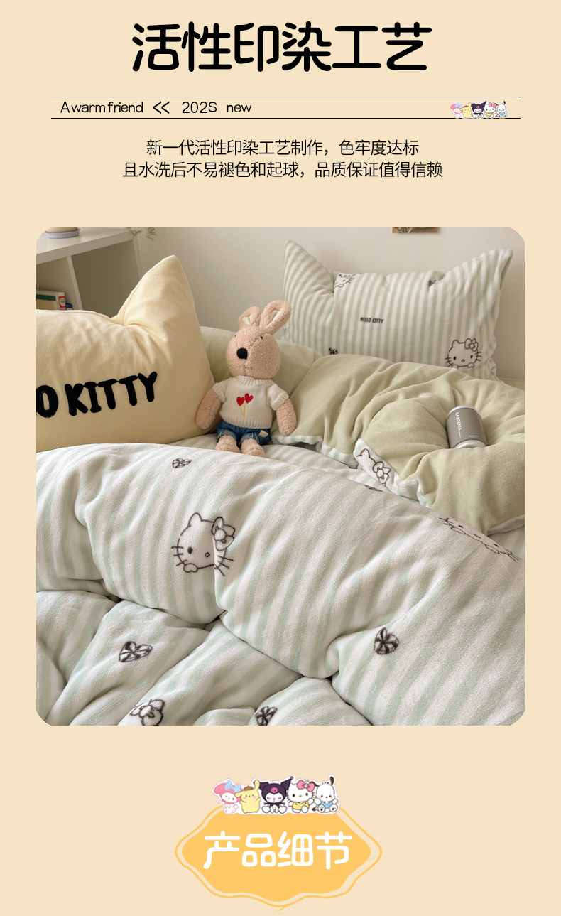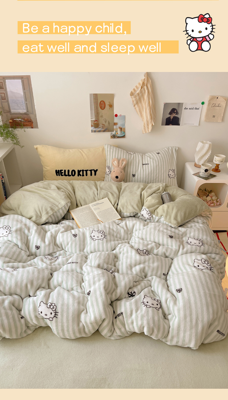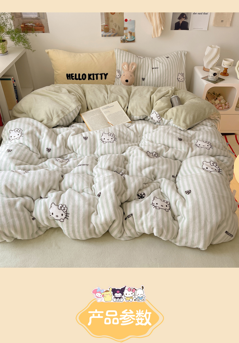 当前位置: 91家纺网 > 商品网购 > 床品套件 > 四件套 > 牛奶绒四件套 > 三朵家纺 2025新款牛奶绒凯蒂猫四件套 可可KT系列 可可KT-绿