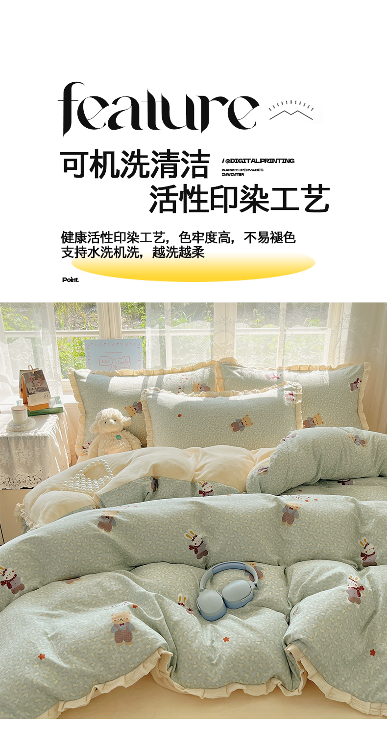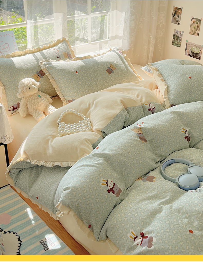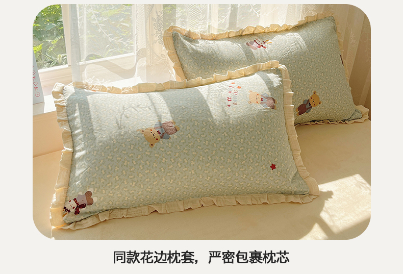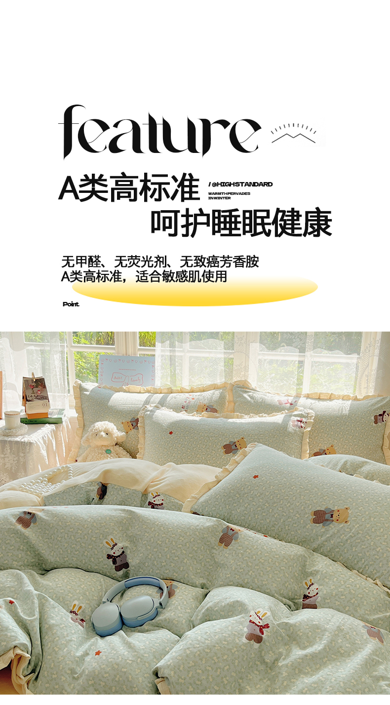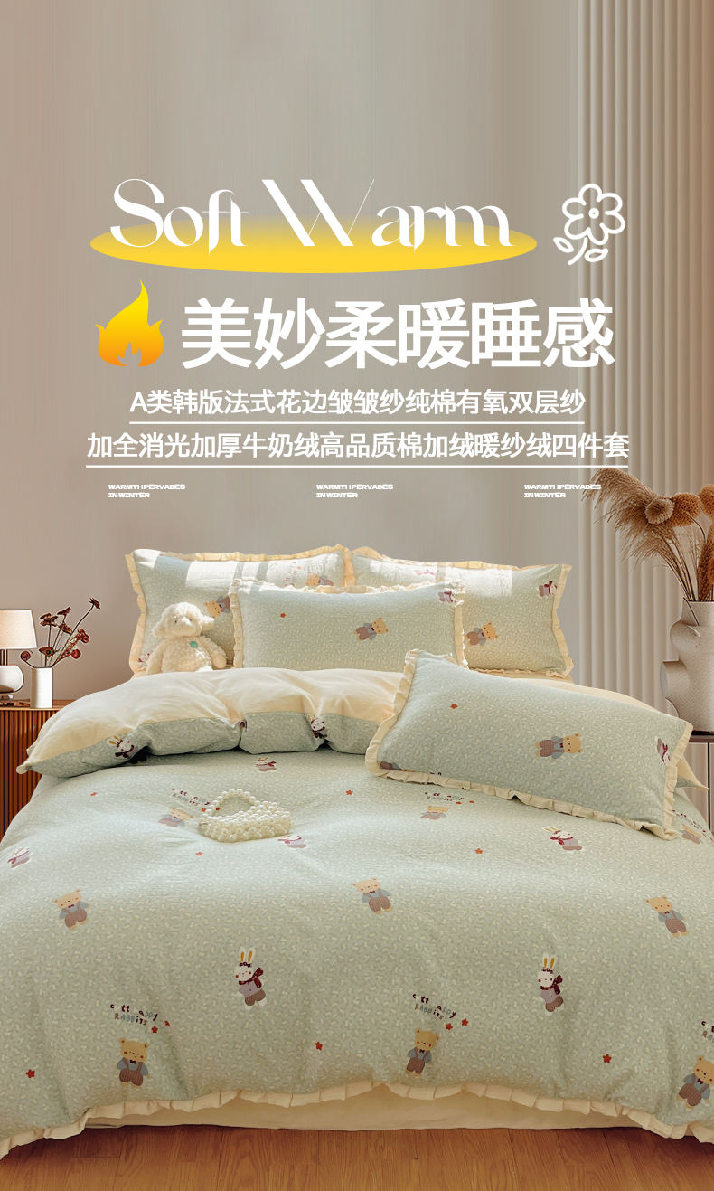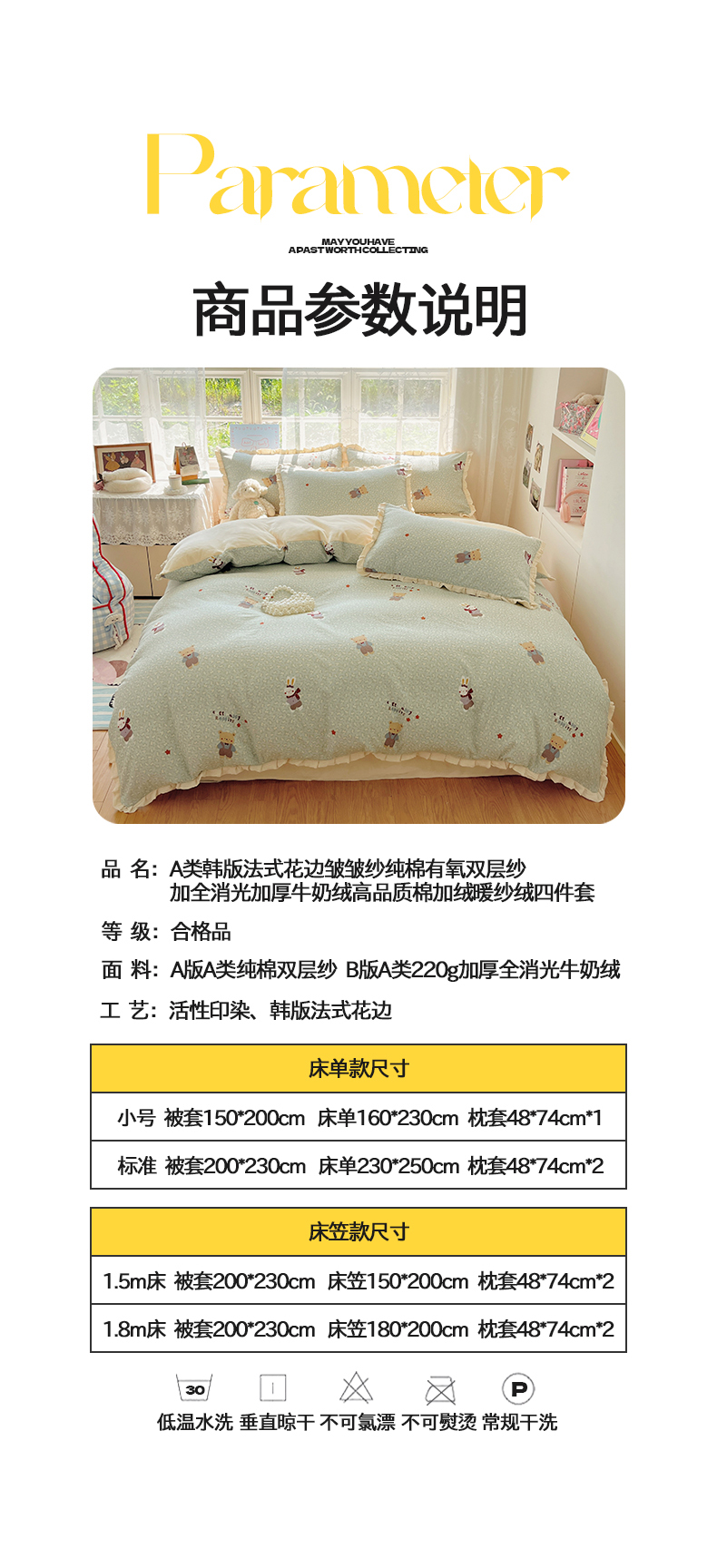 商品名称:桃子家居 2025新款A类韩版花边皱皱纱纯棉有氧双层纱加全消光加厚牛奶绒高品质棉加绒暖纱绒四件套 暖纱绒-小确幸