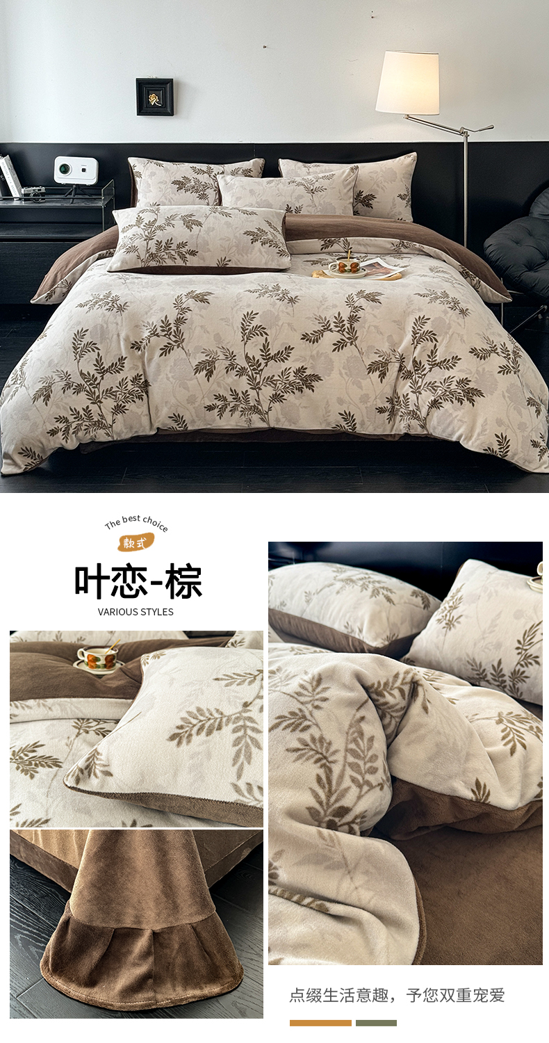 商品名称:子曰 2025新款A类高克重蒂肤绒羊绒保暖印花四件套 叶恋-棕