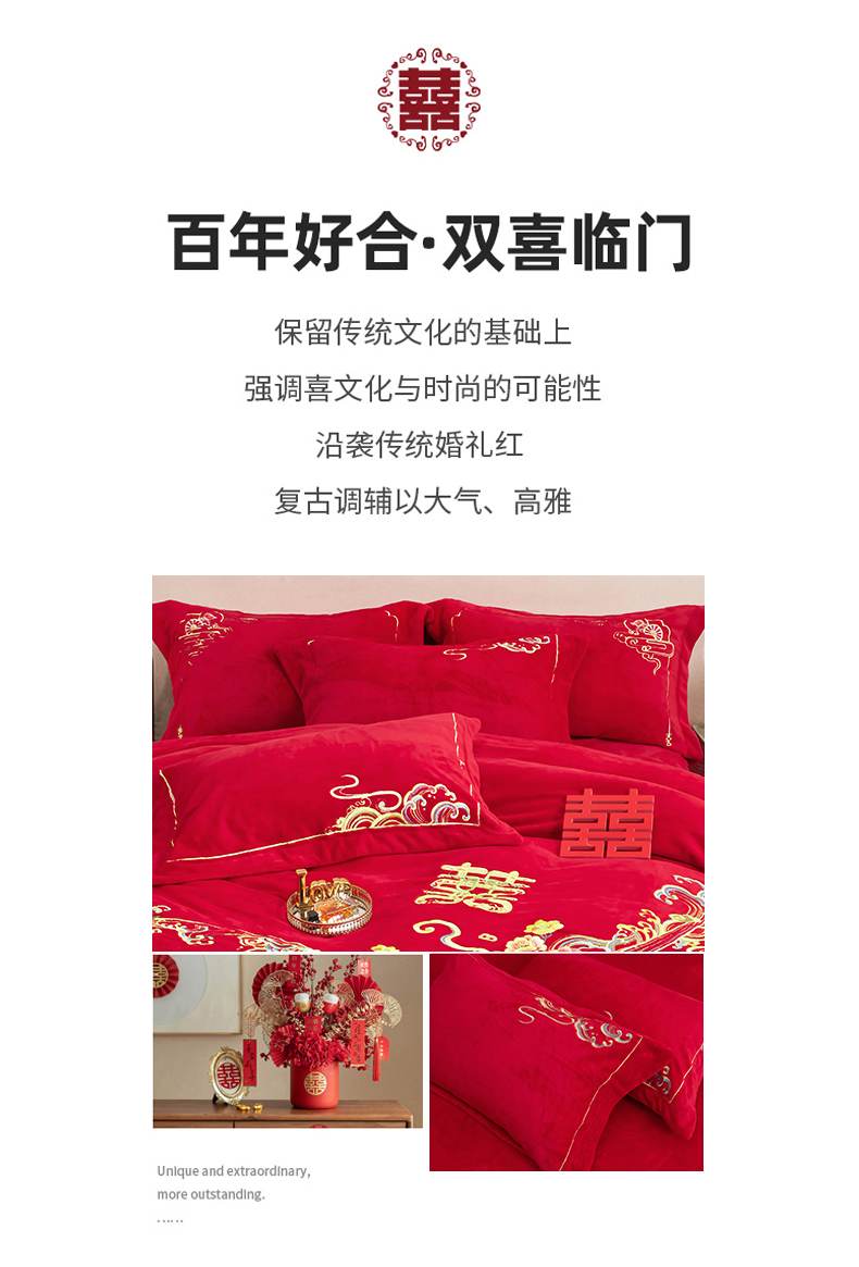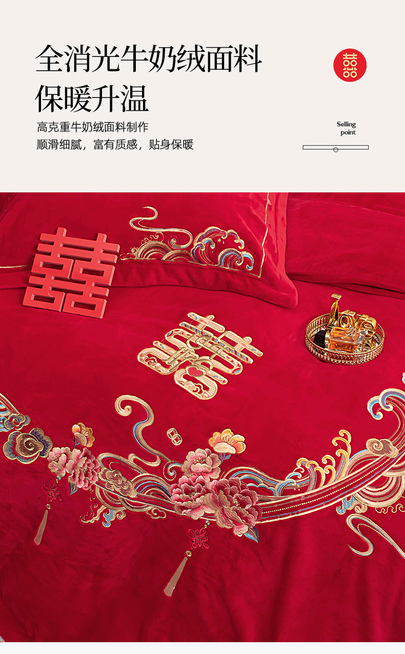 (总)千禧家纺 2024新款双面长绒棉磨毛加厚保暖绣花婚庆套件,大喜大吉,鸿运贺禧,欢乐喜事,欢喜,美满爱情,喜上眉梢,喜约,相伴一生,挚爱