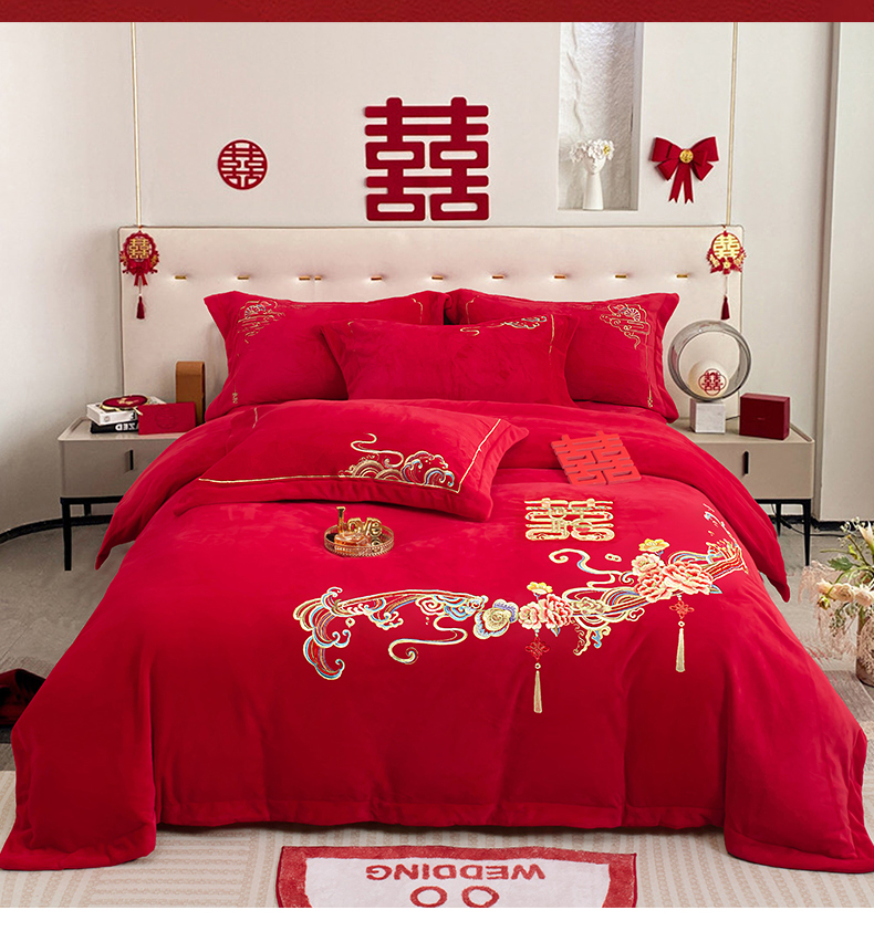 千禧家纺 2025新款加厚高克重全消光牛奶绒刺绣婚庆四件套 福禧生财