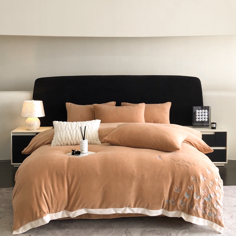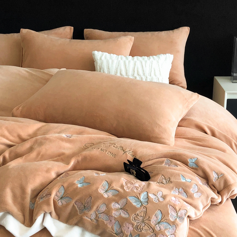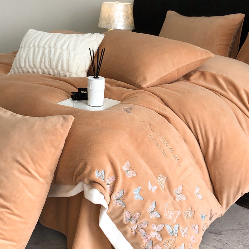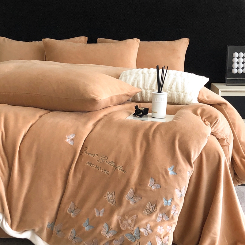 商品名称:新印象 2025秋冬新款宽边高克重牛奶绒绣花款四件套 蝶之舞-橙