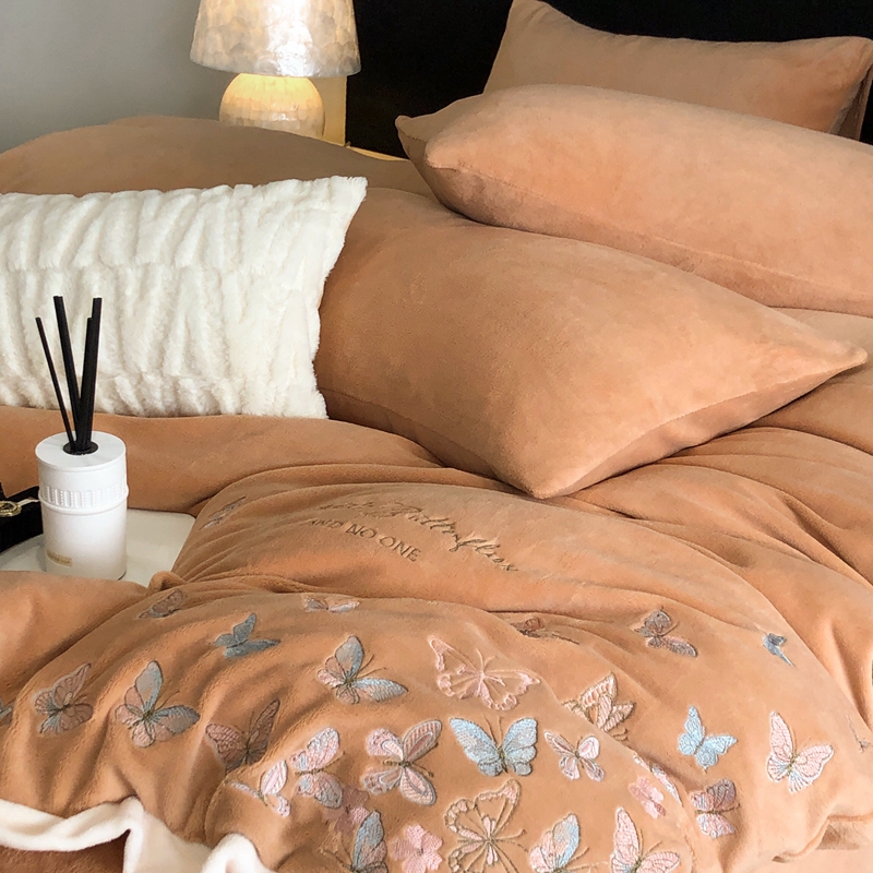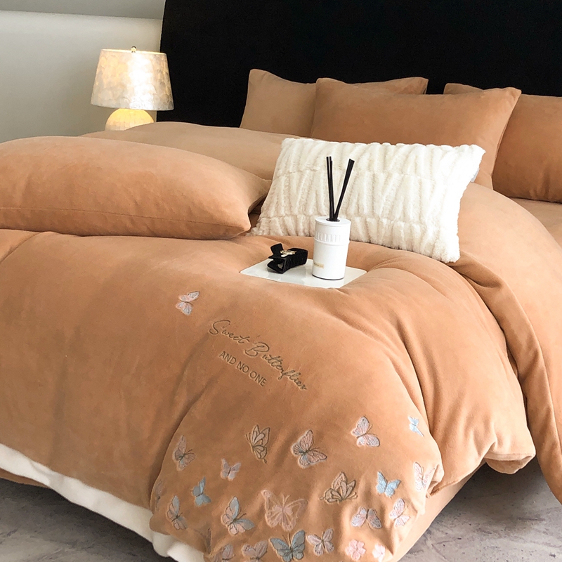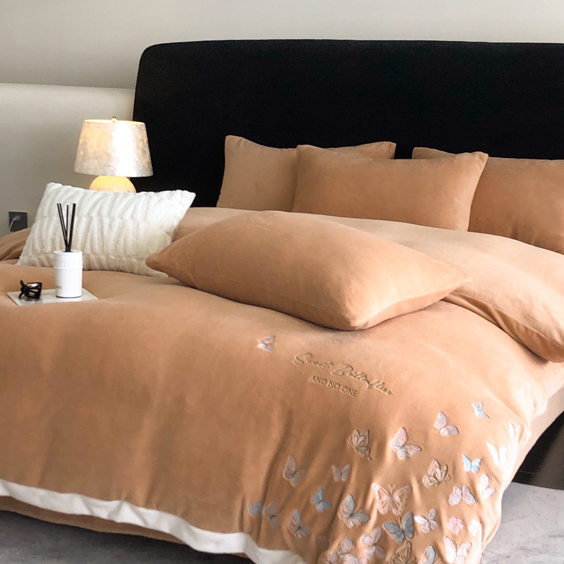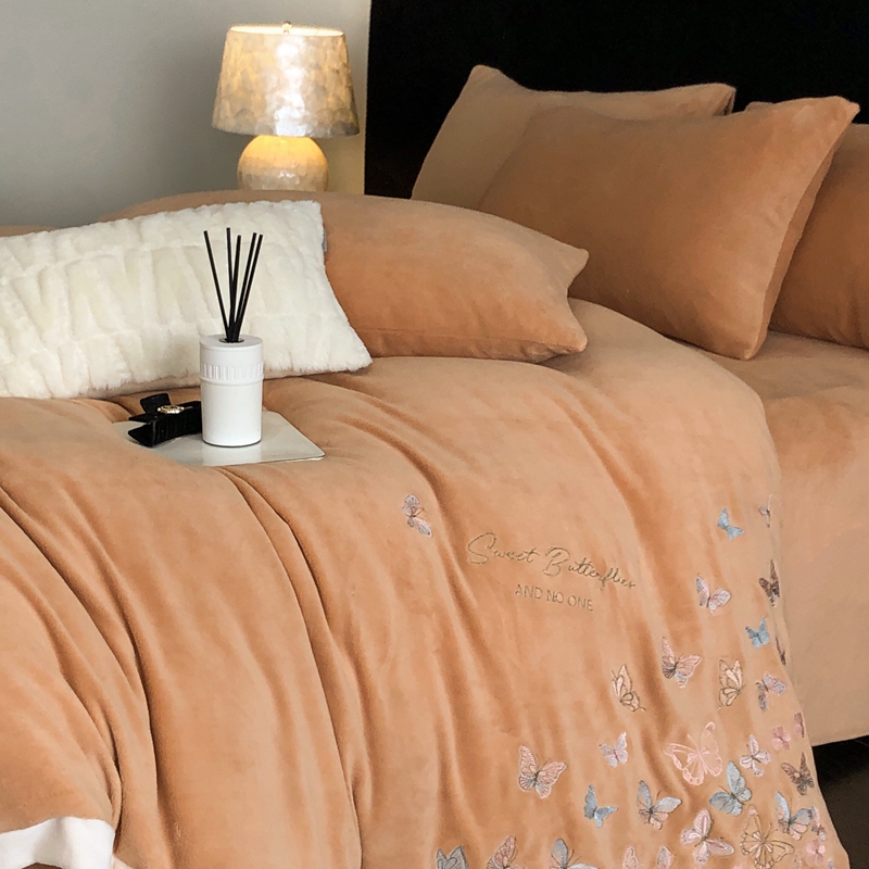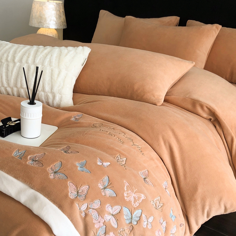 新印象 2025秋冬新款宽边高克重牛奶绒绣花款四件套 蝶之舞-橙