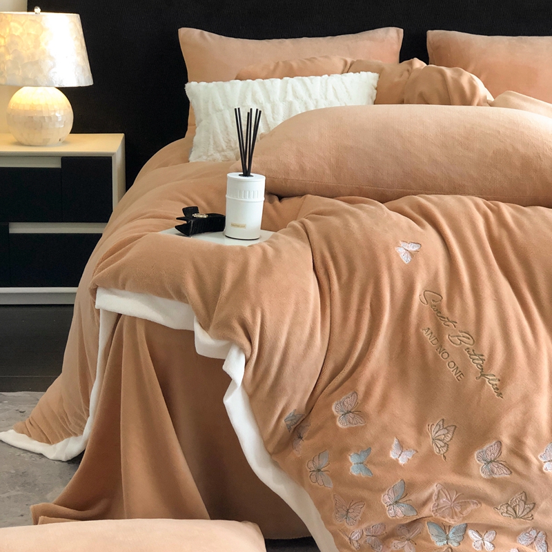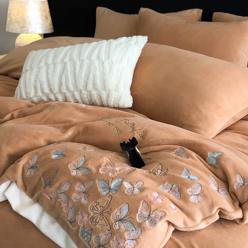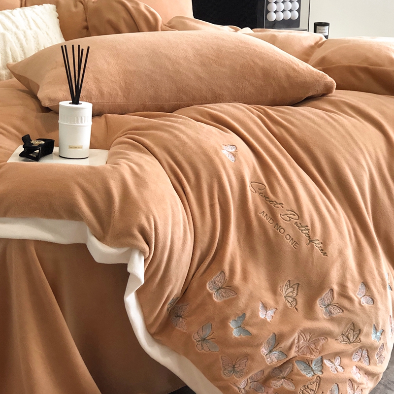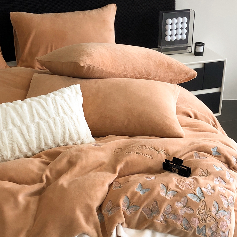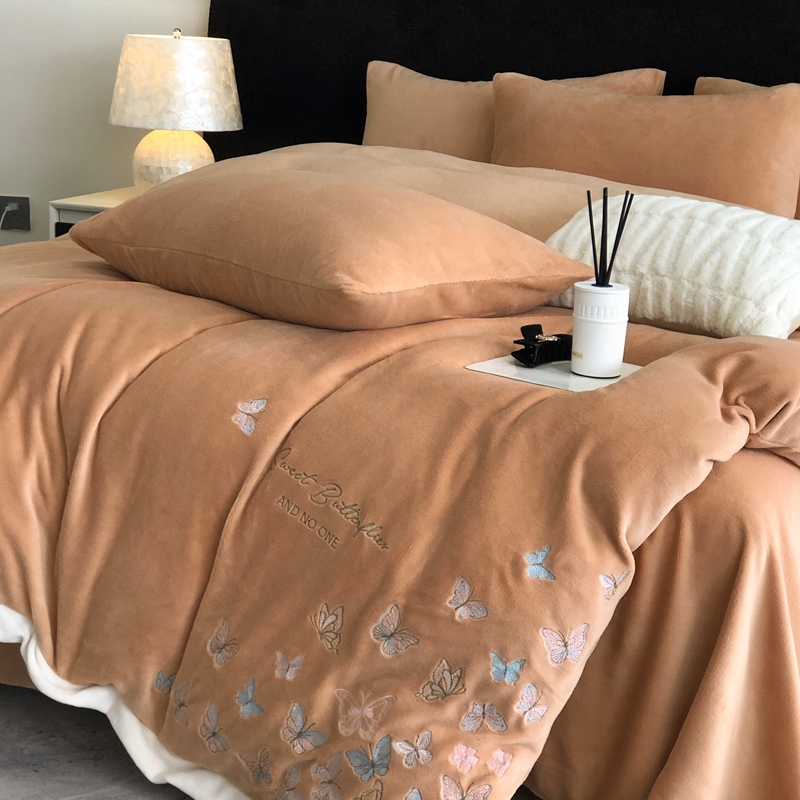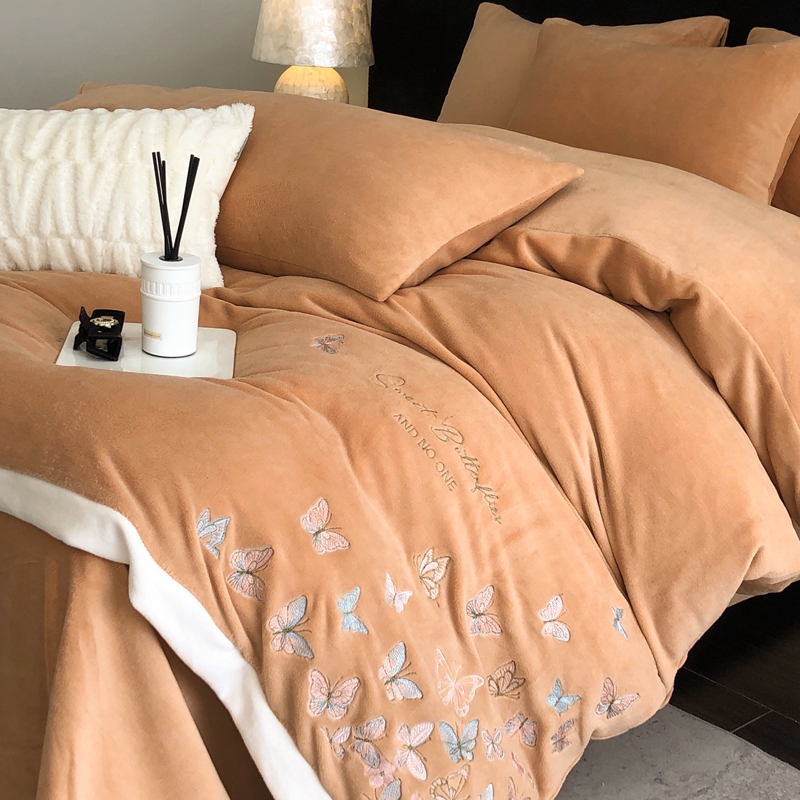 新印象 2025秋冬新款宽边高克重牛奶绒绣花款四件套 蝶之舞-橙