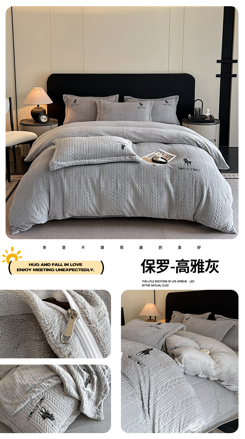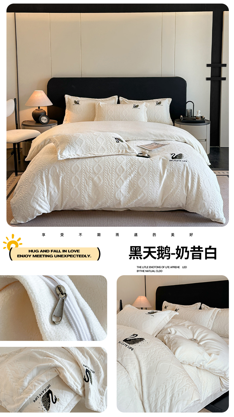 商品名称:(总)爱家(原缔乐家纺) 2025新款A类牛奶雕花绒四件套 保罗-黑天鹅系列(床盖加20)