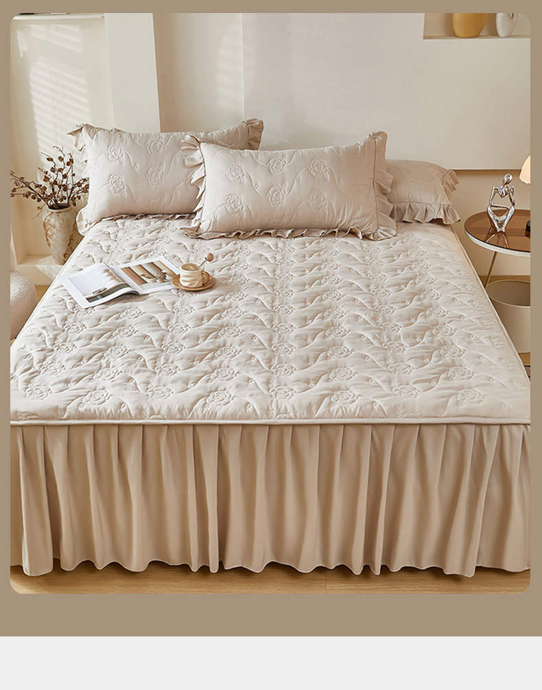 瑞兴纺 2025新款水洗磨毛夹棉床裙三件套系列-繁花 繁花-卡其色