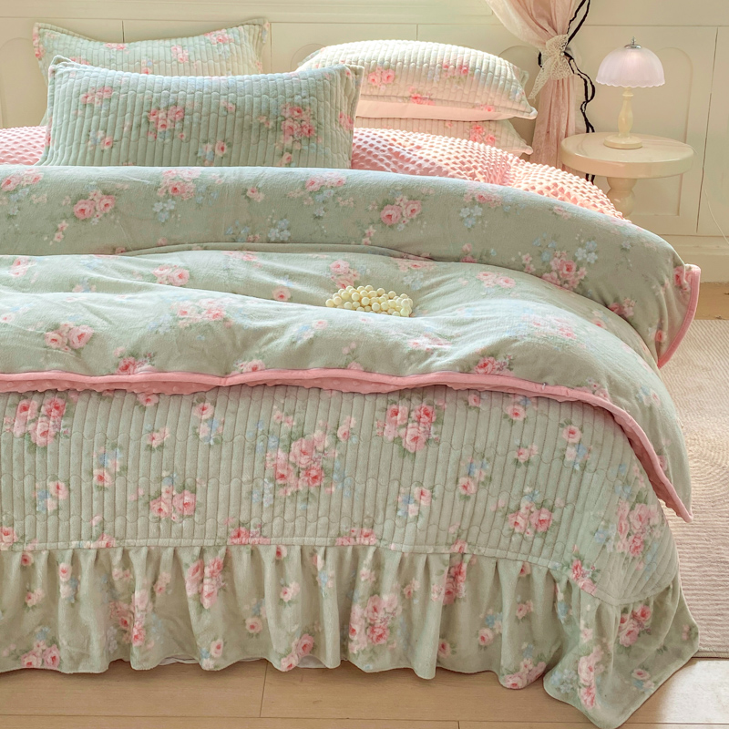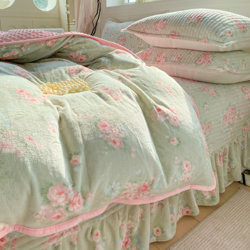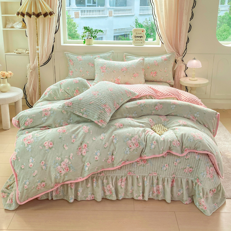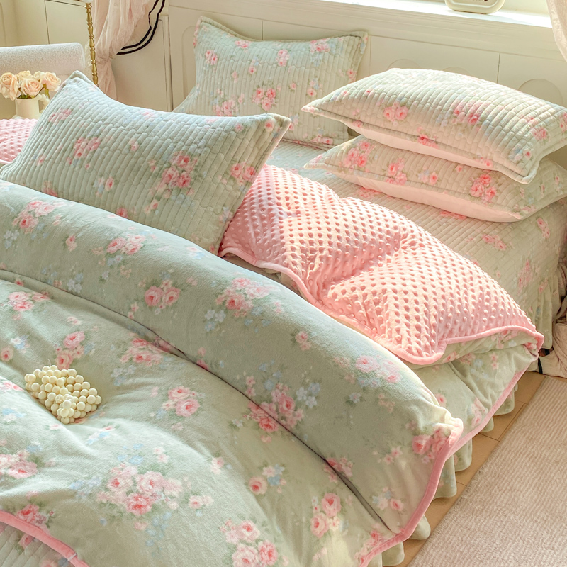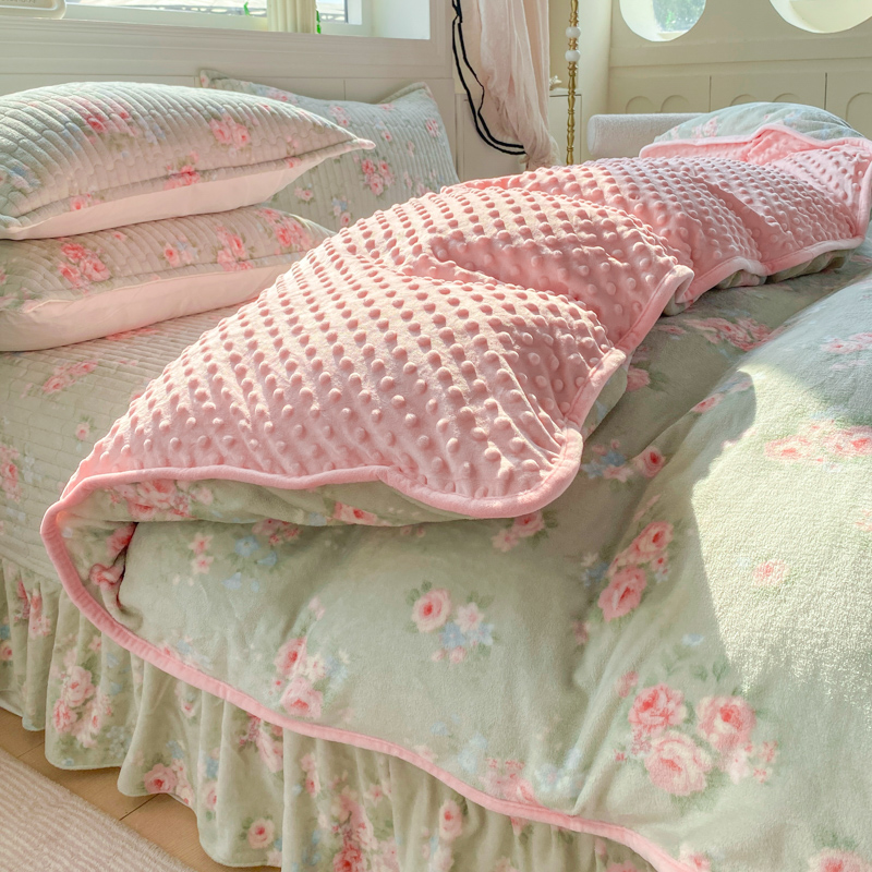 商品名称:尚美 2025新款豆豆绒牛奶绒大花边床盖四件套(床盖花边随机) 花语玫瑰