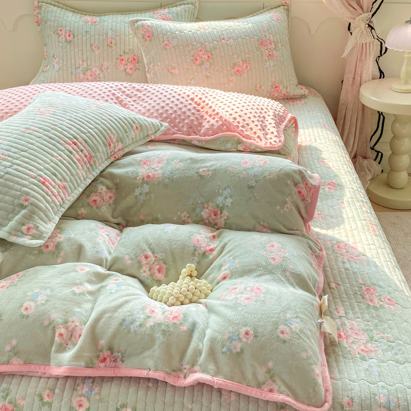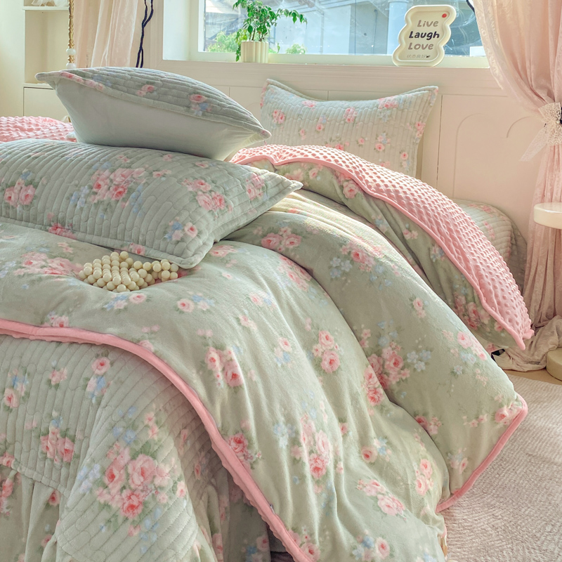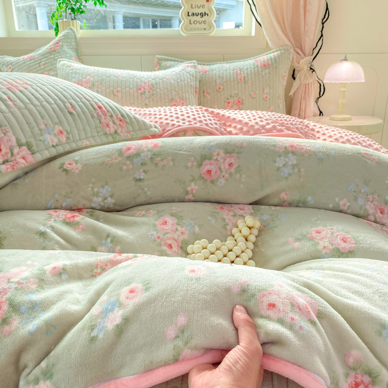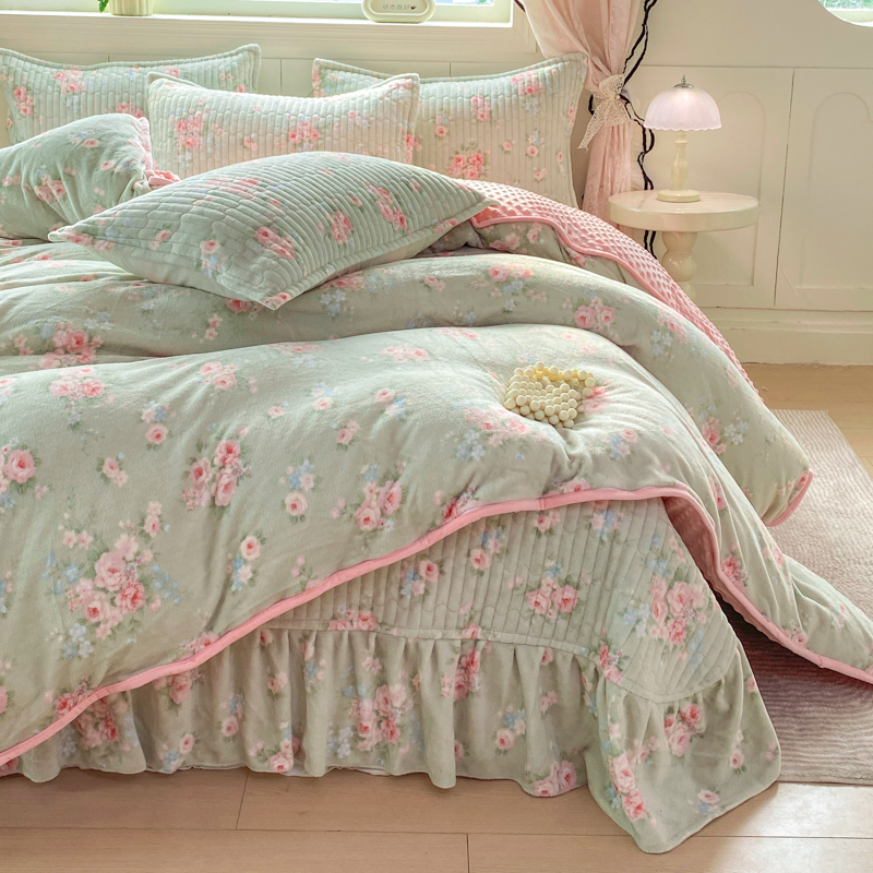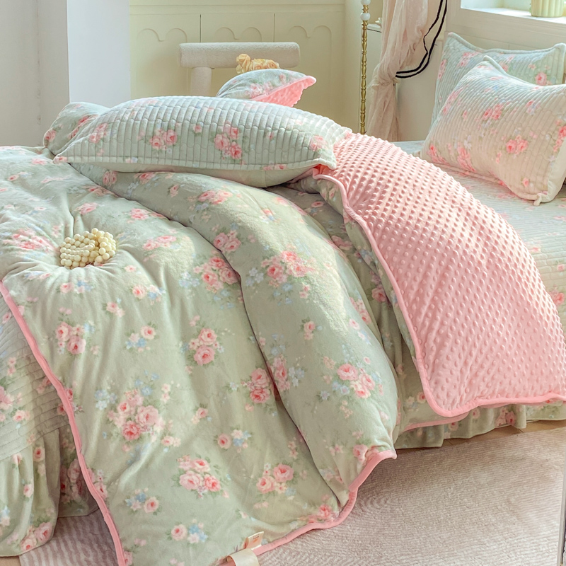 商品名称:尚美 2025新款豆豆绒牛奶绒大花边床盖四件套(床盖花边随机) 花语玫瑰