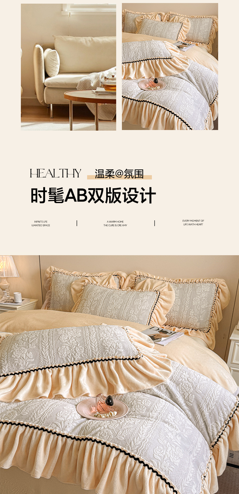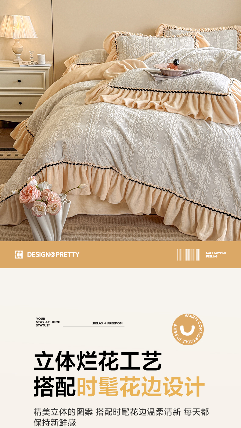 商品名称:民新家纺 2025新款牛奶绒烂花花边款四件套 臻爱花园 -浅灰