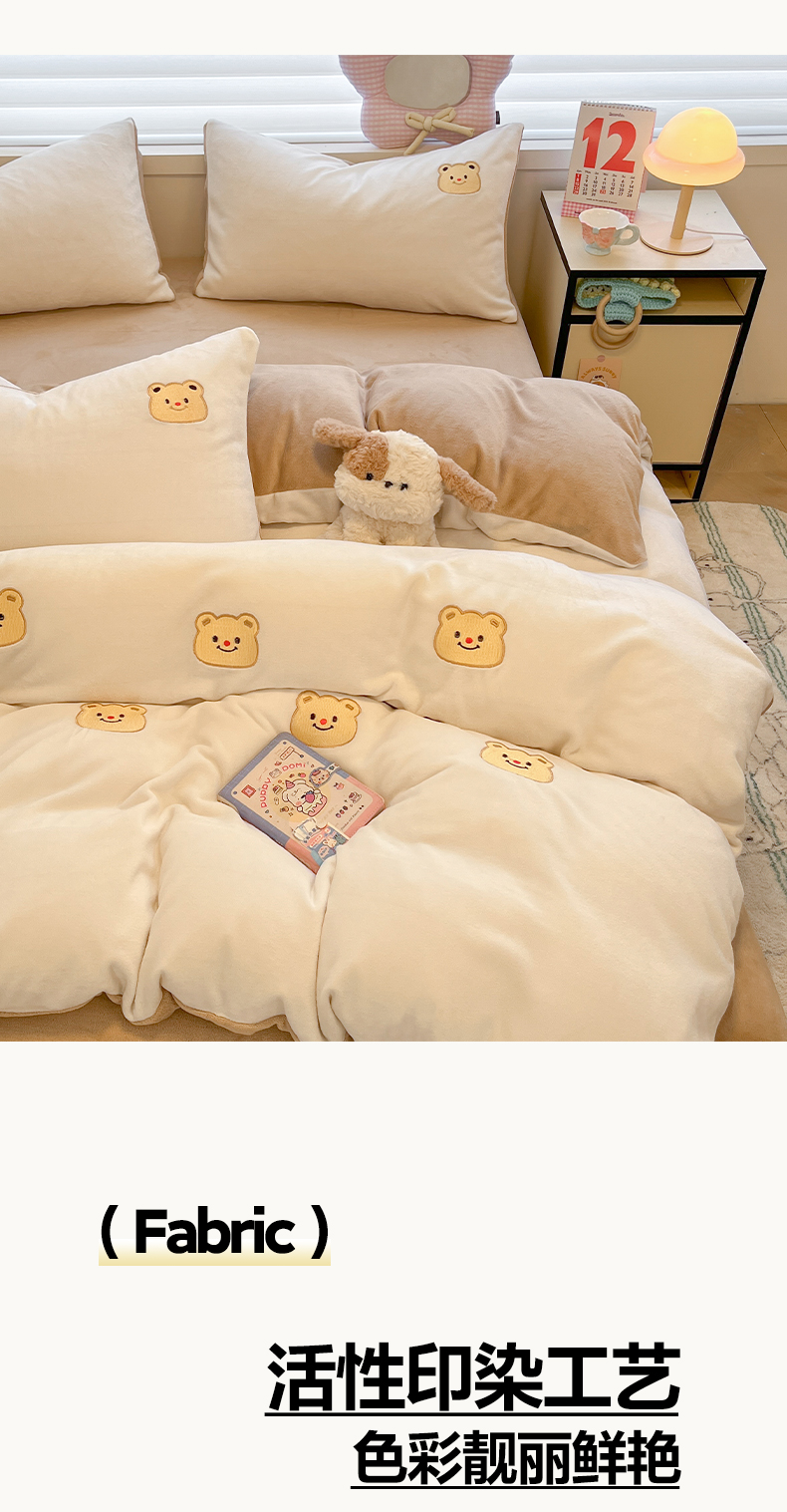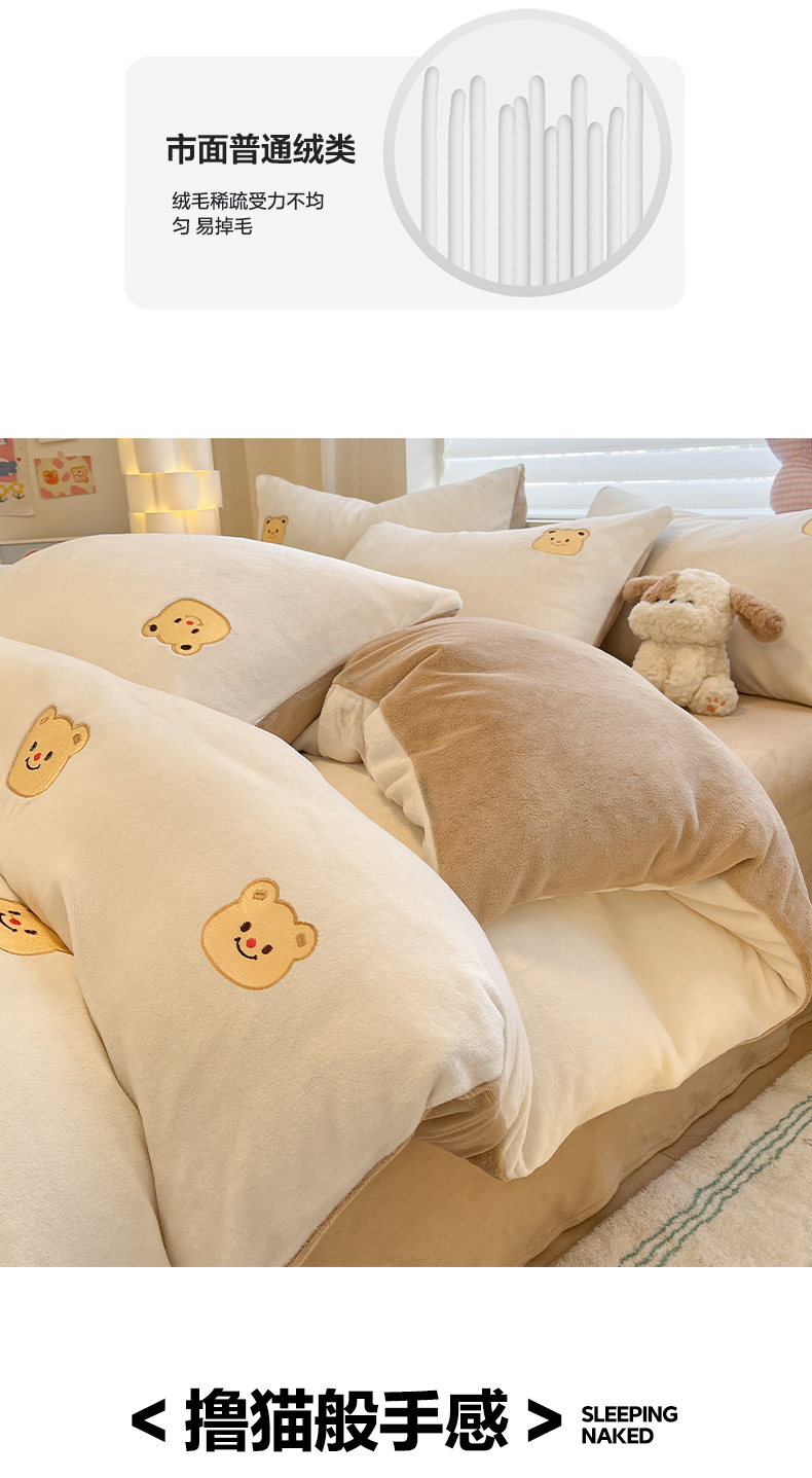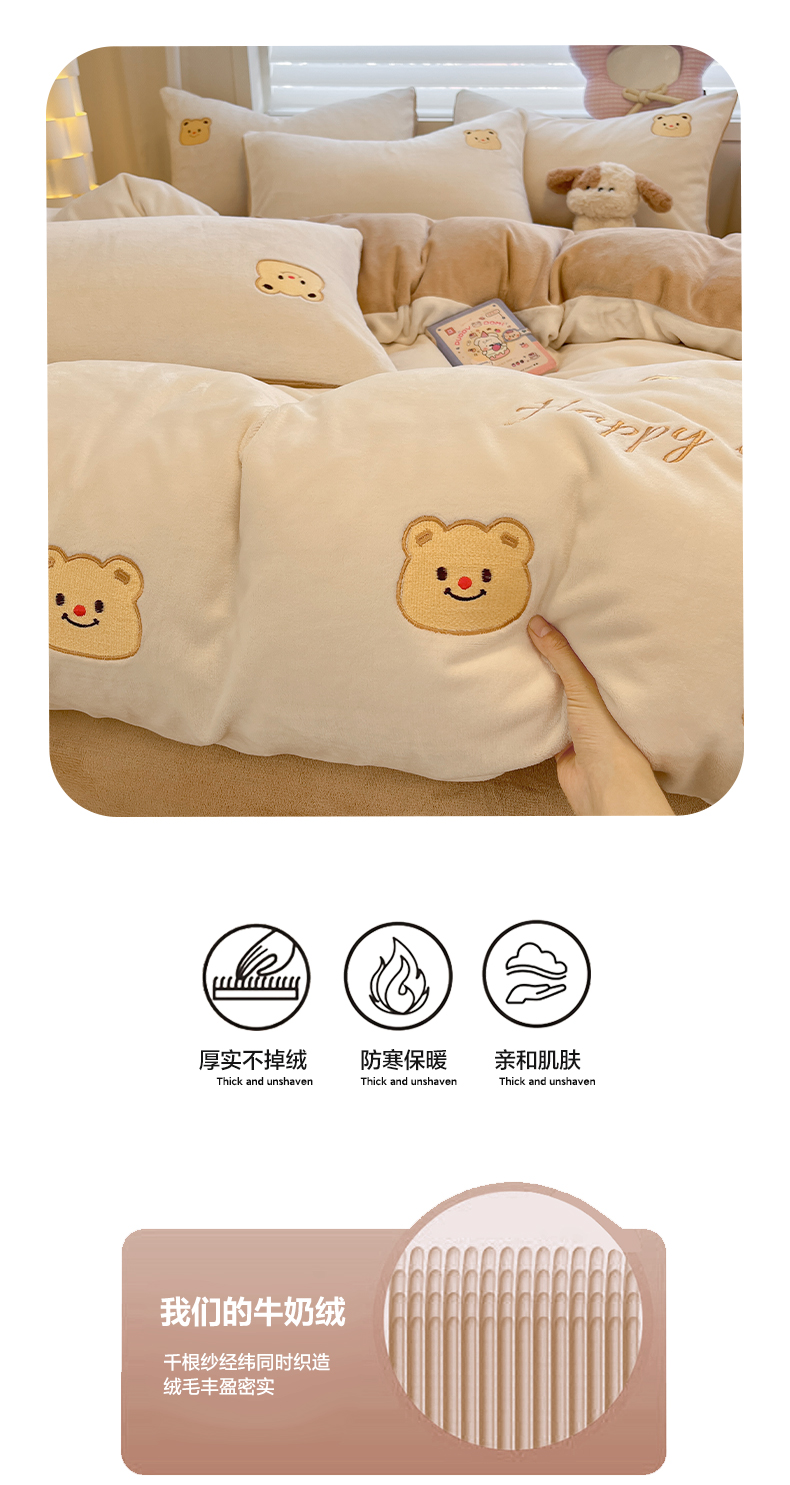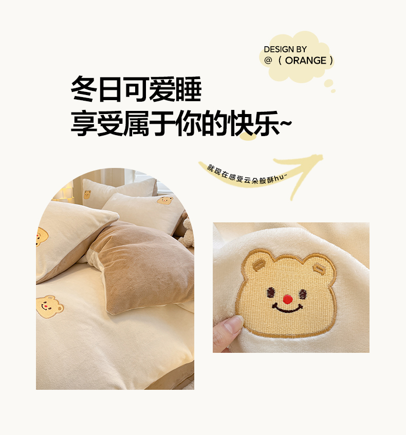 如一 2025新款200克缸染高克重精绣牛奶绒四件套 绒-奶油熊-白咖