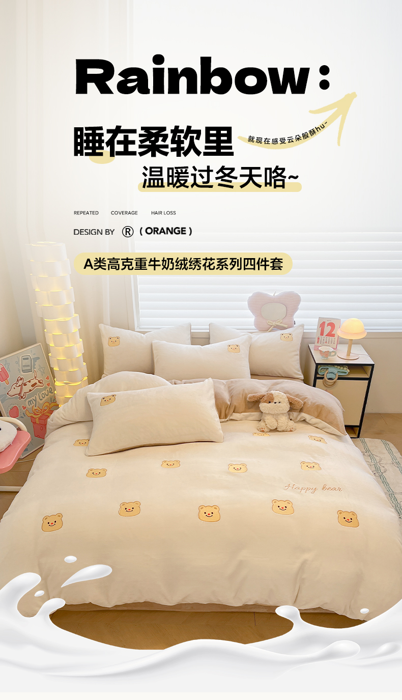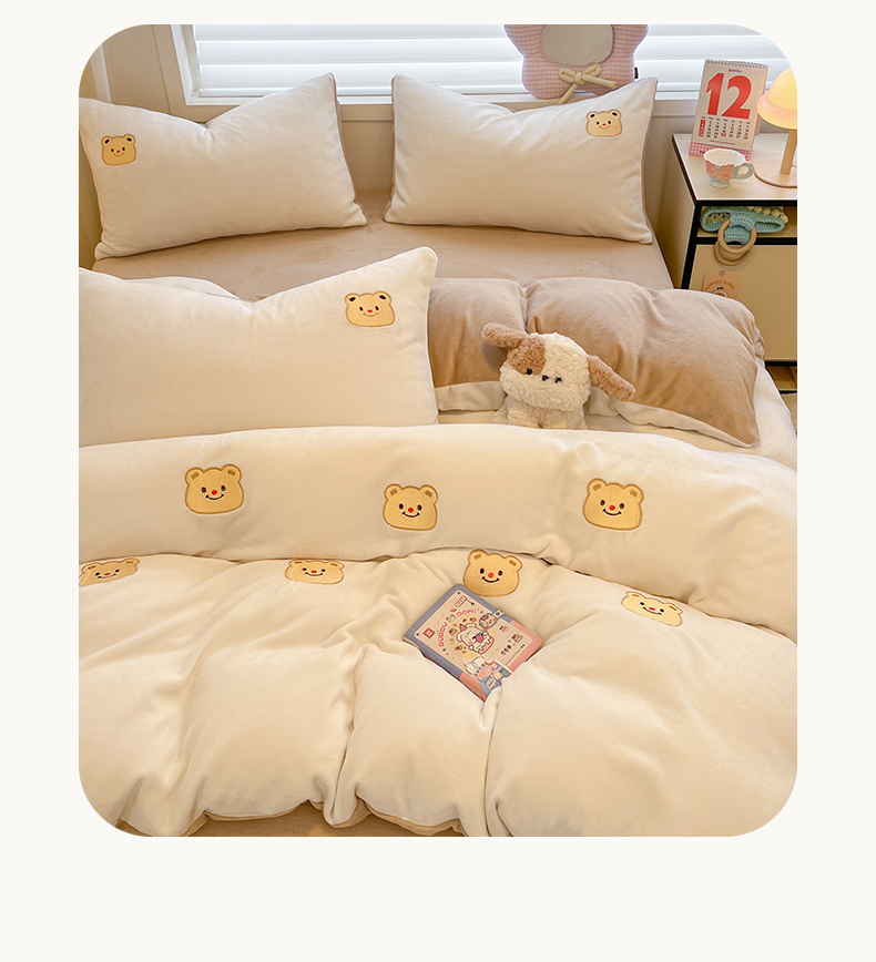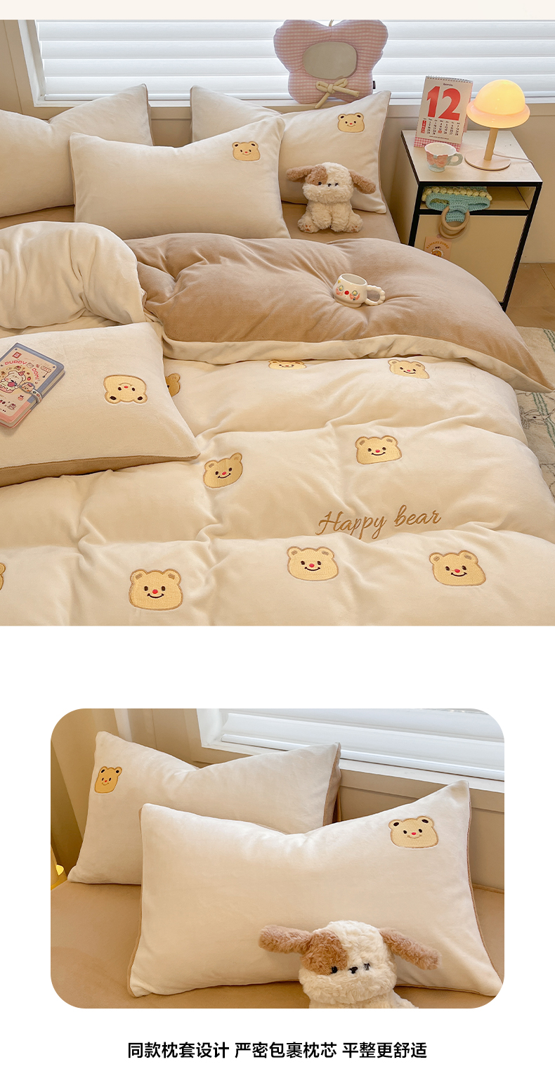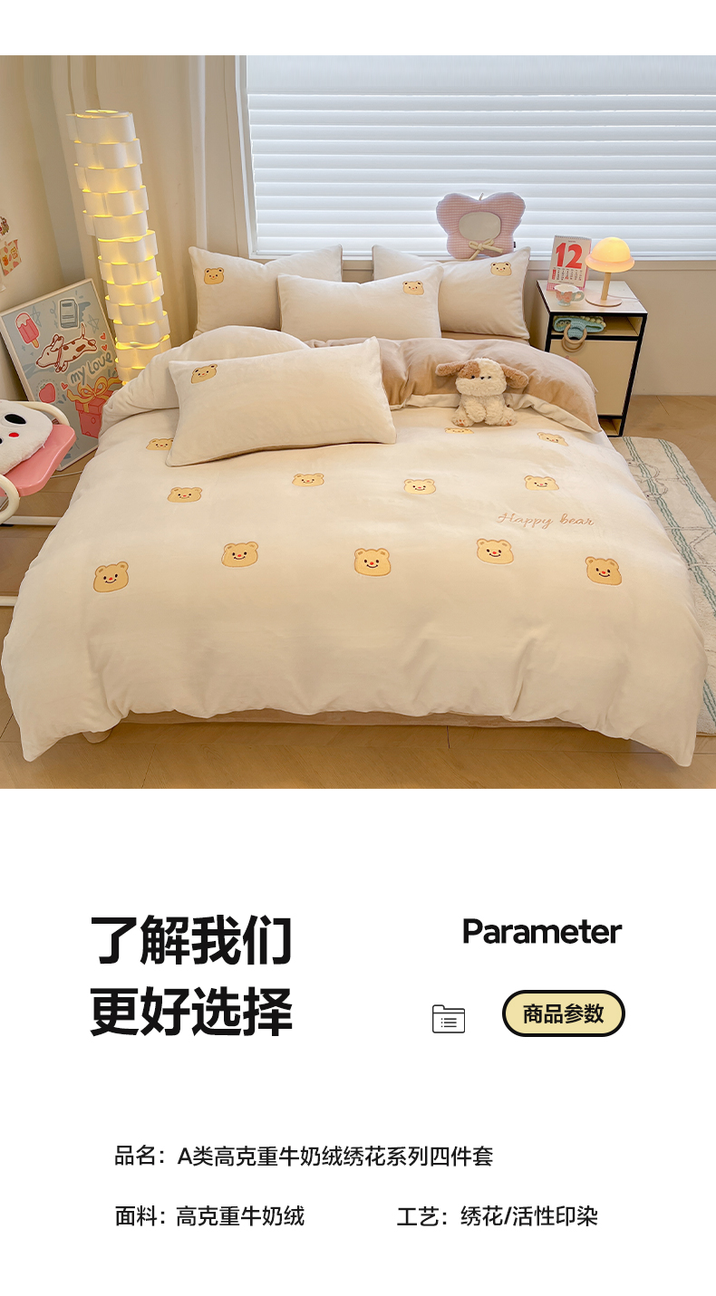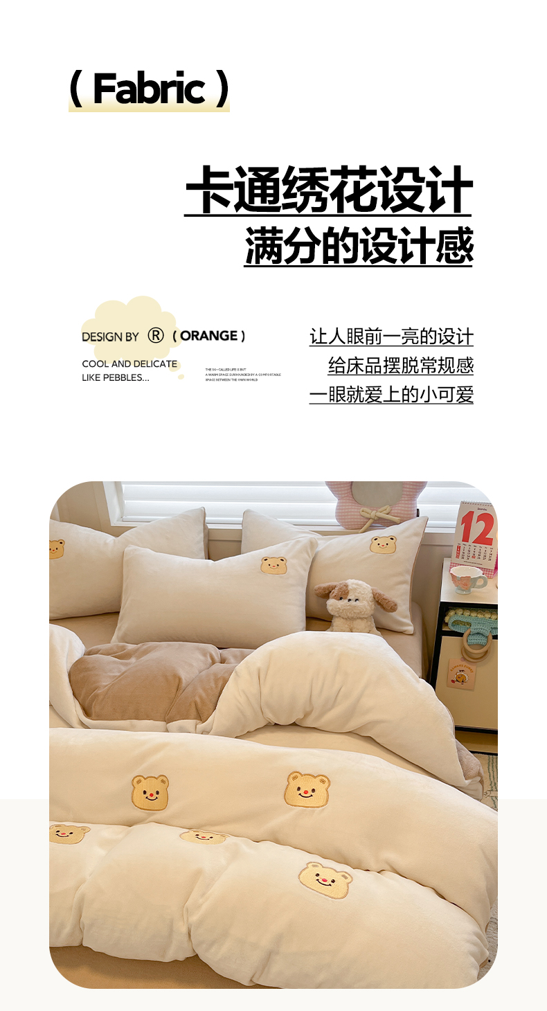如一 2025新款200克缸染高克重精绣牛奶绒四件套 绒-奶油熊-白咖
