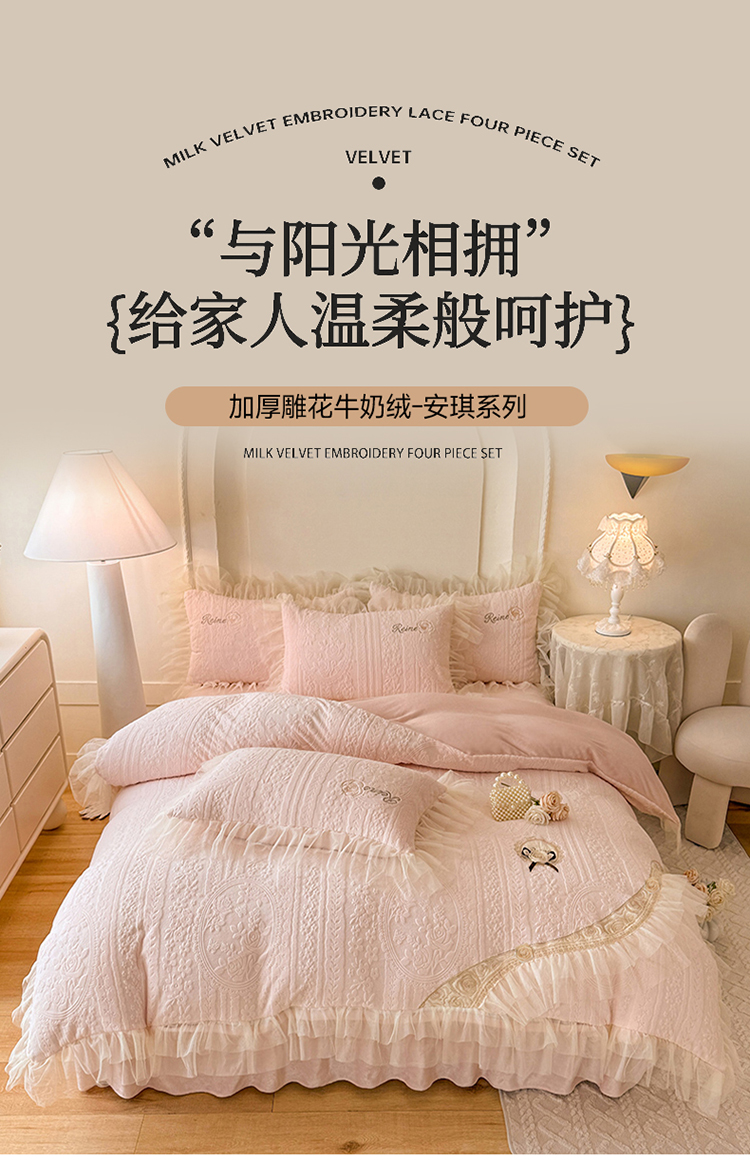 商品名称:2026漫布云纺360g全消光牛奶绒工艺款蕾丝盘花立体雕花绒牛奶绒四件套刺绣绣花套件 安琪-奶油白