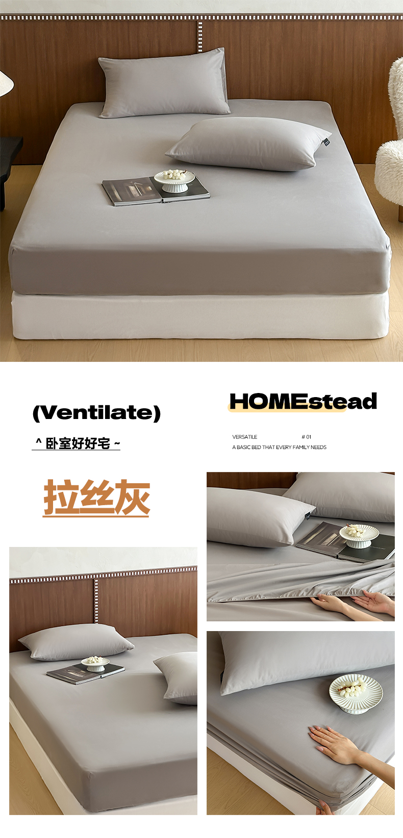 商品名称:三味舒屋 2025新款50支磨毛长绒棉纯棉纯色单床笠床笠单件-长期主义 拉丝灰
