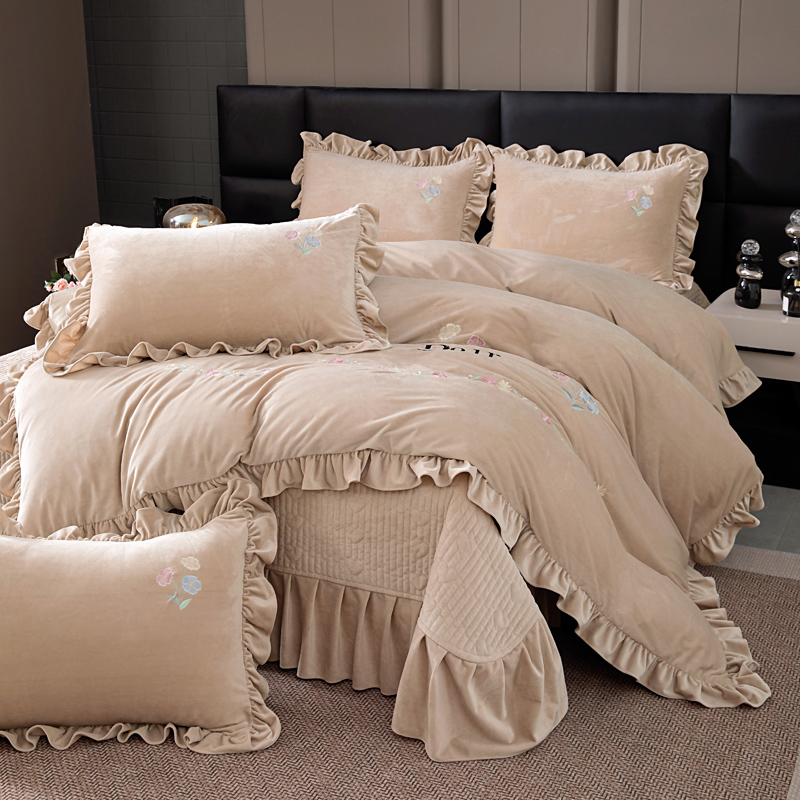 畅畅家纺 2025新款宝宝绒绣花床盖四件套婴儿绒纯色牛奶绒四件套 卡其