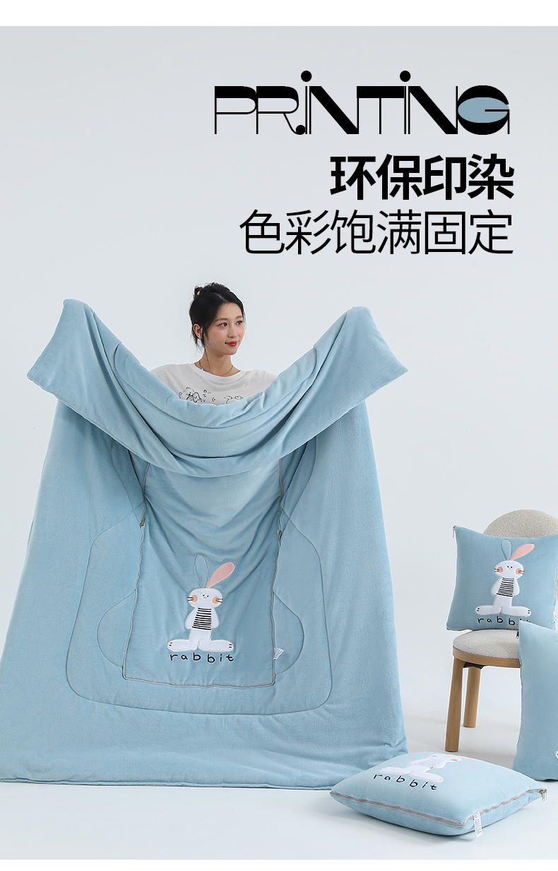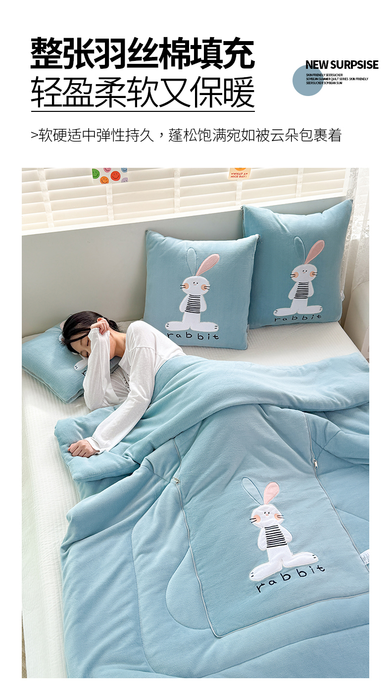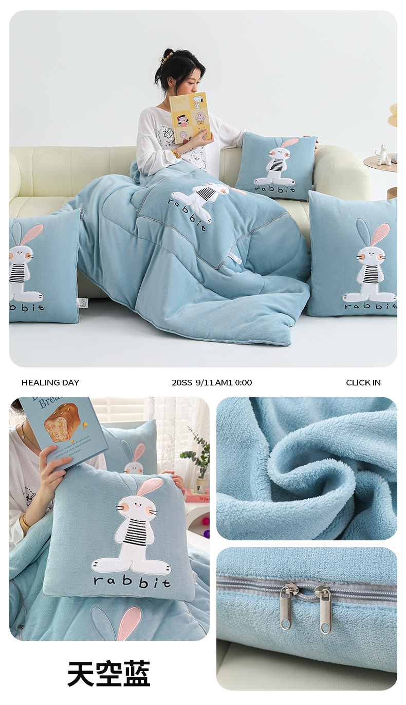 翰轩家居 2025新款卡通牛奶绒贴布绣抱枕被-梦幻兔系列 梦幻兔-天空蓝