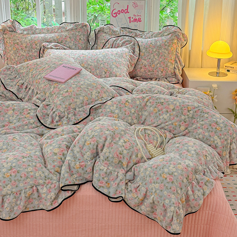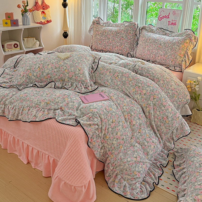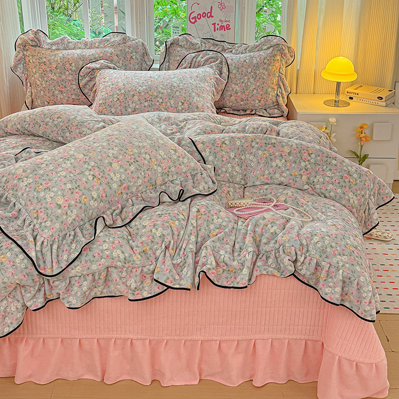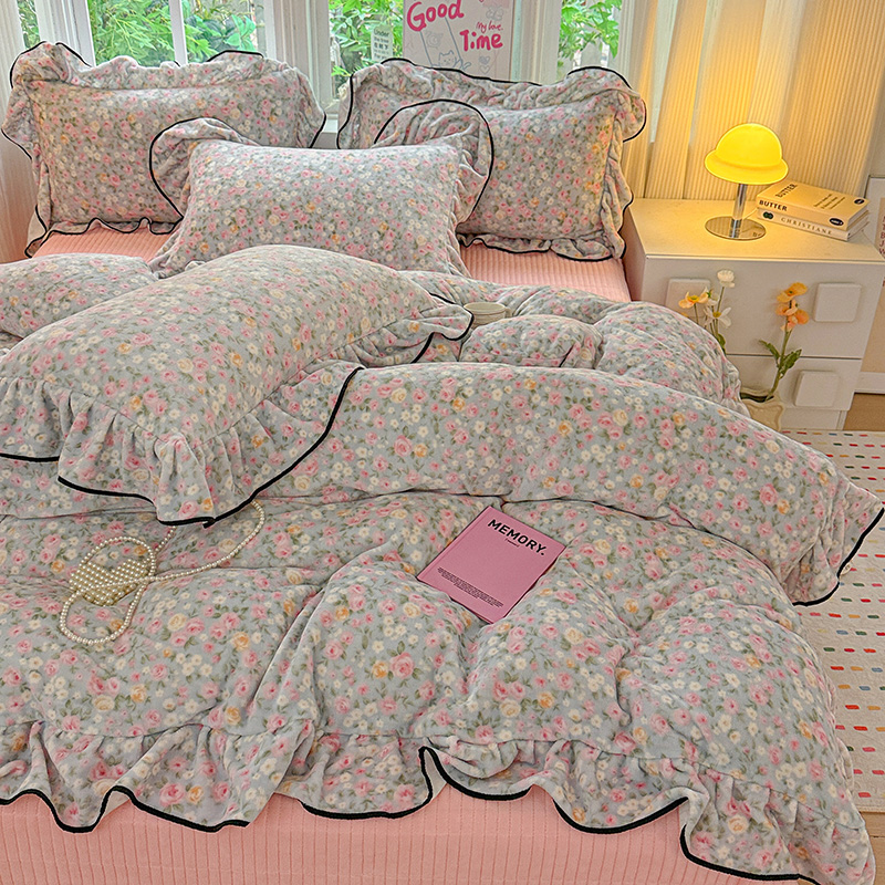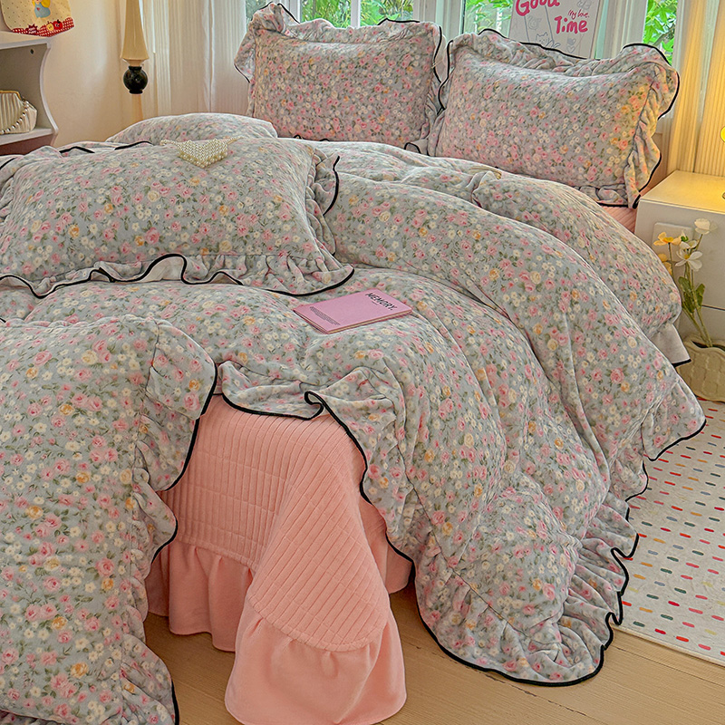 梦莱斯 2025新款加厚保暖双面牛奶绒四件套-黑色花边款 春不晚