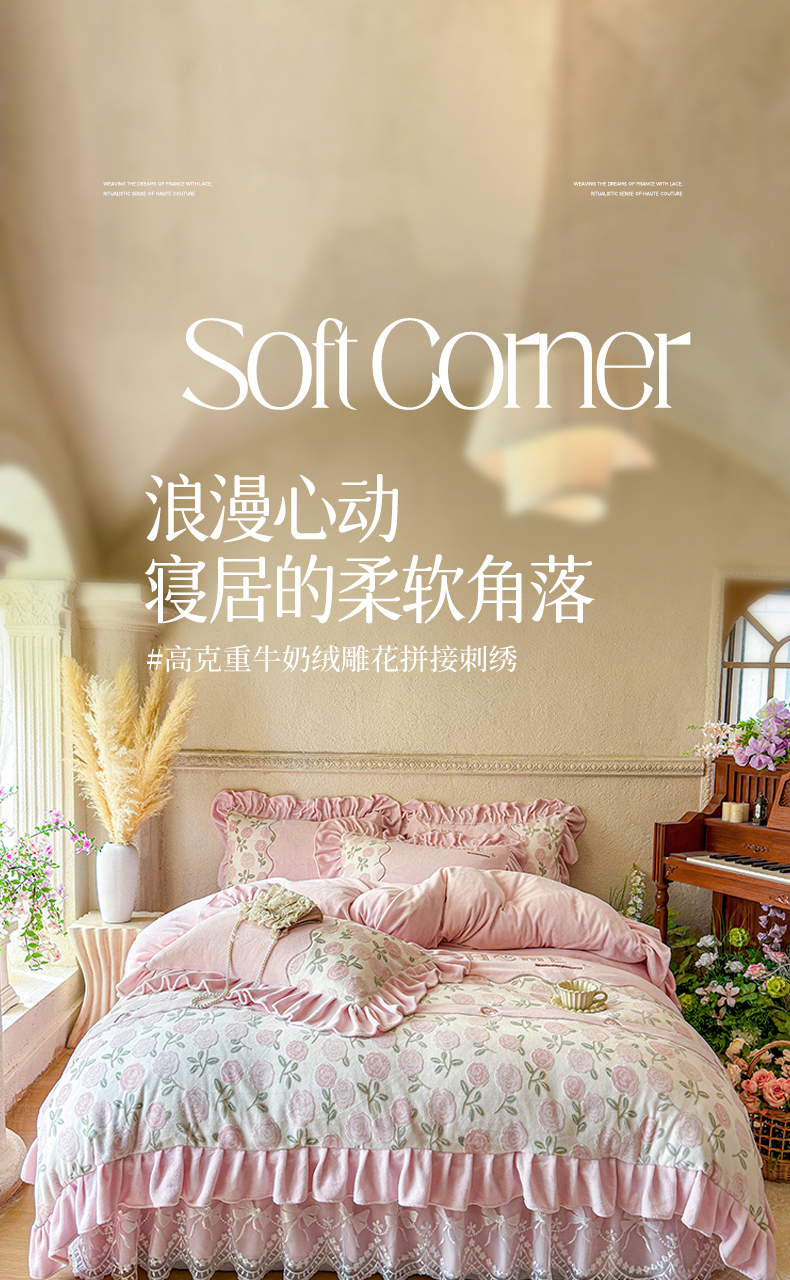 商品名称:宜凡家纺 2025新款牛奶绒雕花拼接刺绣床裙四件套 花野漫屿