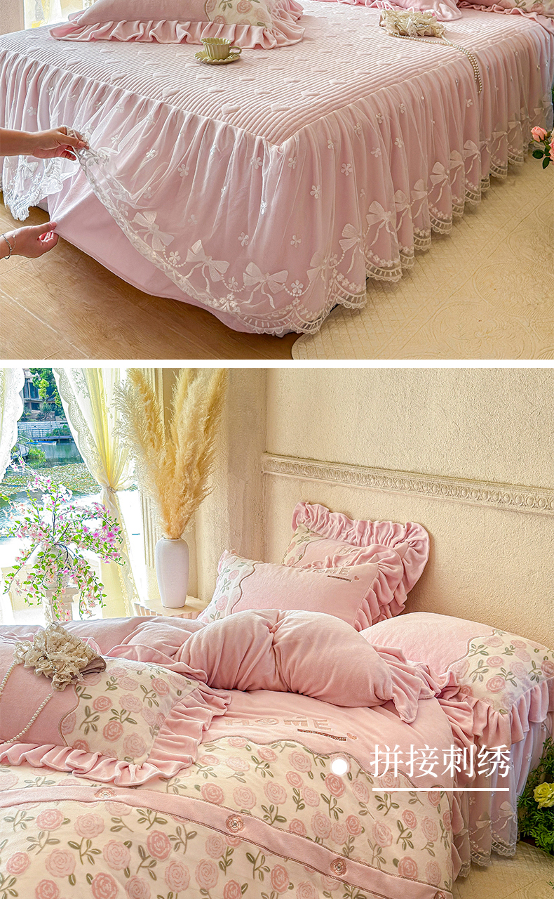 宜凡家纺 2025新款牛奶绒雕花拼接刺绣床裙四件套 花野漫屿