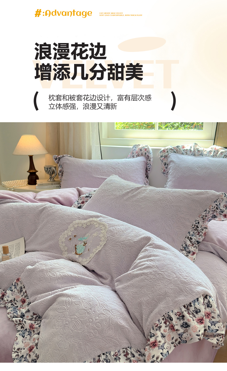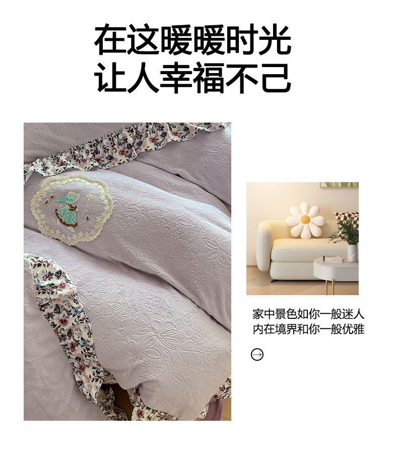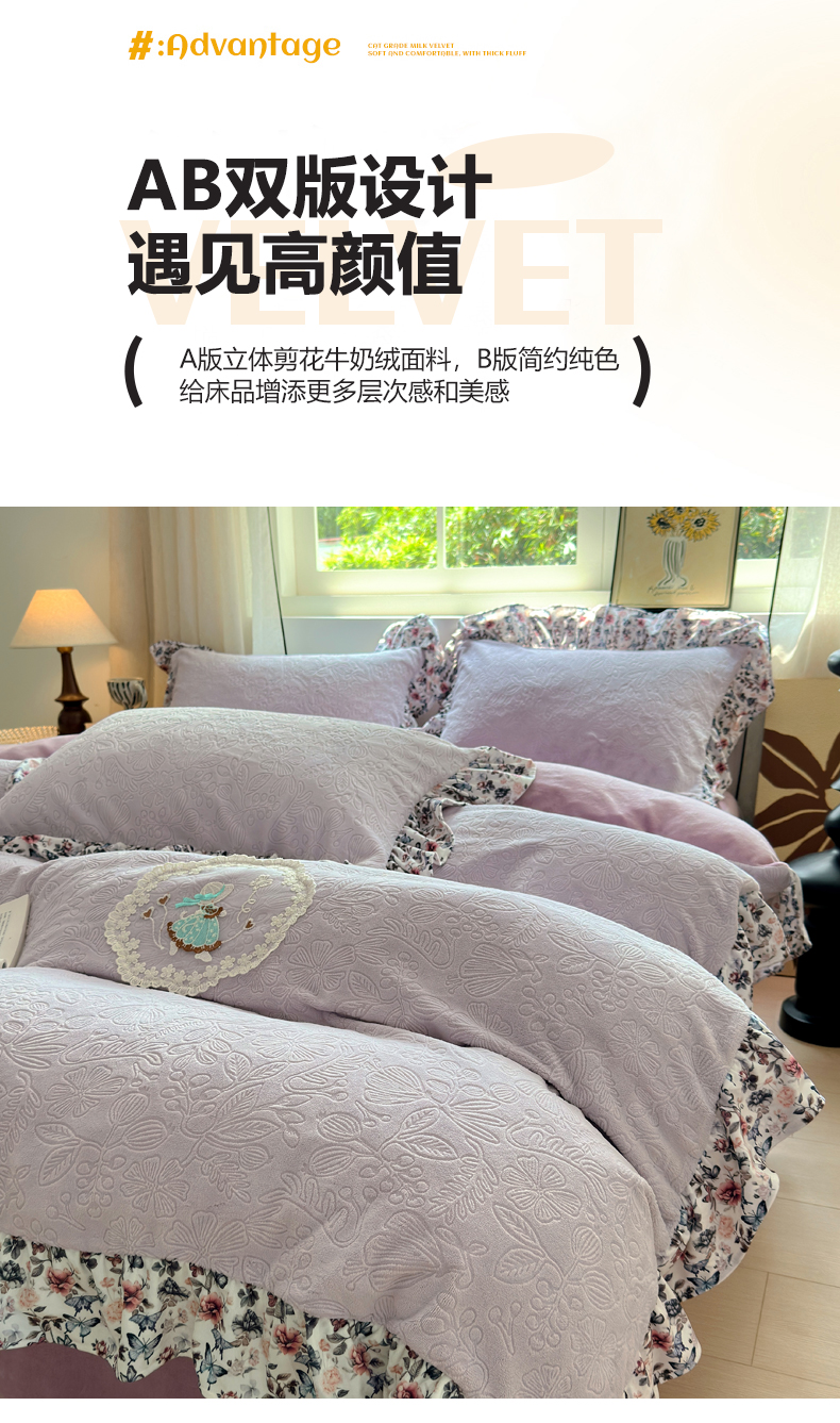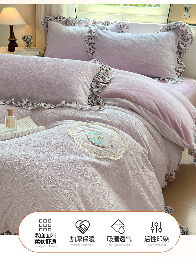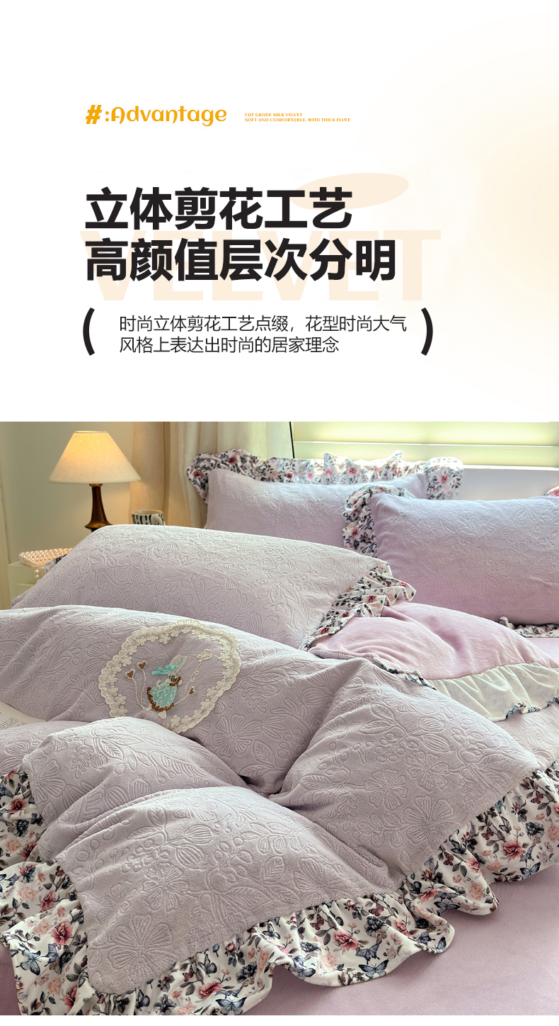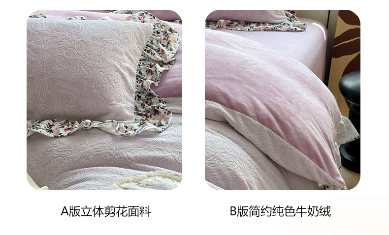 当前位置: 91家纺网 > 商品网购 > 床品套件 > 四件套 > 牛奶绒四件套 > 乐居家纺 2025新款蝴蝶花边款剪花提花牛奶绒四件套(含买家秀和质检报告) 蝴蝶花边款-盛夏-紫